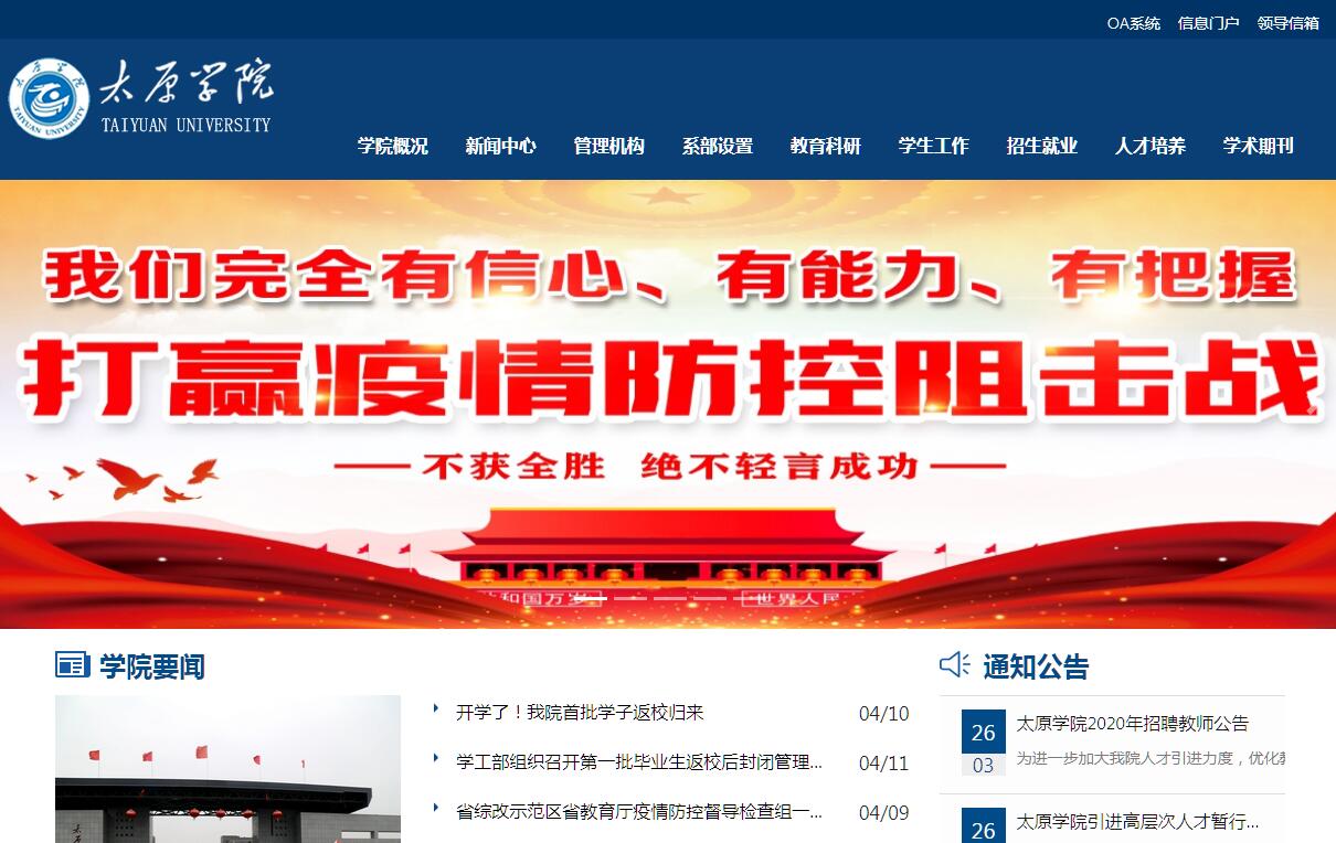 太原学院前身为1984年创建的太原大学,2013年4月经教育部批准,升格为全日制综合类普通本科院校。2014年9月太原大学外语师范学院、太原大学教育学院撤销原建制并入。学院由山西省人民政府领导、太原市人民政府管理、教学工作接受山西省教育厅指导。学院位于太原教育园区中央,与太原经济技术开发区、高新技术开发区、晋中工业区和武宿综合保税区、山西科技创新城相毗邻,是太原市与晋中市“同城化”建设的交汇点和衔接带,区位优势突出。学院基础设施优良,办学条件优越。学院新校区规划用地1828亩,现总占地面积1308亩,由新校区、旧校区、北校区、中校区组成。校舍建筑面积34.06万㎡,教学科研仪器设备总值7135.1万元,馆藏图书125万余册。学院现有教师853人,其中享受国务院特殊津贴专家3名,教授28人,副高级专业技术职称以上的教师271名,博士25人,硕士632人。现有20个系,2个教学部(思政部、大学英语教学部),2个教学中心(计算中心、公共实验中心),其中17个系承担本科教学工作。学院现有66个专业,本科专业28个,专科专业38个(其中招生专业26个),涵盖工学、理学、文学、经济学、管理学、艺术学、农学等多个学科门类。学院面向全国20多个省、市、自治区招生,在校生人数14795名。学院秉承“博学、弘毅、力行、至善”的校训精神,以培养服务地方经济与社会发展的应用型创新人才为目标,以服务城市发展、城市转型、城市提升为契机,积极深化学科专业建设,持续推动综合教育改革,坚持以就业为导向,以服务为宗旨,走产学研结合的道路。开拓创新,锐意进取,在党的建设、教育教学、科技研发、人才培养、科学管理等方面均取得显著成绩。学院重视加强对外交流,合作办学形式日趋多样。现已与美国科罗拉多州立大学、加拿大菲莎河谷大学、台湾义守大学等院校正式签订合作协议,在学生培养、师资交流、学术科研等方面开展广泛的国际合作。未来太原学院将按照现代大学建设标准,进一步加强师资队伍建设、学科专业建设和教学基础设施建设,努力提高教育质量、科研水平和办学效益,围绕服务加快转变经济发展方式这条主线,重点培养厚基础、重应用、强能力、高素质的应用型创新人才,办出特色,办出水平,为省、市经济建设和社会发展作出更大贡献。