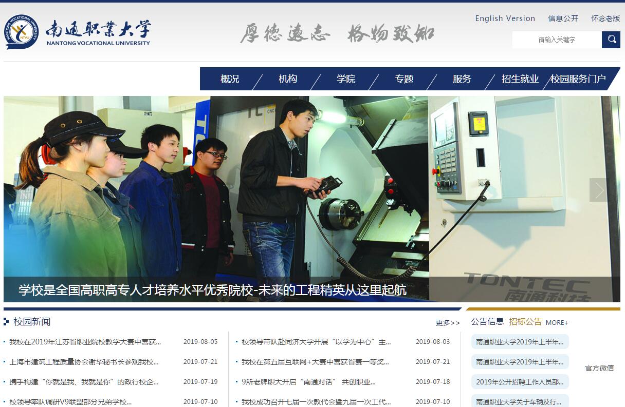 南通职业大学始建于1973年,坐落在江海交汇、紧邻上海、物阜民安、人文荟萃的长三角北翼中心城市——江苏省南通市,是一所经江苏省人民政府批准、教育部备案设置的综合性全日制普通高校,是全国办学历史最长的高等职业院校之一,是全国为数不多涵括学历教育、技工教育、职业培训于一身的职业院校。学校面向江苏、山西、山东、浙江、安徽、江西、河南、广东、广西、四川、贵州、云南、甘肃等13个省份招生,建有南通市区和海门两大校区,设有机械工程、电子信息工程、化学与生物工程、建筑工程、汽车与交通工程、艺术设计、经济管理、国际合作教育(外国语)、技师、海门、继续教育等11个学院,校园总面积1000多亩,建筑面积40多万平方米,现有教职工800多人、各级各类在校生近18000人。办学四十多年来,学校秉承“厚德远志、格物致知”的校训,遵循张謇先生“学必期于用、用必适于地”的教育思想,坚持“根植南通、服务南通”的办学思路,始终把立德树人作为根本任务,深入贯彻落实习近平新时代中国特色社会主义思想和党的十九大精神,努力办好人民满意的高职教育,先后荣获江苏省先进基层党组织、江苏省教育系统创先争优先进集体、江苏省高校思想政治教育工作先进集体等称号。学校是全国高职高专人才培养工作水平优秀院校、江苏省高水平高等职业院校建设单位、江苏省示范性高职院校、江苏省职业教育先进集体、江苏省文明单位、江苏省高校和谐校园、江苏省平安校园。学校是教育部首批现代学徒制试点单位,是教育部《职业院校管理水平提升行动计划》工作委员会主任单位、中国职教学会发展战略研究工作委员会副会长兼秘书长单位。据中国教育大数据研究院报告显示,2017年学校知名度、关注度、认可度、美誉度位于高职院校全国第34位,江苏第4位。学校积极探索现代职业教育体系建设,与3所本科院校、7所中职学校分别合作开展专本“4+0”联合培养、“3+2”分段培养和中高职“3+3”分段培养,架立了中职、专科、本科互联互通,学历教育与技工教育、职业培训交互并行的 “立交桥”。学校还是国家建设行业技能型紧缺人才培养基地、江苏省产业人才培训示范基地、江苏省高等教育人才培养模式创新实验基地。学生技能证书获证率达到99.8%,计算机和英语考试通过率遥遥领先于全省平均水平,在挑战杯、职业院校技能大赛、数学建模大赛、电子设计竞赛等各级各类赛事中成绩优异,毕业设计(论文)连续六年获省一等奖、评优获奖率稳居全省前列。学校专业建设精准对接区域产业发展,形成了“以工为主,文、管、艺并举”的专业格局,现有50多个专业,其中国家级重点专业5个、省政府立项品牌专业1个、省高水平骨干立项专业4个、省重点专业群4个,省品牌(特色)专业9个、省示范建设重点专业(群)4个。学校现拥有国家级职业教育专业教学资源库1个、国家级精品课程2门、国家级精品资源共享课程2门、省级精品课程10门,“十二五”国家规划教材7部、省级精品(重点)教材26部,国家级实训基地4个、省级实验教学示范中心1个;国家级教学成果一等奖1项,省级教学成果特等奖1项、一等奖3项、二等奖6项。学校大力实施“人才强校”战略,着力推进教授、博士“双百工程”,建有一支高素质的“双师型”教师队伍,现有专任教师511名,其中正、副教授比例达到51.58%,青年教师中硕、博士研究生比例达到83.73%,“双师”素质教师占88.93%。现有全国优秀教育工作者3人;全国五一劳模奖章获得者1人、全国技术能手1人、国务院特殊津贴专家1人、省级优秀教学团队3支、省产业教授3人、省级教学名师3人、省有突出贡献的中青年专家1人、江苏工匠1人、省“333工程”培养对象11人、省“青蓝工程”中青年学术带头人和优秀青年骨干教师培养对象26人。学校开创性提出了“专业与产业、课程与岗位、课堂与车间、科研与生产、实习与就业、培训与工种、老师与师傅、校长与厂长”八个对接的理念,深入推进产教融合、校企合作和社会服务。上世纪80年代学校实施的“早期挂钩、定向推荐”模式,被誉为我国校企合作联合培养人才“第一单”。学校是南通建筑产教联盟理事长单位,近年来先后与南通建工、中航高科、罗莱家纺、林洋电子、中兴通讯合作共建南通华夏建筑工程学院、南通科技机械学院、罗莱商学院、林洋电子学院以及中兴通讯互联网学院,与中兴通讯、上汽通用、阿里巴巴、施耐德等知名企业合作建有教育部ICT行业创新基地、教育部上海通用汽车ASEP项目、阿里巴巴数据中心培训学院和施耐德电气南通培训中心,与江山农化、江苏龙信、国核维科、万洲石化等大型企业合作开展“订单式”人才培养,建有国家土建结构预制装配化工程技术研究中心南通分中心、江苏高校人文社会科学校外研究基地培育点、江苏省农药废水处理与资源化技术研发中心、南通市新材料政产学研协作基地、南通市哲学社会科学研究基地“通商研究所”,拥有建筑节能及保温技术、数控机床加工精度、催化技术应用、工业机器人应用、新能源汽车驱动与智能控制技术等5个市级重点实验室,数控技术、建筑工程、精细化工、楼宇弱电、数字化设计与制造技术、无人机应用技术、环境检测等7个市级公共服务平台,90%以上高级职称教师在