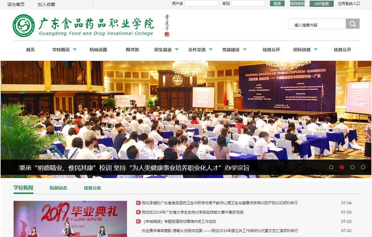 广东食品药品职业学院是经广东省人民政府批准、教育部备案的公办全日制普通高等职业院校,第二批国家现代学徒制试点单位、广东省示范性高职院校建设单位,一流高职院校立项建设单位,广东省大学生创新创业教育示范学校。学院以药品专业群为龙头,食品、化妆品、医疗器械、经管、卫生类协调发展的六大健康专业群共46个专业。其中中央财政支持重点建设专业2个、首批全国职业院校健康服务类示范专业点1个、广东省高等职业教育一类品牌专业1个、广东省高等职业教育二类品牌专业4个、省级示范性专业和重点专业18 个;建设国家精品资源共享课程 7门、省级精品资源共享课程 17门、省级精品开放课程 4 门;立项建设国家级实训基地 3 个、省级实训基地 6个、省级公共实训基地 2 个、省级高技能人才培养基地 2 个,省级大学生校外实践教学基地9个;立项省级教学研究与改革项目30 项,省级大学生创新创业项目46项。学院现有专任教师628人,教授等正高职称45人,副教授等副高及以上职称175人,博士、博士后109人,近75%的专任教师具有硕士及以上学位,具有“双师素质”的教师469人。近三年来,共有234人次受到了院级及以上各类表彰,其中享受国务院特殊津贴专家2人,全国优秀教师1人、珠江学者特聘教授2人,省级教学名师2人、省南粤优秀教师3人、南粤优秀教育工作者3人、省五一劳动奖章获得者1人、广东五四青年奖章获得者1人、省级“千百十工程”培养对象5名。