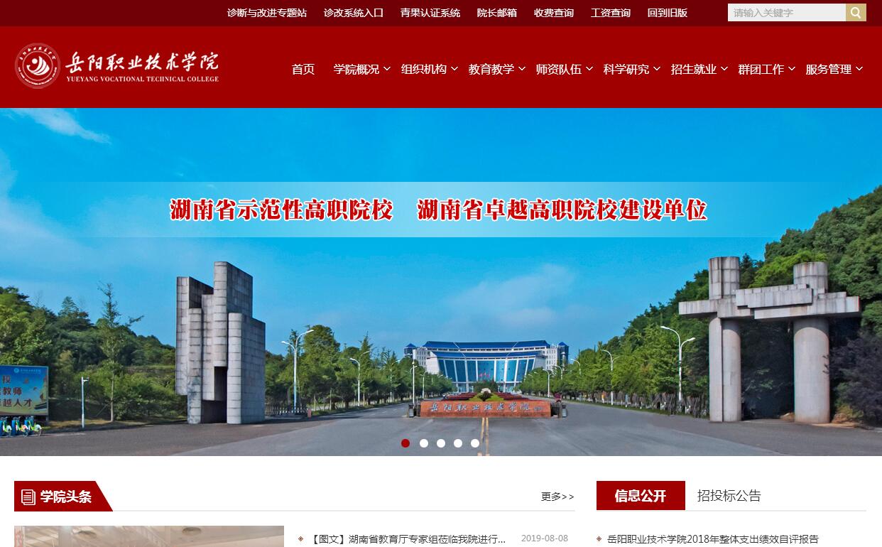 岳阳职业技术学院是岳阳市人民政府主办、湖南省教育厅进行业务管理的一所综合性高等职业院校,2003年4月由原岳阳卫校、岳阳农校、岳阳机电学校和岳阳职工高专四校合并升格组建而成。学院在2006年“全国高职高专人才培养工作水平评估”中荣获优秀等级,2011年通过教育部人才培养工作第二次评估,2012年成为湖南省示范性高职院校,2016年成功立项湖南省卓越高职院校,2019年被湖南省教育厅确定为湖南省职业教育教学管理强校、学生管理强校,跻身湖南高职教育办学综合实力先进行列。学院校园面积1000余亩,建筑面积29.35万平方米,固定资产总值6.9亿元(原值),开设有护理学院、医学院、机电工程学院、商贸物流学院、信息工程学院、生物环境工程学院、国际教育学院等7个二级学院和基础医学部、公共基础部2个公共教学部,开办高职专业27个。学院拥有农科中心、附属医院(岳阳爱康医院)、国泰阳光颐养院(老年护理实训中心)3个二级法人单位,高职教育、老年护理、畜牧兽医、应用技术、张谷英民俗文化5个研究所。全院教职工850多人(其中教授、副教授252人,博士、硕士190人,“双师”素质教师265人),全日制高职在校学生16000余人。自2003年建院以来,学院主动适应区域经济社会发展需求,以“学以致用”为校训,坚持“立德树人、经世致用、质量至上、特色立校”的办学理念,坚持“政府主导、行业参与、学校联动、企业融入”的办学模式,按照“依托产业办专业、办好专业促产业”和“依托行业、对接产业、锁定职业、服务就业”的专业建设思路,专业链深度融入产业链,教学链深度融入服务链,校企一体办学、工学结合育人,已先后培养了各类高技能人才6万余人,毕业生深受用人单位欢迎,就业率保持在95%以上,为经济建设和社会发展提供了有力的人才支撑。 2016~2018年全国技能大赛,我院护理专业参赛学生连续三年夺得一等奖,应用软件专业2016年、2017年先后夺得一、二等奖。2016年5月全国职教宣传活动周期间,新华社、中新社、光明日报、湖南经视等8家中央、省级媒体对学院进行了集中采访和报道。近年来,学院先后获得“全国校园文化建设示范学校”“全国五四红旗团委”“湖南省文明高校”“湖南省平安高校”“湖南省职业技能鉴定工作先进单位”“湖南省职业教育与成人教育先进单位”“湖南科研工作先进单位”“湖南省普通高校就业创业工作‘一把手工程’督查优秀单位”等30多项国家和省级荣誉,已成为中央财政支持的数控技术实训基地、教育部及卫生部等七部委确定的国家技能型紧缺人才培训基地、全国游乐设施产业联盟唯一的人才培养基地、职业院校农民工培训基地、湖南省贫困村创业致富带头人培训基地、湖南省乡村医生本土化培养基地、湖南省企业人才培训示范基地等20多个培训基地,是“湖南省社会科学普及基地”“湖南省教育科学高职人文素质教育研究基地”“2017—2018学年度全省乡村医生本土化人才培养优秀培养学校”“2018年湖南省全国职业院校技能大赛优秀集训基地”和湖南省护理专业技能抽查考核的唯一主考院校。为彰显办学特色、打造发展品牌,学院立足办学优势、聚焦大健康产业,主动融入“健康中国2030”“中国制造2025”,调整专业布局,优化资源配置,集中力量建设老年健康服务、社区健康服务、健康装备制造与维护、健康产业流通服务、健康农业服务、健康信息服务6个专业群,重点建设老年健康服务、社区健康服务、健康装备制造与维护3个特色专业群,形成了以健康服务为主线、具有鲜明特色的专业体系,努力打造健康产业人才培养高地和产业发展助推器。2014年,健康服务专业群立项为湖南省示范性特色专业群,2018年老年健康服务、社区健康服务、健康装备制造与维护等三大重点专业群立项为湖南省高职教育一流特色专业群建设项目,2018年成为国家第三批现代学徒制试点单位。学院突出内涵发展,强化特色发展,注重人本发展,不断提升办学育人水平,培育发展核心竞争力,正朝着建设“省内一流、国内知名、国际合作办学”的卓越学院、“双一流”学院和特色学院、品牌学院的发展目标奋力迈进。