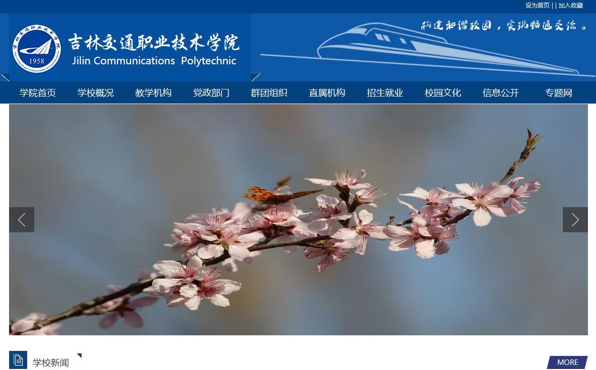 吉林交通职业技术学院始建于1958年,前身为吉林省交通学校,1998年经教育部批准成立吉林交通职业技术学院,是全国第一批、吉林省第一所高等职业技术学院,国家百所骨干高职院校之一。建校60年来,学校坚持“立足交通行业、面向区域经济、服务高教强省”的办学理念,不断深化“产教融合、校企合作”办学模式,形成了办学有企业互动、教师有高尚师德、教学有质量保障、育人有良好氛围的人才培养局面。学校作为吉林省交通类人才的重要培养基地,共培养出各层次应用型高技能人才5万余人,他们大多数成为交通行业的骨干力量,其中有15人获得詹天佑土木工程大奖及国家级设计大师称号,被誉为吉林交通事业的“黄埔”,为区域经济发展做出了重大贡献。学校两次被省政府授予“省职业教育先进单位”称号,2017年评为吉林省现代职业教育改革发展示范学校建设单位、黄炎培职业教育优秀学校奖。现为吉林省高等职业教育教学诊断与改进主任委员单位。学校占地面积22万平方米,现有全日制在校生8000多人,教职员工483人,专任教师274人。专任教师中高级职称比例45.62%,“双师型”教师比例73%,45岁以下具有研究生以上学历的教师比例已达到了95%。省级优秀教学团队8个,长白山学者1人,长白山技能名师17人省,级教学名师2人,交通运输职业教育教学名师1人。学校下设10个学院、2个部和2个校企合作分院共14个教学部门。开设36个专业,建有国家级试点专业2个,省级示范专业8个,国家骨干院校重点建设专业5个,省级品牌专业群5个,专业覆盖道路与桥梁工程、汽车运用工程、轨道工程、物流管理、机械制造等领域,构建了与产业链对接的“道路-车辆-物流-信息”一体化专业链。学校把立德树人作为教育的根本任务,积极推进职业技术素质教育。近5年,学生参加全国、省级技能大赛获各级奖励160余项,参加各类文体比赛获金牌146项。毕业生综合素质得到了用人单位的好评,平均就业率达95%以上。学校加强教学科研工作,获国家、省级优秀教学成果奖12项,其中国家二等奖1项,省特等奖1项、一等奖3项。“寒冷环境交通技术工程研究中心”被省发改委批准为省级工程中心。深化国际交流合作,先后与英国、韩国、德国等大学和科研单位建立了友好往来与合作关系。站在新的历史起点,学校将坚持“以立德树人为根本,以提高人才培养质量为核心,以服务地方社会经济事业发展为使命”,不断强化内涵和外延建设,不断提升办学规模、质量、效益,为把学校建设成为政府满意、社会满意、家长满意、学生满意和教职工满意的特色鲜明、国内一流幸福交职院而努力!