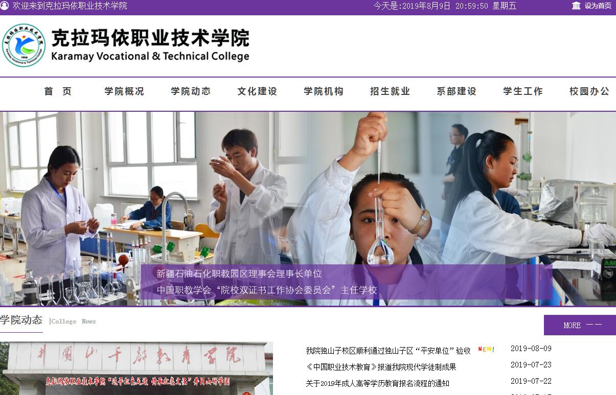 克拉玛依职业技术学院是一所以工科为主、工文兼备的国家普通高等职业院校,面向全国招生。学院创建于1956年,伴随着祖国石油石化产业及西部大开发而不断发展壮大。建校63年来已培养五万余名服务于石油石化产业及地方经济建设的专业技术和管理人才。学院是国家示范性高等职业院校、新疆石油石化职教园区理事长单位、新疆工业企业职教联盟副理事长单位。2012年被确定为教育部首批“教育信息化试点单位”;2014年被中国石油和化学工业联合会、中国化工教育协会授予“石油和化工行业职业教育与培训全国示范性实训基地”;2017年成为全国第二批“现代学徒制”试点单位以及新疆高职教育和本科联合培养试点单位、新疆职业教育师资培训基地;2018年被确立为新疆优质高等职业院校建设立项单位。目前,学院专科全日制在校生7200余人,本科函授300余人;年培训企业员工1060余人次。学院在克拉玛依和独山子两个校区办学。克拉玛依校区校园规划占地面积7200亩,投入资金53亿元,建筑面积64.5万平方米。按照“人文、生态、数字、和谐”的理念,已建成校园基本网络、视频监视系统、综合管理平台、校园“一卡通”系统、综合教务系统和学院网站。目前石油工程系、信息工程系、基础教学部、机械工程系(汽车专业除外)、电子与电气工程系、经济管理系6个系部在克拉玛依校区办学。独山子校区占地1284亩,建筑面积27.8万平方米,固定资产3.44亿元,教学实验实训设备资产9758.04万元,图书馆15000平方米,藏书36.05万册,电子图书1174432册,教学、办公完全实现网络化。学院教学、生活、文化、体育设施一应俱全。目前石油化学工程系和汽车专业在独山子校区办学。学院现有教职员工480人,专任教师294人。教师队伍中,自治区教学名师5人,自治区教学能手3人,自治区优秀教学团队6个。市级专家2人、学科带头人2人、骨干教师18人。学院成立克拉玛依俄语培训中心,并与新西伯利亚大学、阿塞拜疆国立石油大学建立了合作关系。为适应新疆区域经济社会发展,服务丝绸之路经济带核心区建设和克拉玛依城市科学转型,根据自治区产业结构调整和克拉玛依市打造北疆区域中心城市的需要,与新疆石油石化产业、智能制造业、信息产业深度融合,形成了以石油石化上、中、下游产业链为主线、多种专业类型并举的办学特色。学院开设有石油化工生产技术等八大类33个专业,其中国家示范建设专业5个,国家中央财政支持实训基地建设3个,中央财政支持提升专业服务产业发展能力项目 2个,自治区特色专业6个,自治区级专业服务提升项目1个,全国第二批“现代学徒制”试点专业3个,自治区职业教育师资培训基地专业3个,自治区“4+0”模式专本衔接专业1个,“3+2”模式专本衔接专业1个。学院实验、实训设施先进齐全,建有124个校内实训基地,实验、实训室;同时建有94个校外实习实训基地,满足学生技能培训的需求。学院立足新疆、面向西部和中亚地区,近3年就业率保持在96%以上。