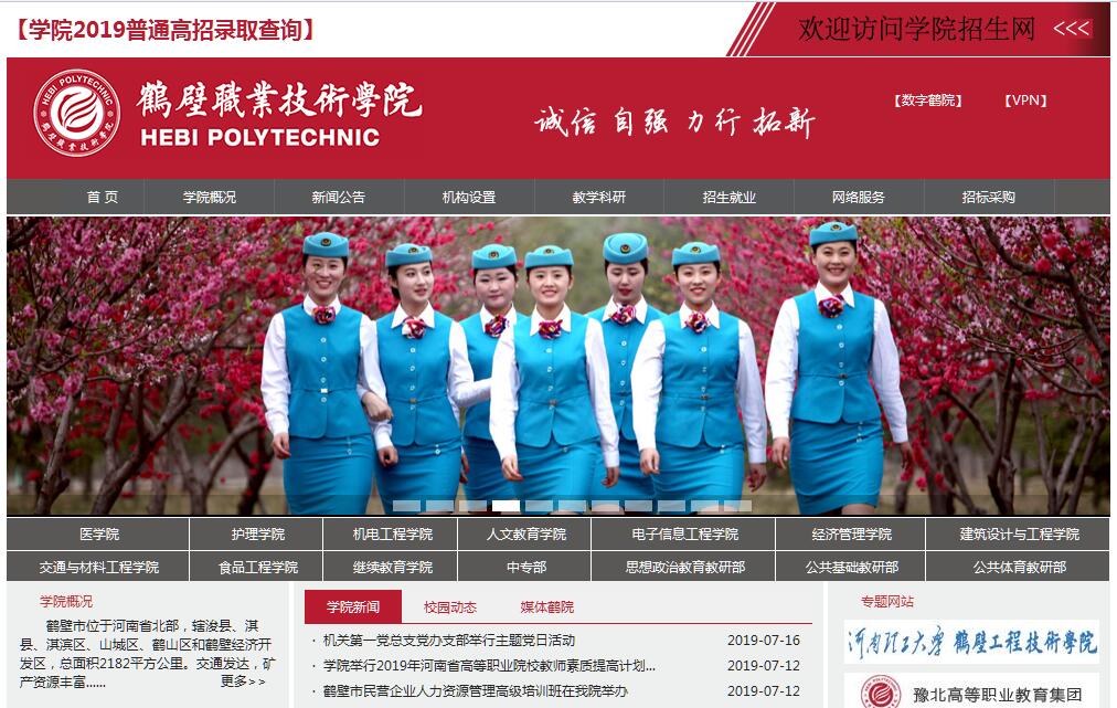鹤壁位于河南省北部,1957年建市,面积2182平方公里,辖浚县、淇县、淇滨区、山城区、鹤山区5个行政区和1个国家级经济技术开发区、1个省级城乡一体化示范区、1个国家级循环经济产业集聚区,人口164万,因相传“仙鹤栖于南山峭壁”而得名,因最早发现并开采煤炭资源而出名,又因北方地区流经城市唯一没有受到工业污染的河流——淇河及淇河文化而扬名。鹤壁是一座生态文明之城。自然风光秀丽,是中国优秀旅游城市、国家森林城市、中国人居环境范例奖城市,有“中国诗河”之称的淇河在鹤壁境内蜿蜒83公里,《诗经》305首诗作品中有39首描写其秀美风光和风土人情,淇河水质常年保持国家二类以上标准,森林覆盖率、城市绿地率、空气质量优良率、饮用水水源地水质达标率等生态环保指标位居全省前列。文化底蕴深厚,境内有坐落在大伾山上的全国最早、北方最大的北魏大石佛,有延续1600多年历史、被称为“中华第一古庙会”的浚县正月古庙会,有鬼谷子王禅隐居授徒、著书立说的云梦山“中华第一古军校”等。鹤壁是一座活力特色之城。清洁能源与新材料、绿色食品、汽车零部件与电子电器、镁精深加工、现代家居等“3+2”工业蓬勃发展,休闲旅游、新型物流、网络经济、文化创意、健康养老等“2+3”服务业加速壮大,农业现代化综合指数全省第一。创业创新氛围浓厚,拥有国家节能减排财政政策综合示范市、全国海绵城市建设试点市、国家新型城镇化综合试点市、全国创新驱动示范市等“国字号”名片超过50个。鹤壁是一座幸福和谐之城。连续三届被评为全国社会治安综合治理优秀市,是全国法治城市创建先进单位、全国法治宣传教育先进城市,公众法治环境满意度连续三年全省第一,公众安全感保持全省前列,在《中国城市竞争力报告》中我市群众幸福感指数居全国第7位。经济社会的快速发展,对高素质、高技能人才提出了持续、旺盛的需求,为高等职业技术教育奠定了坚实的基础。鹤壁职业技术学院伴随着这座城市的成长,在这片热土、沃土上应运而生。2001年4月23日,经河南省人民政府批准,教育部备案,由鹤壁教育学院、鹤壁中等专业学校、鹤壁广播电视大学、鹤壁师范学校四校合并组建成立了鹤壁职业技术学院。2003年,鹤壁机电中等专业学校、鹤壁市成人培训学校并入学院。2010年,获批建设河南省示范性软件职业技术学院。2011年,接管市体育运动学校。2015年,鹤壁市人民政府与河南理工大学依托鹤壁职业技术学院建立河南理工大学鹤壁工程技术学院(本科)。一所涵盖医药卫生、装备制造、电子信息、土木建筑、文化艺术、食品药品与粮食、新闻传播、教育与体育、财经商贸、旅游、交通运输、能源动力与材料等多个专业大类的综合性公办高等职业技术院校像一颗璀璨的明珠镶嵌在鹤城大地。学院占地面积1306亩,建筑面积47.3万平方米。学院建有集教学、科研、培训、考证等功能于一体的校内实验实训中心(基地)29个,校外实习实训基地210个,附属医院1个。其中,中央财政支持的实训基地2个(电工电子、数控技术),省级示范性综合实训基地1个(鹤壁市人民医院-医护专业实训基地),省级示范性实训基地7个(护理、模具设计与制造、建筑工程技术、医学技术、汽车检测与维修实训基地)。建有“千鹤之舞”体育馆、温泉游泳馆、图书馆。现有固定资产总值5.6亿元,教学、科研仪器设备总值1.07亿元,馆藏图书113万余册,电子图书2300G。学院现设有医学院、护理学院、机电工程学院、人文教育学院、电子信息工程学院、经济管理学院、建筑设计与工程学院、交通与材料工程学院、食品工程学院、继续教育学院(鹤壁广播电视大学)、中专部、思想政治教育教研部、公共体育教研部、公共基础教研部。现开设有47个专业,全日制在校生人数2万人,各类社会技能培训年均1万余人次。现有教职工863人,专任教师778人,高级职称教师283人,教授38人,具有研究生学历或硕士学位的教师385人,“双师型”教师386人,全国优秀教师6人,河南省学术技术带头人18人。建有教育部财政部等六部委确定的国家级紧缺人才培养基地2个、中央财政支持高等职业学校提升专业服务产业发展能力重点建设专业2个、省级高等学校综合改革试点专业5个、省级教学改革试点专业3个、省级特色专业6个,省级优秀教学团队3个,省级精品课程5门、省级精品资源共享课4门、国家教指委精品课程8门,河南省全民技能振兴工程项目高技能人才培养基地1项。中国科学院院士赵玉芬教授,全国职教师资专业委员会主任、原天津工程师范学院党委书记王宪成教授,广东轻工职业学院院长叶小明教授,顺德职业技术学院院长夏伟教授任学院名誉院长。经过十余年的建设发展,学院办学水平显著提升,各项事业取得了跨越式发展。学院是“河南省骨干高职院校建设项目”“河南省职业教育品牌示范院校”“河南省高技能人才培养示范基地”立项建设单位,“河南省豫北高等职业教育集团”牵头单位。学院分别于2006年、2010年以优异成绩通过了高职高专人才培养工作水平评估。连续多年在全国高职院校技能大赛均获得好名次,累计获得国家级奖项一等奖3项、二等奖8项、三等奖16项,省级奖项101项。学院先后荣获“河南省职业教育先进单位”“河南省职业教育教学研究工作先进单位”“河