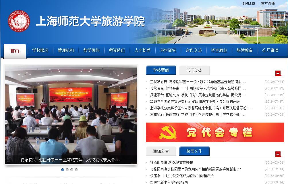 上海旅游高等专科学校创建于1979年,时名为“上海旅行游览专科学校”,隶属上海市外办。1980年,教育部批准更名为“上海旅游专科学校”。1983年,划归上海市旅游局、高教局双重领导。1986年,划归国家旅游局领导。1992年,更名为“上海旅游高等专科学校”。2000年,划归上海市教委领导。上海师范大学旅游学院前身:1954年建立地理科;1956年建立地理系;1958年因中学教学减少地理课的内容,地理系改为地理科;1962年又改为地理系;1963年撤销停办;1984年恢复地理系建制;1997年并入生环学院;1998年从生环学院分出。1987年,在地理系的基础上,设立旅游管理专业,在上海乃至全国率先招收旅游师资班;1989年,首招“涉外导游与旅游管理”班;1998年,从生环学院分出,建立旅游系。1998年,地理系、旅游系、环境保护研究室组建上海师范大学城市与旅游学院。2003年,上海旅游高等专科学校划归上海师范大学管理,与原上海师范大学城市与旅游学院合并组成上海师范大学旅游学院,上海旅游高等专科学校是法人单位。2011年,学校通过教育部和财政部国家示范性高职院校建设计划的验收,成为全国唯一一所旅游类国家示范性高职院校。学校设有学校办公室、纪检监察审计办公室、组织人事处、教务处、学生处、团委、科研与研究生处、设备处、资产处、财务处、工会、国际交流学院(含外办)、继续教育学院、图书馆、休闲实训中心等党政机构及直属单位。拥有旅游与休闲管理学院、酒店与烹饪学院、会展与经济管理学院、旅游外语学院、公共教学部等5个二级教学机构。学校教职工总数347人,专任教师183人,其中教授21人、副教授65人;博士生导师3人(另有6名外聘博士生导师)、硕士生导师32人(另有6名外聘硕士生导师);具有博士、硕士学位的教师243人,硕博总数占70%,其中具有博士学位的教师66人;双师型教师107人。现有国家级教学名师1人,上海市教学名师3人,海外名师1人。目前列入旅游业青年专家计划3人,列入“万名旅游英才计划”之“双师型教师培养项目”14人,在国家旅游局挂职3人,出国访学29人,列入上海市教委教师专业发展工程“国外访学进修计划”26人,“国内访学计划”6人,“产学研践习计划”19人。2017年,学校人才队伍建设工程“五大计划”项目共20项入选,包括“雏鹰计划”项目6项、“攀登计划”项目6项、“灯塔计划”3项、“星光计划”项目2项、“腾飞计划”3项。近三年来,学校(院)组建了一支140余人的兼职教师队伍。学校现有全日制本专科学生4965人(本科生1508人,专科生3457人),研究生251人(博士生25人,硕士生203人),夜大学学生226人,外国留学生55人。2015年,研究生就业率为92.8%,本科生就业率约为96.31%,专科生就业率约为93.33%。建校30多年来,学校培养了5万余名各级各类人才,有三分之二毕业生稳定在旅游行业,并有相当一部分毕业生担当着引领大旅游业发展的重要角色。近五年来,学校获上海市教学名师奖3项;获上海市级精品课程5项;获上海市教育委员会重点课程建设立项13项;获上海市高校优秀教材奖2项;获普通高等教育“十二五”国家级规划教材和编写出版教材13项;获市级以上教学科研与重大建设项目14项;获特色实验室建设项目13项。以国家示范项目建设为契机,获教育部、财政部第六批高等学校特色专业建设点——旅游管理专业,依次顺利通过酒店管理、会展经济与管理本科专业检查与评估。创新教学新模式,自2013年来,开展年度“实践教学周”系列活动,丰富学生校内校外实习实践。学校拥有环境科学二级学科博士点1个、工商管理一级学科硕士点1个(下设旅游管理、工商管理、企业管理二级学科硕士点3个)、旅游管理(MTA)专业硕士点1个。设有旅游管理、会展经济与管理和酒店管理3个本科专业;酒店管理、旅游管理、休闲服务与管理、会展策划与管理、会计、电子商务、旅游英语、旅游日语、应用韩语、应用西班牙语、烹饪工艺与营养、西餐工艺和餐饮管理与服务13个专科专业。现有上海市高峰高原计划(工商管理高原学科)1项。近五年来,学校教师共承担科研项目128项。其中,国家级项目25项,总经费为795.8万元,包括国家自然基金19项、国家社科基金5项、863子课题1项;省部级项目36项,总经费为435.5万元,包括教育部人文社科项目2项、上海市自然科学基金项目2项、上海市哲学社会科学规划课题项目2项、上海市决策咨询项目7项、国家旅游局项目7项、上海市“晨光计划”项目5项以及其他各类省部级项目18项;企事业委托项目60项,总经费为1350.06万元,项目为上海市、浙江省、江苏省、安徽省、河北省、海南省、四川省、内蒙古自治区、西藏自治区等多地政府、企事业单位服务。学校教师发表学术论文260余篇,其中发表在北大中文核心、CSSCI核心期刊的论文154篇,SCI、SSCI 11篇,EI检索22篇,人大报刊复印资料转载3篇,其他外文论文(英语、日语、法语)28篇。论文主要在《Science》、《Climatic Change》、《Geomorphology》、《Forest Ecology and Management》、《Forestry》、《Annals of Glaciology》、《Journal of Glaciology》、《Science in China》、《International Journal of Geographical Information Science》、《中国科学》、《科学通报》、《地理学报》、《生态学报》、《海洋学报》、《地理研究》、《地理科学》、《人文地理》、《经济地理》《旅游学刊》《旅游科学》等国内外系列重要期