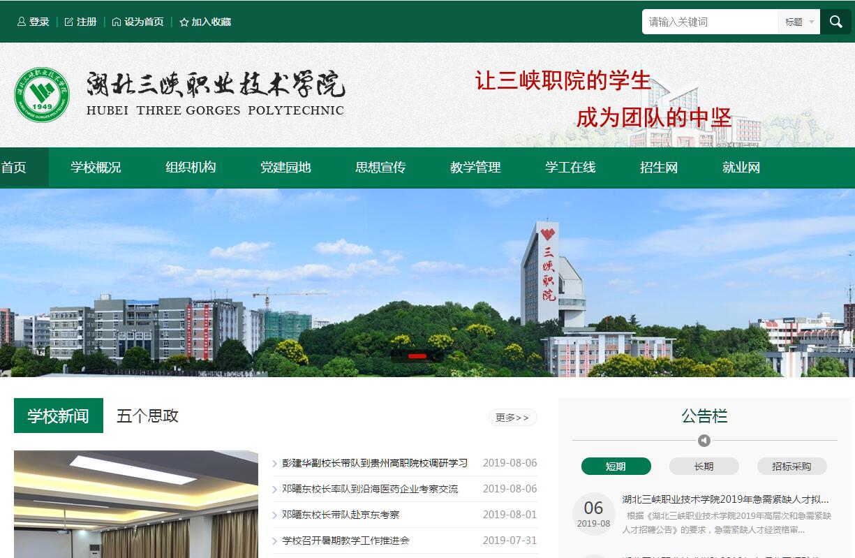 湖北三峡职业技术学院是经省政府批准、教育部备案,于2002年由宜昌市政府举办的全日制普通高等学校。办学历史上溯到1949年8月成立的宜昌专署财经学校。学校践行“正则、修能、追远”的校训精神,秉承“励学善思,崇尚团队,以人为本,融合社会”的办学理念,坚持“人才强校、质量立校、特色兴校、依法治校”发展战略,依托湖北省省域副中心城市宜昌大城建设,立足三峡,面向全国,始终致力于培养“人文素养、专业精神、实践技能”并重的高素质高技能人才,“校企融合、开放育人、服务地方”的办学特色突出。地理位置优越。学校位于宜昌市体育场路31号,南临长江,东接三国古战场,西连三峡大坝、屈原和昭君故里,坐拥CBD购物中心、万达广场、水悦城、金东山大市场和月星国际城五大商圈的中心,是宜昌市中心城区核心地段,与宜昌市委、市教育局、市民政局毗邻。办学条件优良。学校占地面积1317亩,建筑面积44万平方米,固定资产原值9亿元,图书馆纸质藏书61.94万册,教学仪器设备总值1.04亿元。建有160个校内实训室及实训基地、300多个校外实训基地,拥有4个国家级职业教育实训基地、3个省级实训基地、3个市级重点实验室。师资力量雄厚。学校现有教职工804人,其中,教授、副教授336人,具有博士、硕士学位教师237人。享受国务院特殊津贴专家2人,湖北省农技110专家3人,湖北名师、楚天技能名师34人,省、校级教学科研团队20多个。专业优势明显。学校现设有交通工程学院、经济管理学院、机电工程学院、电子信息学院、旅游与教育学院、农学院、医学院、马克思主义学院、基础课部、中专部等10个二级教学单位,开设有涉及土木建筑、装备制造、生物化工、农林牧渔、食品药品、交通运输、电子信息、医药卫生、财经商贸、文化艺术、旅游、教育等12大类50个专业,2018年招生专业42个。拥有1个国家示范专业,2个教育部财政部“高等职业学校提升专业服务产业发展能力项目”专业、2个省级品牌专业,3个省级特色专业、6个省级重点专业、3个“湖北省战略性新兴(支柱)产业人才培养计划项目”专业。建成4门国家级精品课程和精品资源共享课程、7门省级精品课程。人文体系健全。学校坚持立德树人,以社会主义核心价值观为引领,以健全的人文素质教育体系为载体,加强大学生人文素质修养。打造了思想道德教育、心理健康教育、就业创业教育、国防安全教育、社会实践教育等五大平台。建设了思想道德教育教学、心理健康教育教学、就业创业教育教学、社会实践教育教学、国防安全教育教学、学生自我育人管理等六支队伍。建立了“三职好人榜”、“三职楷模榜”、“三职正能量典型”等三个数据库。建有学习型、专业型、兴趣型和社会服务型的学生社团59个,深入扎实开展学生社团活动和社会志愿服务活动。社会效益显著。学校以“校企融合,开放育人,服务地方”的鲜明办学特色,为地方经济和社会发展提供创新型高素质高技能人才和广泛的技术服务。近五年来,学生在全国、全省技能大赛中共有400余人次分获一、二、三等奖,学校综合成绩在全省高职院校中连续名列第三、第四。现已累计向社会培养输送全日制高职毕业生36000多人,毕业生就业率保持在95%以上,受到社会良好赞誉。学校发挥人才技术优势,围绕区域支柱产业和全面建成小康社会,开展社会服务。近三年来,申报立项解决生产实际问题的科研课题40多项,15项研究成果通过鉴定达到国内领先水平,10多项成果得到社会认可并在各地转化推广。面向社会开展职业技能培训与鉴定,年均培训量达20万(人•天)。在全省率先成立首家职业农民学院,以“五好模式”和“十点经验”开展农民创业培训,现已培训了新型职业农民4000多人。投入200万元用于五峰土家族自治县苏家河村精准扶贫,发展猕猴桃、羊肚菌、中草药等产业,开展医疗扶贫和助学扶贫,取得良好成效。办学成绩突出。学校现已建设成为“教育部卫生部卫生职业教育改革先进院校”、“全国农业职业技术教育培训示范基地”、“全国高等职业院校服务贡献50强”、“毕业生就业力全国50强”、“湖北省示范性高等职业院校”、“湖北省职业教育先进单位”、“湖北省省级文明单位”、“湖北省食品卫生A级单位”、“湖北省高校标准化学生公寓建设单位”、“湖北省平安校园”、“湖北省园林式学校”、“湖北省大学生思想政治教育先进单位”、“湖北省高等学校校园文化建设优秀单位”、“湖北省高校家庭经济困难学生资助工作先进单位”、“湖北省心理健康教育示范基地”。“既滋兰之九畹兮,又树蕙之百亩。”学校坚持全面深化改革,不断提高办学质量,办人民满意的教育,为中国特色社会主义事业培养合格的建设者和可靠的接班人。