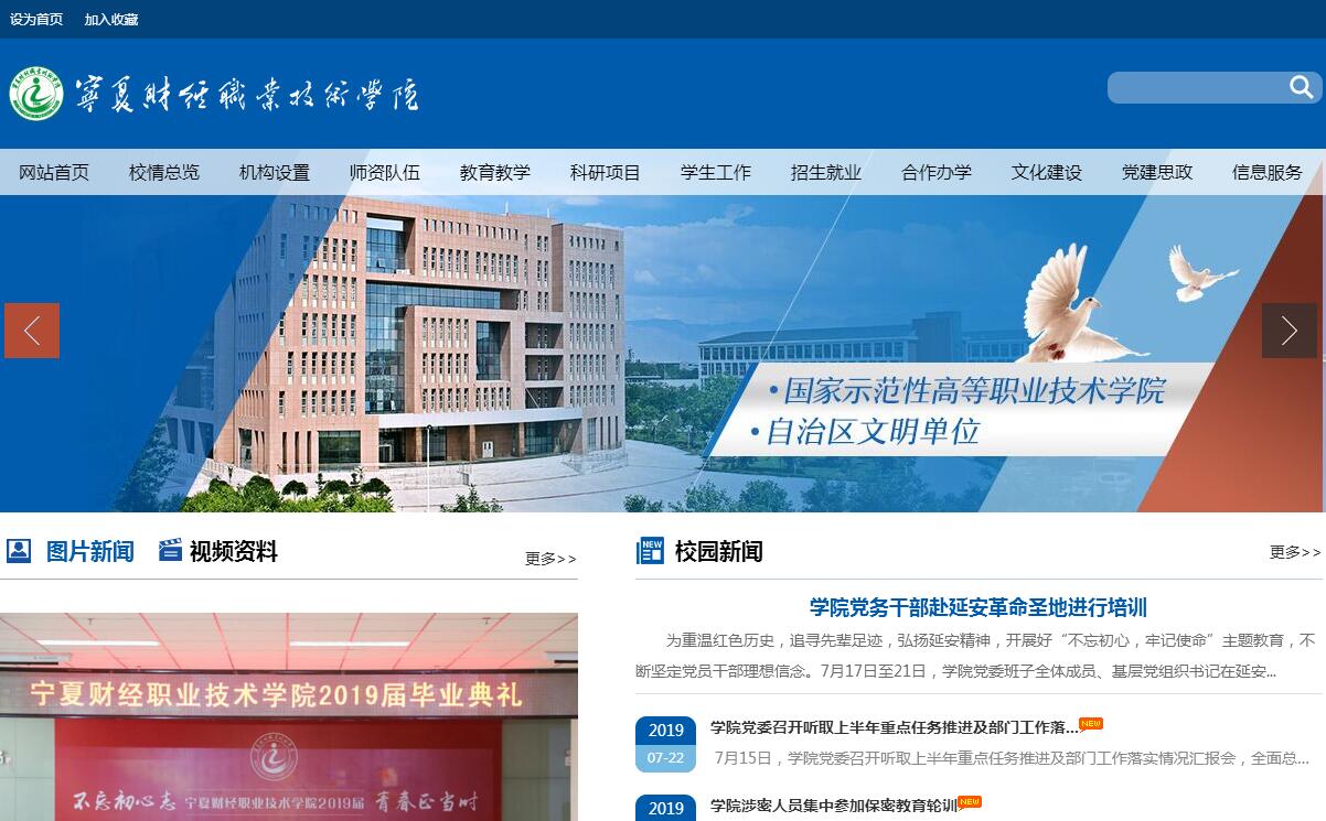 宁夏财经职业技术学院始建于1958年,隶属于自治区教育厅,是国家示范性高等职业院校,宁夏现代服务业职业教育集团理事长单位,教育部第二批现代学徒制试点单位,全国职业院校数字校园实验示范校项目院校,自治区优质专科高等职业院校建设单位,自治区“互联网+教育”试点学校,自治区“三全育人”综合改革试点高校。学院位于宁夏首府银川市,占地面积577亩,校舍建筑面积10.27万平方米。建有宁夏现代商贸职业技能公共实训中心1个,跨专业实训平台1个,多功能专业研修室9个,校内实训室34个,拥有校内实训工位2018个。校外实习实训基地138个。图书馆藏书近40万册。学院在编教职工252人,其中,专任教师153人,教授22人,副教授67人;博士2人,硕士138人;双师型教师83人。自治区教学团队8个,自治区教学名师4人,自治区高端会计人才6人。院级教学名师4人,专业(学科)带头人15人,骨干教师8人。学院设会计系、金融系、经济贸易系、信息与智能工程系、外语外贸系、通识教育教学部、马克思主义教学科研部、信息中心(实训中心)、督导中心、校企合作中心、图书馆等11个教学教辅机构。设招生专业及方向25个,涵盖财经商贸、电子信息、土木建筑、教育与体育、文化艺术等5个专业大类,形成会计、金融、市场营销、物业管理、计算机、应用英语6大专业群,其中,市场营销、物业管理是国家示范专业;会计、金融管理与实务、计算机应用技术、广告设计与制作等是自治区骨干示范专业。学院积极推进招生制度改革,试行普通高考招生、分类考试和自主招生并举的考试招生制度。毕业生就业率连续三年稳定在98%以上,就业质量在同类院校位居前列。学院主动服务“一带一路”建设,积极开展对外交流与国际化办学,先后与澳大利亚、新西兰、德国、马来西亚等国的职业院校签署了合作框架协议。加强与国内财经商贸类高职院校的合作,与北京、天津、浙江、山西、陕西、江苏、广东等地的高职院校建立了校际合作关系。学院先后获得“自治区文明单位”“全国毕业生就业工作先进集体”“全国节约型公共机构示范单位”“自治区招生管理工作先进集体”“自治区高校党建和大学生思想政治教育工作先进单位”“自治区教育系统培育和践行社会主义核心价值观校园文化建设示范单位”“自治区教育系统民主管理示范学校”“师德建设先进集体”“自治区政务公开先进集体”“自治区基层党的建设先进单位”“自治区平安校园”等荣誉。