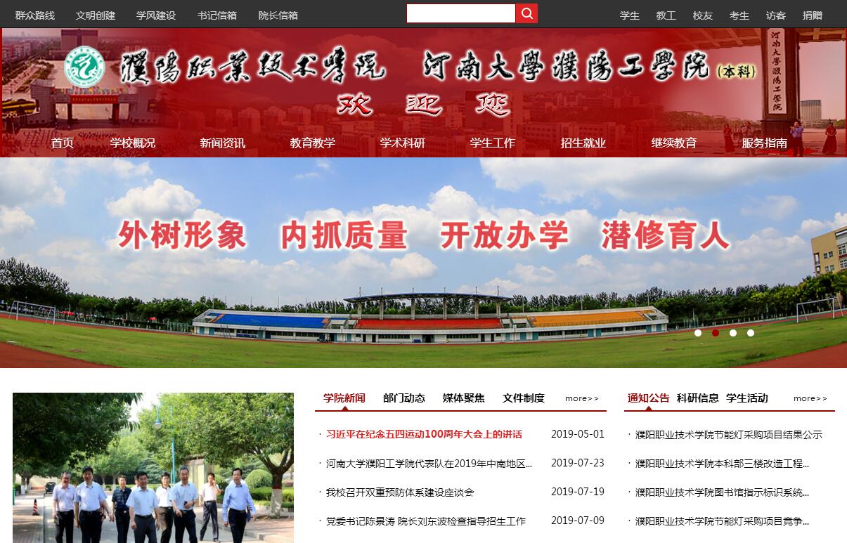 濮阳职业技术学院(Puyang Vocational and Technical College),位于中国国家历史文化名城、国家文明城市、卫生城市、园林城市、优秀旅游城市——河南省濮阳市,是一所具有70年办学历史的普通全日制高等学校。学校前身是1950年的省立濮阳师范学校,80年代初期的濮阳工业学校、濮阳广播电视大学、濮阳教育学院。2001年4月,经河南省人民政府批准、国家教育部备案,四校合并组建濮阳职业技术学院。2015年4月,濮阳市人民政府依托濮阳职业技术学院与河南大学联合举办河南大学濮阳工学院(Puyang Institute of Technology, Henan University)。学校办学历史悠久、成就卓越,为社会培养了数以万计的优秀人才。学校占地1162亩,建筑面积46万平方米,固定资产总值8.5亿元。教学设施完善,各种教学仪器设备总价值1.1亿元;馆藏纸质、电子图书合计164万册;校内外实习实训基地233个,国家级示范性实训基地2个,省级示范性实训基地6个,省级工程研究中心2个,市级重点实验室6个;教学楼13栋、学生宿舍楼15栋、教师公寓14栋,另有图书馆、学生餐厅、综合实训楼、室内体育馆等基础设施。学校师资力量雄厚,现有教职工1066人,其中专任教师952人、教授65人、副教授264人,博士14人,硕士393人;享受国务院特殊津贴专家、省级教学名师、省管优秀专家、省职教专家、省级特级教师、省级骨干教师22人,省市级学术技术带头人、拔尖人才53人。现有各类在校学生30832人,其中,普通本科543人、专科14436人,电大开放教育和成人教育本专科6981人,设有附属中学6420人。目前,学校设有人文学院、教育科学学院、外语与旅游学院、体育健康学院、数学与信息工程学院、艺术学院、能源与化学工程学院、机电与汽车工程学院、生物与食品工程学院、经济管理学院、建筑工程学院、阿里云大数据应用学院等12个二级学院,开设58个专业,建成国家级重点专业2个,省级优秀教学团队2个,省级特色专业和综合改革试点专业15个,省级精品课程17门。河南大学濮阳工学院开设化学工程与工艺、土木工程、电子信息科学与技术、软件工程等4个本科一批专业。近年来,荣获省部级以上科研奖励100余项,600多名参赛学生荣获全国、全省职业技能大赛二等以上奖励。学校在教育部高职高专院校人才培养工作水平评估中被评为“优秀院校”,先后荣获河南省优质高等职业院校、河南省职业教育品牌示范院校、省级文明单位、河南省骨干高职院校、教育部人才培养工作水平评估优秀院校、河南省普通大中专毕业生就业工作先进单位、河南省诚信规范招生示范院校、改革开放40周年具有国内影响力河南高校、全省教育信息工作先进单位、河南省最具影响力的十佳职业学院、全民技能振兴工程高技能人才培养基地、河南省职业教育攻坚工作先进单位、河南省最具就业竞争力职业院校等多项荣誉称号,已发展成为一所办学设施完善、功能齐全、特色鲜明的现代化高校。桃李经年呈馨瑞,栋梁化育柱长天。濮阳职业技术学院、河南大学濮阳工学院传承“笃学明理、诚信力行”校训,涵育“圣洁惊艳、无私奉献”樱花气节,弘扬“敢为人先、勇往直前”火车头精神,践行“团结拼搏、开拓创新、迎难而上、勇于奉献”学校精神,坚持立德树人,深化内涵发展,加快转轨变型,把学校建设成为安定团结的模范之地!