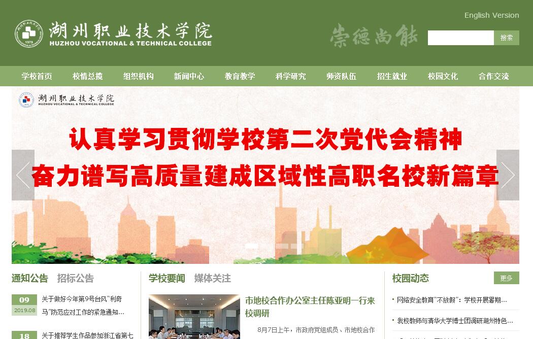 湖州职业技术学院是一所经浙江省人民政府批准成立的公办全日制高职院校。学校位于沪杭宁中心腹地、国家历史文化名城、全国生态文明先行示范区——浙江湖州。学校前身为1979年创建的嘉兴供销技工学校、嘉兴粮食技工学校、浙江电大嘉兴分校,2002年升格为湖州职业技术学院。建校以来,学校坚持社会主义办学方向,全面贯彻党的教育方针,秉承“崇德尚能”校训,落实立德树人根本任务,以办人民满意的高职教育为愿景,以建设区域性高职名校为目标,围绕“深化改革、转型发展、服务地方”工作主线, 形成了“育人为本、德育为先、能力为重、全面发展”的育人观,“做足总量、优化结构、提升素质”的人才观,“做实基础、狠抓常规、补齐短板、强化特色”的教学观和强化 “五个起来”的党建工作特色,形成了“做强高职教育、做大开放教育、做特农民教育、做活社区教育”的“四位一体”办学特色。学校先后被评为教育部高职高专人才培养工作优秀学校、全国精神文明建设先进单位、全国普通高等学校毕业生就业工作先进集体、浙江省示范性高职院校、浙江省平安校园、浙江省普通高校示范性创业学院。学校(本部)占地601亩,建筑面积20万余平方米,校园建设具有典型的江南地域特色和人文气息。学校下设建筑工程学院、机电与汽车工程学院、物流与信息工程学院、商贸与经济管理学院、旅游与公共管理学院、艺术设计学院、继续教育学院等7个二级学院,全日制在校学生9000人。现有教职工559人,其中高级职称136人,“双师素质”教师322人,硕博士教师355人,学校拥有国家级教学团队1个,省151人才5人、省教学名师3人、湖州市1112人才39人,省级专业带头人22人。学校建有高职专业33个,形成了与浙江省八大万亿产业和湖州市“4+3+N”现代产业体系高度匹配的“智能制造、旅游管理、物流信息、现代商贸、建筑工程、文化创意”“6+N”专业体系;现有中央财政重点支持建设专业2个(工业过程自动化技术、旅游管理)、浙江省高校“十三五”优势专业4个(建筑工程技术、工业过程自动化技术、旅游管理、国际贸易实务)、浙江省高校“十三五”特色专业5个(机电一体化技术、电子商务、物流管理、视觉传播设计与制作、商务英语)、湖州市“十三五”高校重点专业5个(旅游管理、机电一体化技术、电子商务、物流管理、室内艺术设计)、国家级精品资源共享课4门。五年来,学生参加各类技能竞赛共获奖642项,其中国家三等奖以上88项、省级一等奖124项;师生共获授权专利278项,其中发明专利49项、实用新型192项、外观设计37项,学生为第一专利权人143项。毕业生总体就业率在98%以上。学校现有17个校内实训基地和222个校外实训基地,其中国家级重点实训基地3个(电工电子与自动化、建筑技术、现代物流技术)、省级示范性实训基地4个(国际贸易、汽车维修技术、文秘、商贸)、浙江省“十三五”高等职业教育示范性实训基地建设项目5个(智能制造、建筑新技术、“互联网+”产业电子商务、智慧物流、湖州国际旅游学院综合实训基地),坐落在校内的湖州市公共实训中心已成为区域内现代职业教育中集教学、培训、技能鉴定和技术研发的公共服务平台。学校坚持校企合作办学,积极推进产教融合协同育人,创新合作办学机制,探索校企合作模式,联合湖州市重点行业企业成立湖州职院产教融合发展联盟,组建1个产业学院、9个专业产教融合联盟和18个研发服务中心。学校是浙江省最早建立大学生创业园的高校之一,学校创业园被确定为湖州市大学生创业孵化基地、浙江省首批大学生创业示范基地,建有省级众创空间。学校大力推进对外交流与合作,提升办学国际化水平,与英国南埃塞克斯学院合作开设机电一体化技术、建筑工程技术等中外合作办学项目;与台湾岭东科技大学、台湾侨光科技大学等境外高校建立了长期合作关系,每年开展教师互派、交换生专业研修、青年夏令营等合作项目。新时代的湖州职业技术学院将深入贯彻习近平新时代中国特色社会主义思想和全国教育大会精神,不忘初心,牢记使命,全面深化改革、加快转型发展、着力内涵建设、彰显湖职特色、更好服务湖州,为建设省内有地位、国内有影响的区域性高职名校而不懈奋斗!