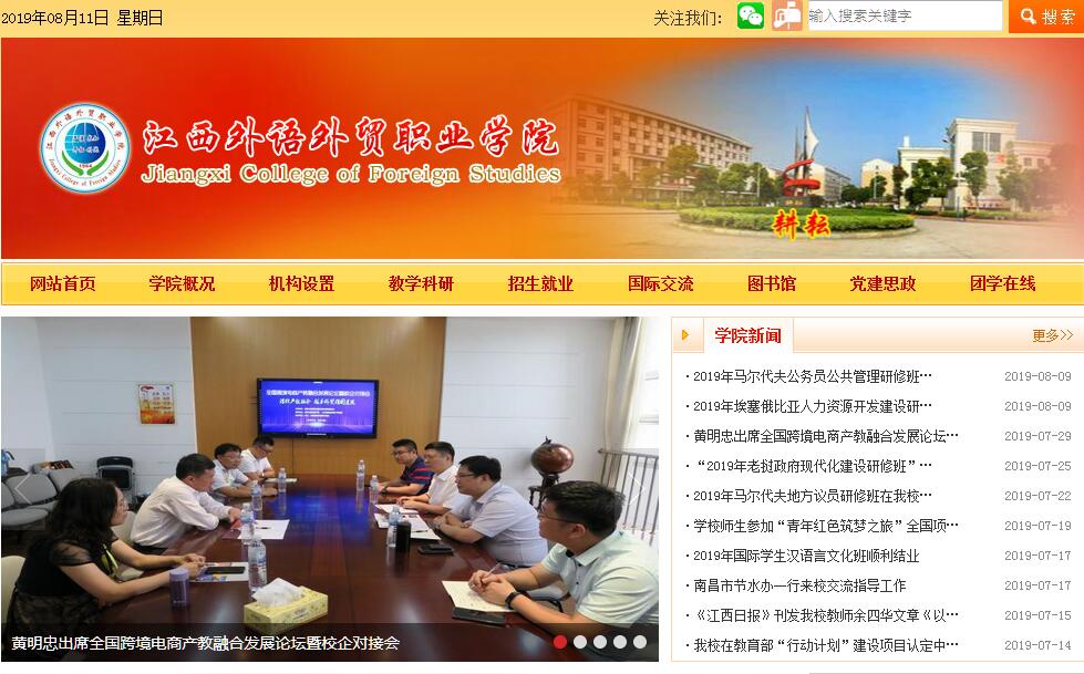 江西外语外贸职业学院隶属于江西省商务厅,是江西省唯一一所以培养外语和外经贸应用人才为主的高职院校,现有全日制在校生1.2万余人,合作培养本科生近400人。学院先后被确定为江西省人民政府与商务部共建院校、全国首批国际商务官员研修基地、国家优质高等职业院校建设立项单位、教育部现代学徒制试点院校、全国职业院校教师素质提高计划优质省级基地、全国职业院校数字校园建设实验校、全国跨境电商专业人才示范校、江西省首批示范性高职院校、江西省首批应用型本科人才试点院校。2017年和2018年蝉联全国职业院校“国际影响力50强”。2018年学院被确定为“江西省高水平高职院校建设项目立项单位”。商务英语、国际商务、电子商务、会计、商务日语等5个专业被确定为“江西省优势特色专业建设立项项目”。学院的建设与发展得到各级领导的高度肯定。中共中央政治局委员、国务院副总理孙春兰参观第四届中国“互联网+”大学生创新创业大赛获奖项目展示,对学院“缘蜜”项目参赛选手表示肯定。近年来,省委书记刘奇,省委常委、宣传部长施小琳,省人大常委会党组副书记、副主任朱虹,副省长孙菊生分别对学院创新创业、立德树人、产教融合、特色办学等工作给予充分肯定和表扬。办学条件优越。学院占地面积560亩,校舍建筑面积23.4万平方米,图书馆资源共计106万册,校内外实训基地300余个,生均教学行政用房达9.2平方米,生均教学科研仪器设备值达9857元,综合体育馆、国际标准体育场等设施齐全,校园绿化面积达42%,校园网、监控网、校园一卡通等现代信息化设备一应俱全,固定资产总值近11亿元。专业特色鲜明。学院设有英语学院、国际商务学院、应用西语学院、应用东语学院、工商管理学院(旅游学院)、会计金融学院、国际工程学院、电子商务学院、艺术与设计学院、创业学院、基础教学部、思想政治理论课教学部等12个院(部),共开设商务英语、商务日语、国际商务、物流管理、会计、电子商务等49个专业,设有英、日、德、韩、法、阿、西、葡、俄、意、波斯等11个语种,是全国开设外语语种最多的公办高职院校。师资力量雄厚。现有教职工700余人,拥有博士23人,专任教师中硕士学历(学位)以上占比达73.56%,博硕比例在全省高职院校中位居前列。教职工中有教授43人,副教授86人,外籍专任教师18人,留学归国教师50余人,行业企业外聘兼职教师109人。全国优秀教师1人,省级教学团队3个,享受省政府特殊津贴专家1人,省级教学名师3人,省级中青年学科带头人2人,省级骨干教师13人。2名外籍教师获“庐山友谊奖”。教研成果丰硕。现有省级以上精品资源共享课程近30门,省级特色专业5个,省级双语示范课程5个。近五年来,学院教师与行业企业共同开发出版教材110余部,主持或参加省级科学研究项目或课题近180项,公开发表论文1800余篇,其中权威、核心期刊论文220余篇。学生参加全国全省各类职业技能竞赛屡创佳绩,获得省部级以上奖励700余项,其中国家一等奖52项、省级一等奖190余项。2017年和2018年,在全国职业院校技能大赛中,连续两年参加4个赛项,分获2个和3个一等奖,常规赛项一等奖数量和比例均居全省第一,为提升全省高职教育水平做出重要贡献。招就量质双优。连续三年招生录取分数线位居全省前列,350分以上生源稳定在70%左右,新生报到率95%以上;毕业生初次就业率居全省第一方阵,首届应用本科班就业率达100%。学院荣获2016-2018年度全省普通高校毕业生就业工作“优秀等级学校”和“先进单位”称号。近年来已有近500名学生在美、英、俄、日、韩、阿联酋等10余个国家实习就业。国际合作广泛。先后与意大利贝加莫大学等近30所海外高校和教育机构建立了合作关系,通过“2+2”专升本、“2+1+1”专升硕、短期进修、交换学习、顶岗实习等培养模式,提升学历层次、语言应用能力和专业技能。从2017年开始,举办 “伊朗汉语言文化培训班”,实现江西高职高专院校留学生教育零的突破。学院充分发挥商务部国际商务官员研修基地平台优势,截至目前承办援外培训项目148期,培训来自世界126个国家的3890名官员和技术人员,促进江西铜业、江西建工等20余家赣企“走出去”。2018年9月,首次在赤道几内亚成功举办“刺绣和竹编援外培训班”,实现了我省在境外开展援外培训的突破。“双创”成绩显著。组建了由42名校内专兼职教师和60余名校友、企业导师组成的“双创”教学队伍,建成了3400平方米的大学生创业孵化园和悦创空间,与南昌高新区共建了700平方米的创业就业示范基地。“悦创空间”分别被省发改委、省教育厅授予“江西省大众创业万众创新示范基地”和“江西省大学生创新创业示范基地”,在全省高职院校均属唯一。2017年和2018年,在江西省“互联网+”大学生创新创业大赛中金奖数量和获奖数量均列全省高职院校榜首。在第四届中国“互联网+”大学生创新创业大赛获奖总数名列全国高职院校第一、全省高校第二,并获全国高职院校唯一的先进集体奖,为江西“双创”教育争得了荣誉。产教融合深入。经省商务厅批准,学院牵头联合有关企业及工业园区组建了江西国际商务职业教育集团,目前集团共有成员单位82个。建成了校企合作产业园,创建了来鑫产学研创新实验区。以订单培养为重要手段,订单班涵
