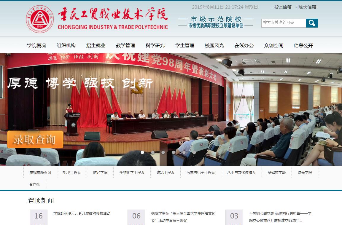 重庆工贸职业技术学院是重庆市人民政府举办的全日制普通高等职业学校,自1936年建校以来,为国家培养了7万余名技术人才和管理人才。学院占地27.85万平方米,校舍面积14.5万平方米,固定资产4.56亿元,馆藏图书54.8万册,教学实验仪器设备总值6502万元,有9个校内生产性实训基地、151个校内实训室。学院现有教职工339人,专任教师275人。教师中博士1人、硕士70人,教授12人、副教授106人,双师素质教师173人,重庆市高校中青年骨干教师3人,全国行业职业教育教学指导委员会委员4人,全国技术产品文件标准化技术委员会委员1人,涪陵区名教师2人,涪陵区科技拔尖人才25人,还聘请了一批实践经验丰富的兼职教师。学院设有机电工程系、财经贸易系、生物化学工程系、建筑工程系、汽车与电子工程系、艺术与文化传播系、国际教学部,开办机电一体化技术、会计电算化、药品生产技术、建筑工程技术、汽车检测与维修技术、学前教育等38个专业,有中央财政支持的实训基地4个、中央财政支持高等职业学校提升专业服务产业发展能力项目2个、重庆市教改试点专业1个、重庆市财政支持高等职业学校提升专业服务产业发展能力项目1个、重庆市高等职业院校专业能力建设(骨干专业)项目5个、重庆市高等职业院校应用技术推广中心1个、市级精品课程(精品视频公开课)4门、市级教学团队1个。学院在校生7000余人,毕业生就业率95%以上。学院秉承“厚德 博学 强技 创新”的校训,坚持“突出高等性、保持职业性、体现区域性”的办学思路,树立“能力为本,就业为先,全面发展”的育人理念,探索和实践“校地、校企、校校合作”的协同办学模式,实施“行业、企业、专业相衔接设置专业,岗位、能力、课程相衔接开发课程,政府、学校、企业相衔接建立人才培养体制机制”的“三个三衔接”人才培养模式和“思政教育立德树人、专业教育强化技能、人文教育提升素质、强身健体锻造体魄”的“四位一体”素质教育模式,培养专业有特长、就业有优势、创业有能力、提高有基础、发展有空间的“五有”人才。学院与134家企业校企合作办学,建立稳定的校外实习实训基地,合办“重安班”“嘉陵-本田班”“奥康班”“涪陵榨菜班”“华峰化工班”“观澜湖班”“雅戈尔班”“望江班”等订单培养班。学院是重庆市高技能人才培养基地,重庆市“企业科技特派员——百人计划行动”首批派出单位,涪陵区农村劳动力转移培训基地、移民培训基地、再就业培训机构、职业技能培训鉴定基地,开展41个工种的职业技能鉴定。学院是重庆市示范性高等职业院校、重庆市优质高等职业院校建设项目立项建设单位、高职高专人才培养工作水平评估“良好”学校、全国平安和谐校园、全国德育管理先进学校、档案管理国家二级单位,重庆市文明单位、重庆市依法治校示范校、重庆市平安校园、重庆市语言文字规范化示范校、重庆市园林式单位、重庆市职业教育先进集体、新中国成立60年重庆教育功勋特色高职院校。