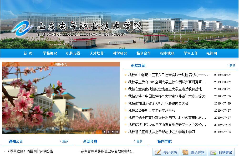 山东电子职业技术学院是由山东省人民政府举办的全日制公办普通高等职业院校,实施省工业和信息化厅与省教育厅共同领导和管理。人才培养目标定位是:以立德树人为根本,以服务发展为宗旨,以促进就业为导向,立足山东、面向全国,为信息产业发展和信息技术推广应用培养生产服务一线需要的技术技能型人才。学校是国家“计算机应用及软件技术专业领域技能型紧缺人才培养学校”、国家“电子信息产业高技能人才培训基地”“教育部——中兴通讯ICT行业创新基地”“山东省技能型特色名校”“山东省优质高等职业院校建设工程立项建设单位”。学校坐落于历史文化名城济南,现有章丘、和平两个校区,占地1045亩,建筑面积24万平方米,教学科研仪器设备总值8823.18万元,馆藏纸质图书61.7万册,电子图书11600GB,校内实验实训场所143个,校外实习实训场所155个。建有万兆骨干校园网,网络全覆盖,是山东省首批教育信息化试点建设单位。学校立足山东,面向全国招生,在校生9149人。校内专任教师396人,其中博士12人,硕士及以上学位专任教师占75.75%,高级职称专任教师占30.76%,“双师素质”教师占92.25%;建有500人的兼职教师资源库,师资队伍数量适足、结构合理,生师比15.12:1;有全国教育系统先进集体1个,全国学习型先进班组1个,省级教学团队和先进集体7个,省职业教育名师工作室2个,省富民兴鲁劳动奖章获得者1人,市五一劳动奖章获得者1人,省级教学名师、优秀教师、青年技能名师10人;全国、全省教育教学专家库专家和行指委、专指委专家委员15人;近三年教师在全国、全省教育教学竞赛和职业技能大赛中获得一等奖10项、二等奖27项,其中职业院校信息化教学大赛国赛二等奖2项、省赛一等奖2项,省职业院校技能大赛一等奖3项。师资队伍建设保持全省领先,教师综合素质、实践技能水平较高,社会影响力较强。学生技能竞赛成绩斐然,获得全国职业院校技能大赛一等奖8项,二等奖9项,三等奖5项;全省职业院校技能大赛一等奖16项,二等奖15项,三等奖19项,是山东省大学生软件设计大赛唯一获得两次特等奖的高校。学校坚持服务于信息产业发展和信息技术推广应用的办学定位,贯彻“以信息技术为主体、以机电技术和现代服务技术为两翼”的专业建设思路。设电子与通信工程系、计算机与软件工程系、智能制造工程系、商务管理系、财经金融系、数字媒体系、基础教学部、思想政治课教学部,开设全日制高职专业41个,其中信息技术类专业占80%,与行业、区域经济发展高度吻合。在全省职业院校中,电子信息类专业门类最全、规模最大、综合实力领先,专业集群发展优势突出、特色鲜明。学校牵头组建山东电子信息职业教育集团、山东省电子商务职业教育集团、山东省电子信息职业教育专业建设指导委员会。现有央财重点支持专业2个、省财政重点支持专业5个、省级特色专业5个、省级品牌专业群2个;建立了“中职-高职-本科”人才培养机制,搭建职业教育“立交桥”,开办中职高职“三二连读”专业13个、高职本科“3+2”对口贯通分段培养专业1个。牵头开发国家级职业教育专业教学资源库子项目2项,主持开发山东省职业教育专业教学指导方案7个、课程标准1个;建有省级精品课程及精品资源共享课36门、省职业教育技艺技能传承创新平台4个;获得省职业教育优秀教学成果奖11项,主编出版国家职业教育“十二五”规划教材13种。在全省职业院校中,电子信息类专业门类最全、规模最大、综合实力领先,引领全省同类专业发展。多年来,学院秉承“求真达善致知力行”的校训、“和谐自强严谨创新”的校风和“勤学勤练动脑动手”的学风,深度对接电子信息产业,坚持内涵发展,突出办学特色,各方面工作取得了较好成绩,赢得了良好社会赞誉,学校先后获得了“全国职业技术教育先进单位”“全国职业技术学校职业指导工作先进学校”“全国高等职业院校双创先进工作单位”“全国信息产业系统先进集体”“山东省高等学校教学管理先进集体”“山东省资助工作先进单位”“山东省教育信息化示范院校”等表彰和荣誉,连续14年保持省级文明单位称号。“学信息技术、到山东电院”逐步成为社会共识。