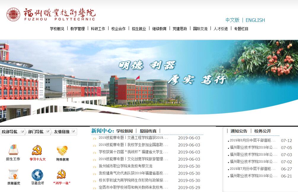 福州职业技术学院是福建省人民政府批准成立、教育部备案,由福州市人民政府举办的全日制普通高等职业学校。学校坐落于福州市大学城,溪源江贯穿校园,两桥横跨南北校区,校园面积1122.08亩(其中水域面积约180亩,预留地400亩),建筑总面积约19.14万平方米。学校下设阿里巴巴大数据学院、机器人学院、机电工程学院、交通工程学院、建筑工程学院、国际教育学院、商学院、文化创意学院、特殊教育学院等9个二级学院。学校面向福建及云南、山西、广西、河南、浙江、贵州、安徽、海南、江西、四川、甘肃、西藏、新疆14个省、自治区招生,招生专业36个,招收国际留学生35名。现有教职工500多人;全日制高职在校生9000多人,各类成人学历在校生9400多人。学校居2018年福建省示范性现代职业院校评估第一名,2018年福建省示范性现代职业院校5所重点建设项目院校第一位,2017届毕业生初次就业率(福建省87所高校)第一名。学校成功承办全国高职高专校长联席会议2018年年会,首次入选会议主席团成员单位。学校连续8年获得福建省高等职业院校技能大赛团体一等奖,近5年获得全国职业院校技能大赛奖项38项,其中2017、2018年并列全国16、19名。毕业生初次就业率98%以上,用人单位满意率达99%以上。在“互联网+”大学生创新创业大赛、中华职业教育创新创业大赛等各类创新创业竞赛中摘金夺银,成绩位居全省高职院校前列。2017年学校被福州新区管委会授予“福州新区国家双创示范基地福州职业技术学院示范点”,2018年学校大学生创新创业园区获评“福建省大学生创新创业园”。学校践行“明德、利器、厚实、笃行”的校训,全面实施“政校企合作,内涵式发展”的办学理念。构建了政府、企业、学校“三方联动”的办学模式,成立了由市长担任理事长,分管副市长担任执行理事长,29个政府相关部门以及50多家相关行业龙头企业参与的“福州职业技术学院政校企合作办学理事会”;与政府有关部门、行业、企业联合组建了4个行业、2个园区“政校企合作工作委员会”以及福建省电梯职教集团,并与阿里巴巴集团、百度、微软、安恒网络、北方天途、迅达电梯、福州地铁、东南汽车、福建金科集团、网龙公司等知名企业共同培养人才。学校紧扣国家发展战略,充分利用区域与自身优势,深化对外交流与合作。与澳大利亚博士山学院,开展“3+2”专本衔接项目,与新西兰商学院、林肯大学(林肯大学、梅西大学二选一)联合开展“3+1+1”专本硕合作项目。与马来西亚、印度尼西亚、泰国和匈牙利等高校合作开设鲁班学院或分校。与多个国外院校开展留学生、交换生、师资和员工培训等交流与合作,面向“一带一路”及非洲友好国家招收和培养专科学历国际学生,涵盖国际商务、计算机网络技术等12个专业。学校充分发挥职业教育对于精准扶贫、精准脱贫的重大促进作用。与宁夏财经职业技术学院、华南女子学院、宁德职业技术学院、闽北职业技术学院、周宁职业中专学校结对子,在党建思政、专业建设、师资队伍建设、校企合作、职业培训等方面实施精准帮扶。学校深化“励志成才”“匠心筑梦”“爱心奉献”三大文化内涵,建立国家级非物质文化遗产福州评话、福州伬艺两个传习基地和福建曲艺教学示范基地,学生曲艺社团入选全国高校曲艺社团联盟理事单位。校园文化成果荣获全国高校校园文化建设优秀成果奖并入选教育部《全国职业院校校园文化优秀案例集》。学校重视社会服务与品牌形象,2017年被评为省级职教师资培养培训基地,大力开展师资培训、职业培训、职业技能鉴定及职业资格认证工作,2018年完成各类社会考生职业技能鉴定人数3300多人。市政府挂靠学校成立了福州市社区大学,2010年以来43000多人次参加学习,打造成省市终身教育品牌,学校的品牌效应和社会影响力逐年上升。