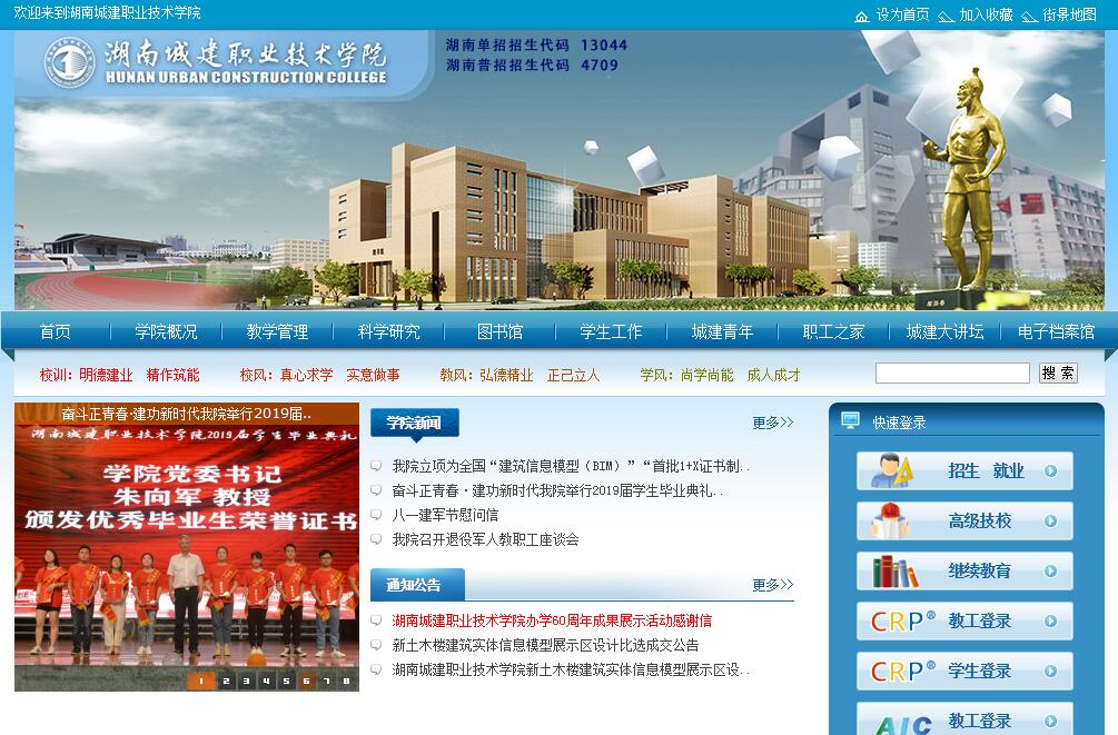 湖南城建职业技术学院前身是1958年成立的湖南省土木建筑学校,1972年更名为湖南省建筑学校,2003年,经湖南省人民政府批准,由湖南省建筑学校与湖南省建材工业学校合并组建湖南城建职业技术学院。2008年,原长沙职工大学(湖南建筑高级技工学校)并入学院。2011年成为湖南省示范性高职院校。2018年立项湖南省高等职业教育卓越高职院校建设单位。在60年办学历程中,学院励精图治,艰苦奋斗,为社会培养了十二万多名高素质技术技能人才,培训了数万名企业经理、项目经理和建筑业专业技术人员,被誉为湖南建设人才的摇篮和百万建筑湘军的“黄埔军校”。现有全日制高职在校生10135人。学院秉承“明德建业、精作筑能”的校训,坚持“塑造人格,培养技能,张扬个性,服务社会”的办学理念,确立“具有自主知识产权、城建高职教育特色鲜明、省内领先、国内一流、国际有影响的卓越高职院校”的发展目标,以“真心求学、实意做事”为校风,以“弘德精业、正己立人”为教风,以“尚学尚能、成人成才”为学风,培养德智体美劳全面发展,基础扎实,技能过硬,素质优良,适应城乡建设行业生产、建设、服务、管理第一线需要的“首选高素质技术技能人才”。学院现设有建筑系、建筑工程系、建筑设备工程系、管理工程系、市政与路桥工程系、公共基础课教学部、思想政治理论课教学部和1所建筑高级技校、1所继续教育学院。学院开设23个高职专业,建筑工程技术专业群、建筑设计技术专业群、建筑工程管理专业群为湖南省一流特色专业群;以建筑工程技术专业为核心的建筑工程施工与管理专业群为省级示范性特色专业群;工程造价、建筑设计技术专业为省级特色专业和省级精品专业;建筑工程技术实习实训基地为中央财政支持的职教实训基地、湖南省职教重点实习实训基地;建筑设备工程技术专业为省级生产性实习实训(教师认证培训)基地项目;工程造价专业为省级校企合作生产性实习实训基地项目;学院牵头组建的湖南建筑职业教育集团为省级示范性职教集团。学院现有教职工628人,其中教师429人,正高职称14人,副高职称151人;博士研究生3人,具有研究生学历或硕士学位300人。省级专业带头人3人,省级青年骨干教师8人,省级优秀教学团队2个,国家一级注册建筑师、一级注册结构工程师、一级注册建造师等“双师素质”教师258名;多名教师在教育部、住建部、中国建设教育协会和省教育厅、省住建厅、省建设人力资源协会等部门(机构)担任专家。学院受省教育厅委托主持编制了《湖南省中等职业学校专业教师培训与考核标准·建筑工程技术类标准》和湖南省高职院校建筑工程技术、工程造价、建筑装饰工程技术三个专业的学生专业技能抽查标准,牵头负责全省高职院校建筑工程技术和工程造价专业学生专业技能抽考工作;受省住建厅委托主持编制了《湖南省土建类中、初级专业技术职务任职资格考试大纲》、《建筑业农民工培训指南》和湖南省建筑业企业专业技术管理人员(八大员十岗位)岗位资格考试大纲、远程考试试题库、培训教材;先后完成了一、二级注册建造师继续教育培训、建设行业职业技能鉴定考评员培训和全省职业院校建筑工程技术专业教师企业顶岗实践培训等多个培训项目,是湖南建设行业和建设类职业院校教学指导中心、实习实训中心、师资培训中心、职业资格鉴定培训中心。在推进建设行业技术进步、提高建筑业从业人员技能水平、引领建设职业教育创新发展等方面发挥了巨大作用,在行业内和同类院校中享有良好声誉。学院2006年12月通过第一轮教育部高职高专院校人才培养工作水平评估并获优秀等级,2011年12月高票通过第二轮教育部高等职业院校人才培养工作评估,是湖南建筑职业教育集团理事长单位、湖南省建设人力资源协会职业院校委员会主任单位、湖南省职业教育与成人教育学会高职土木建筑类专业委员会主任单位、全国装配式建筑科技创新基地(湖南省装配式建筑技术培训中心)、中国建筑工业出版社中南地区职业教育教材出版研发基地、全国建设行业技能型紧缺人才培养培训基地、全国建材工业人才培训基地、湖南省建筑业特种工培训基地、湖南省建筑业企业专业技术管理人员培训基地、湖南省企业高技能人才培训省直定点机构、湖南省一级建造师继续教育定点培训机构、湖南省建筑业农民工继续教育培训基地、湖南建工集团技能型人才培养培训基地、湖南建工产业研发中心、湖南建工教育培训中心,荣获全国五四红旗团委、湖南省文明高等学校、湖南省文明卫生单位和湖南省职业教育与成人教育先进单位、湖南省职业教育先进单位、湖南省高校毕业生就业工作先进单位、湖南省高职高专招生就业工作先进单位、湖南省高校毕业生就业“一把手工程”优秀学校等称号,连年获评湖南建工集团文明单位。学院所属湖南建筑高级技工学校为国家级重点技校、湖南省示范性重点技校。在新时代的奋斗之路上,学院将高举习近平新时代中国特色社会主义思想伟大旗帜,坚持社会主义办学方向,坚持把立德树人作为根本任务,全面实施素质教育,培养德智体美全面发展的社会主义建设者和接班人,努力办好人民满意的教育,不忘根本,牢记使命,向着“具有自主知识产权、城建高职教育特色鲜明、省内领先