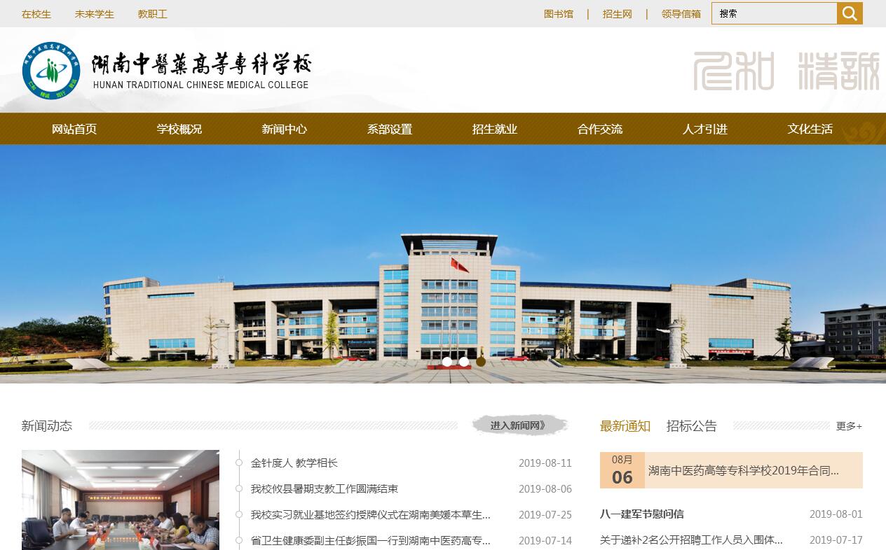 湖南中医药高等专科学校是 2004 年经国家教育部批准升格,由湖南省卫生与健康委员会、湖南省教育厅管理的公立全日制普通高等专科学校。地处中华民族始祖炎帝神农氏陵寝地、中南地区重要交通枢纽--株洲市,距长沙仅 30 分钟车程。学校始建于 1959 年,已有 60 年办学历史。分芦淞校区和云龙校区,现占地 700 余亩,总建筑面积 26万平方米。校园环境优美,配套了以中医药为主体的环境设施,校园绿化美化全部采用药用植物,具有浓厚的中医药文化氛围。标准田径场、足球场、篮球场、健身房及大礼堂等文体设施齐全。固定资产 2.7 亿元。图书馆馆藏纸质图书35万册,中外文期刊近千余种,已建成现代电子图书系统,电子图书46万册,电子期刊5千种。现有专任教师383人,高职称197人,占51%;硕士博士研究生177人;“双师型”教师183人,占专任教师的51 %。拥有直属附属医院 1 家,附属第一医院 ( 湖南省直中医院 ) 系三级甲等医院,是全国首批示范中医医院;株洲市中医伤科医院等协作型附属医院3家;株洲市妇幼保健院等教学医院20家;临床技能实训中心等校内实训中心 5 个;校外实习、实训基地 130 余家。学校下设临床医学系、药学系、护理系、康复保健系、基础医学部、公共课部、思政理论课部、推拿研究所、中药研究所等教学科研系(部)。开设中医学、中医骨伤、医学影像技术、中药、药学、中药制药技术、药品质量与安全、药品经营与管理、护理、助产、针灸推拿、康复治疗技术、医学美容技术、养老服务与管理、中医养生保健、中医康复技术16个专业;社区中医健康服务、中药产业服务是湖南省高等职业教育特色专业群。全日制学生9千余人。学校以“仁和、精诚、笃行、致远”为校训,以“德育为先、能力为重、突出技能、全面育人、服务社会”为办学宗旨,继承发扬开拓进取、求索创新、奉献为民的炎帝精神,积极培育中医药特色的校园文化。为基层医疗机构、中医药行业及康复保健机构等输送了4万多名人才,诞生了一大批杰出校友:如株洲市人民医院院长李康华、汉方国药董事长杨勇、最美护士何瑶、最美乡村医生潘检和大学生“村官”李黎等等。学校以“卓越一流,强校升本”为目标,坚持立德树人、坚持“质量立校、人才强校、特色兴校”的办学理念,积极探索中医药院校办学规律,建立了适合中医药专业发展特点的课程体系。有国家级精品资源共享课程1门、省级精品课程4门、省级精品在线开放课程1门,省级精品在线开发培育课程5门。牵头主持全国职业教育传承与创新针灸推拿教学资源库建设。中药专业为省级特色专业,针灸推拿专业为教育部健康类示范专业、湖南省级重点专业,中药、护理专业为中央财政支持的高职高专重点建设专业。近几年共承担各类科研课题260余项,获得市(厅) 级以上科技成果奖十余项。公开发表被SCI、CSCD、北大核心等收录学术论文近100篇,主编出版国家级规划教材近100部。主办有内部刊物《湖南中医药高等专科学校学报》。近几年来,参加全国举办的助产、中医护理、康复、中医临床技能、中药、针灸推拿等各类技能大赛,均取得了团体第一名或一等奖。学校与多家全国知名药企、大型医院签定了合作办学协议:与千金药业股份有限公司、老百姓大药房、益丰大药房、湖南美媛堂生物科技股份有限公司、台湾罗丽芬集团合作开办“订单班”;与附属第一医院、附属株洲中医伤科医院、株洲市妇幼保健院、株洲331医院、株洲市中心医院等联合实施 “1+2”合作办学;与省人民医院、省儿童医院、湘雅附二医院合作进行“ICU”、“呼吸师”、“造口护理”等专科护士人才培养。其中株洲中医伤科医院、千金药业有限股份公司、湖南美媛堂生物科技股份有限公司、株洲市妇幼保健院被评为湖南省校企合作人才培养示范基地。