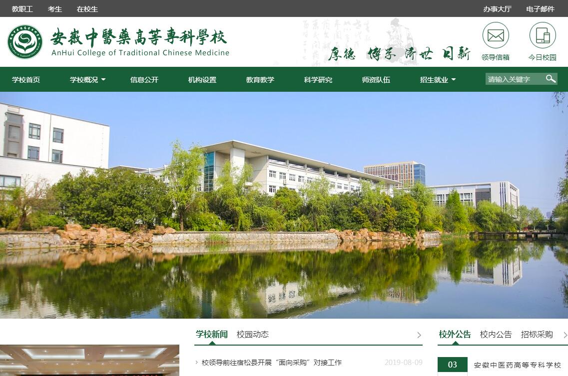 安徽中医药高等专科学校前身是始建于1960年的“芜湖市中医学校”。2001年,学校独立升格并于次年经教育部批准,在全国同类院校率先更名为“安徽中医药高等专科学校”。为整合卫生教育资源,壮大学校实力,2006年,市政府将芜湖市中医医院成建制划归学校作为直属附属医院;2012年,附属市牙病防治所成功创建附属口腔医院(芜湖市口腔医院)。经过50多年的建设与发展,学校已经成为具有鲜明中医药特色的地方性高等院校,2010年,学校成功创建了“安徽省示范性高等职业院校”;2015年,学校在省级示范性高职院校项目验收和人才培养工作个性化评估中获得“优秀”等次。学校现为教育部中医药职业教育教学指导委员会副主任委员单位、全国中医药职业技术教育学会理事长单位、中华中医药学会治未病分会副主任委员单位、世界中医药学会联合会亚健康专业委员会、药膳食疗研究专业委员会副会长单位、安徽省中医药现代化研究会理事长单位。学校占地面积997亩,总建筑面积29.7万平方米,现有医疗系、药学系、康复保健系、护理系、口腔医学系及基础教学部、思想政治理论课教学研究部等教学系部,开办中医学、中医骨伤、针灸推拿、中药学、药学、护理、中医健康管理、中医养生保健(含中医养生旅游方向)、医疗美容技术、口腔技术、康复治疗技术等29个专科专业及专业方向,学校现有专任教师553人,其中,副高以上专业技术人员192人,具有研究生学历人员246人,省级优秀教师3人,学校还聘任国医大师李济仁等为特聘教授、客座教授。学校下辖2所直属附属医院、1个安徽中药资源研究所、1个天然药用植物园和9所非直属附属医院及稳定的实习基地120家。学校附属中医医院(芜湖市中医医院)创立于1958年,在中医界素有“江南中医一枝花”的美誉,为“全国首批示范中医院”、“国家三级甲等中医医院”,医院拥有4个国家级重点专科,6个省级重点专科, 7个市级重点专科,1个省级重点专病,国家级名老中医工作室4个,省级名老中医工作室4个。学校现有中央财政支持实训基地1个,中央财政支持提升专业服务产业发展能力项目2个,省级特色专业、骨干专业、示范专业、专业综合改革试点项目15个,省级精品课程、精品开放课程16门,省级示范实验实训中心、创新实验区、校企合作实践教育基地、校企共建生产性实训基地12个,省级教学团队7个,省级教学名师、教坛新秀、优秀教学管理工作者24人,省级卓越技能型人才计划2项,省级示范实习实训中心1个、省级实习实训基地1个。近年来,学校共承担了各类科学研究项目97 项,其中市厅级以上科研项目49 项,获得7项国家授权专利;公开发表学术论文248篇,其中核心期刊类论文37篇。承担各级各类教学研究项目105项,其中省级以上63项;获各级获得各级各类教学成果奖57项,其中省级25项。近五年,学校教师主编教材58部,其中2部教材入选教育部普通高等教育精品教材。2013年,学校共有15名主编、23名副主编参与第三轮全国中医药高职高专国家卫计委规划教材编写、修订。学校主办的《现代中药研究与实践》为中国科技核心期刊,是我国中药研究领域的重要学术期刊之一。建校50余年来,特别是升格近15年来,学校秉承“厚德、博学、济世、日新”的校训,坚持“以人为本、尚德重技,创新服务,特色发展”的办学理念,在中医药专业建设、应用型人才培养、中医药对外交流、中医药健康产业研发以及服务地方经济和社会发展等方面,形成了独特的优势,为国家培养了5万余名中医药应用型人才。当前,学校正进一步解放思想,同心同德,抢抓机遇,科学发展,努力提高人才培养质量和提升办学层次。