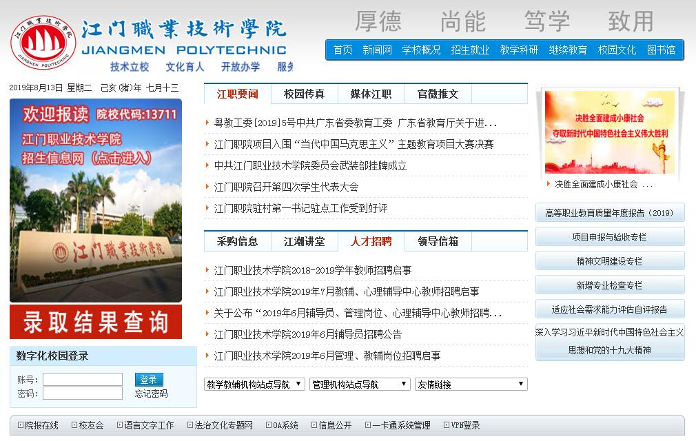 江门职业技术学院于2004年7月正式挂牌成立,是一所全日制公办普通高等职业院校,由原江门教育学院、江门市工业中等专业学校和江门财贸学校组建而成。学校2009年通过教育部高职院校人才培养工作评估验收,2010年启动创建省级示范校和“创新强校工程”建设,2012年成为省级示范性高等职业院校培育单位,2013年成为建设单位,2018年通过验收。现为江门市职业教育联合会牵头单位,广东省“一带一路”职业教育联盟、学前教育教师发展联盟副理事长单位。学校主校区坐落于风景优美的西江之滨,规划用地1080亩,校舍建筑面积29.25万平方米。设有材料技术、电子与信息技术、经济管理、机电技术、教育与教育技术、外语、艺术设计和思想政治理论课教学部等8个教学系部,开设新材料与化工、先进装备制造、智能制造和现代服务类等专业49个。全日制在校生13000余人。全校教职员工731人,专任教师601人,专任教师中高级职称教师130人,具有硕士及以上学位教师344人。学校秉承“技术立校、文化育人、开放办学、服务侨乡”的办学理念,坚持走“校企合作”、“工学结合”的发展之路,主动适应江门五邑地区产业发展需求,重点建设智能产品开发、模具设计与制造、机电一体化技术、应用电子技术、物流管理、会计等专业及专业群,建成省级重点专业、品牌专业8个。学校着力推进产教融合、校企合作“精准对接、精准育人”。与翠山湖工业园区、高新技术开发区、蓬江区“人才岛”、德昌电机等产业园区、重大项目、重点企业对接。与古兜温泉公司、中石化等大型企业合作共建现代学徒制试点;与古兜温泉公司合作成立温泉学院。与台山市校地合作,共建江门职院新宁学院,开设旅游管理、模具制造、机电一体化等专业。与澳门旅游学院签署合作协议,探索共建粤港澳大湾区旅游行业资格标准,积极推动成立大湾区旅游职业教育联盟,共同促进旅游人才培养。学校办学成果丰硕。学校获得省级精品开放课程14门,教学改革等项目16项;教学成果奖2项;拥有省级高等职业教育专业领军人才、高等学校教学名师,优秀教学团队3个,高校“千百十工程”省级培养对象2人,市级高层次人才80多人。中央财政支持实训基地3个,省级实训基地7个,省级公共实训中心3个,省高职教育专项扶持资金支持实训基地3个,大学生校外实践教学基地6个。学校充分发挥服务社会的功能。2017年为行业、企业提供技术服务42项,获得国家专利97项,专利授权64项。公益性培训服务从5495人日提高到9888人日。学生在各项竞赛中屡获佳绩,获得国家级奖项近20项、省级400多项。在“挑战杯”广东大学生课外学术科技作品竞赛中,获得多项特等奖、一等奖,连续五届捧得“团体优胜杯”。2018年,在“挑战杯-彩虹人生”全国职业学校创新创效创业大赛中,勇夺全国一等奖,实现新突破;在全省大学生电子设计大赛上,与900多支参赛队伍同场竞技,获得一等奖2个,二等奖2个,三等奖6个。学校广受社会欢迎,2018年新生报到率达90.05%。毕业生就业质量和满意度进一步提高。2017年毕业生总体就业率首次达到100%,连续5年保持增长势头,对口率达87.11%,就业现状满意度持续提升。2018年毕业生初次就业率达97.54%。学校重视文化校园建设,把传统文化与时代精神有机结合起来,融中华文化、侨乡文化、科技文化、企业文化于一体,教风、学风和校风建设成效显著,初步构筑了“三年四季一校园”侨乡传统文化育人体系。学校先后获得“广东省文明单位”“广东省安全文明校园”“江门市文明单位”“江门市先进集体”“广东省红旗团委”“广东省普通高校毕业生就业工作先进集体”“广东省语言文字规范化示范校”“广东省践行社会主义核心价值观示范点”“广东省首批法治文化建设示范点”和“全国职业院校魅力校园”“广东高校校园文化建设优秀成果特等奖”等荣誉。