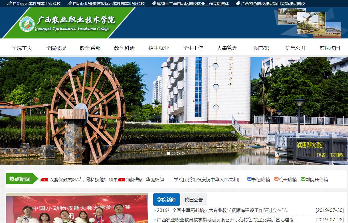 广西农业职业技术学院(以下简称“学院”)由创办于1942年的南宁高级农业职业学校发展而成,成长过程校名经历了南宁高级农业职业学校、广西革大农林水利专修科、南宁农业学校、广西农业专科学校、广西农业学校、南宁地区农业学校、广西农业学校、广西农业职业技术学院等变化,现在是广西壮族自治区直属的一所以农类专业为主的公办高等职业院校。2002年8月经自治区人民政府批准,重点中专广西农业学校升格为广西农业职业技术学院,2002年7月被教育部、劳动和社会保障部、国家经贸委授予“全国职业教育先进单位”荣誉称号,2005年12月被广西壮族自治区教育厅、发改委、财政厅、人事厅、劳动和社会保障厅、农业厅、扶贫办授予“全区职业教育先进单位”荣誉称号,2007年7月被批准为副厅级建制的自治区直属高校,2008年12月被广西壮族自治区教育厅认定为“广西壮族自治区首批职业教育攻坚示范性高等职业院校”,2011年1月被广西壮族自治区教育厅、财政厅认定为“广西壮族自治区示范性高等职业院校”,2013年6月被广西壮族自治区教育厅确定为“广西特色高校建设项目立项建设高校”。学院全面贯彻党和国家的教育方针,遵循高等职业教育办学规律,按照德才兼备、德育为先、能力为重、全面发展的要求,针对地方经济社会发展,特别是农业农村产业结构,着力培养适应生产、建设、管理、服务第一线需要的高素质技术技能型人才,学院以建设区域领先、特色鲜明的高等职业学校为办学目标。学院占地面积65.8公顷,建筑面积38.83万平方米(其中,教学行政用房面积14.62万平方米,学生宿舍面积8.76万平方米,固定资产29327.48万元,教学科研仪器设备总值14680.66万元。学院图书馆纸质藏书50.59万册,图书资源数据库6个,电子图书3100GB。已建成学生课堂刷卡和微信考勤系统、网络远程双向互动可视化教学培训系统、“一卡通”智慧管理系统、协同管理平台、教务管理系统、科研管理系统、学生综合信息管理平台、校情分析与综合数据共享信息平台等20多个系统,学院基本实现教学、行政、生活等方面信息化管理。现有教职工650人,其中专任教师522人,具有博士学位6人,具有硕士及以上学位190人;具有正高职称21人,副高职称98人,获教育厅认定的“双师型”教师164人。有3个教学团队(食品加工技术专业、养猪与猪病防治课程、果树生产技术课程)被评为自治区级教学团队,有14名教师被聘为全国行业职业教育教学指导委员会委员和广西行业职业教育教学指导委员会委员,有1名教师被评为广西高校教学名师,1人被评为广西先进工作者,1人获得广西五一劳动奖章。学院开设的专业涵盖农林牧渔、生化与药品、土建、制造、电子信息、轻纺食品、财经、文化管理等8大行业,形成了以农科类专业为主体,农、工、商、经、管、文多学科、多专业协调发展的专业格局。畜牧兽医、城市园林、食品加工技术、中草药栽培技术、园艺技术5个专业被确定为广西高等学校优势特色专业建设点。畜牧兽医、食品加工技术、中草药栽培技术、城市园林、园艺技术等5个专业先后获自治区示范特色专业及实训基地项目建设(分别获1000万元建设经费支持)。目前,学院正在按照“扶需、扶特、扶优”的原则,着力把畜牧兽医类、农作物生产类、园艺类、园林类、中草药类、食品加工与检测类、信息技术类、汽车与机电维修类、企业管理类等九大类专业打造成为国内具有影响力的优势特色专业群。目前,学院招生专业及专业方向共有58个。学院拥有现代园区示范型、有限公司经营型、教学工场研发型、基本技能训练型等多种模式的教学实训基地。其中,现代农业技术展示中心(八桂田园)是一个集引种试验、生产示范、技术推广、教学实习、科普教育和旅游观光为一体的校内现代园区示范型生产性实训基地;广西绿悦食品有限责任公司、广西绿信会计有限责任公司、广西华亚金桥农业科技开发有限责任公司等院内企业是有限公司经营型生产性实训基地。生物技术(应用园艺)实训基地、畜牧兽医实训基地、食品加工技术实训基地、种子生产与经营实训基地等4个实训基地为中央财政支持的职业教育实训基地;生物技术(应用园艺方向)实训基地、畜牧兽医实训基地、农林技术与管理实训基地、食品生物技术实训基地、建筑技术(城市园林方向)实训基地、机电设备维修实训基地、农产品营销实训基地等7个实训基地被认定为自治区示范性高职教育实训基地。此外,有100多家农业龙头企业及科研院所与学院建立了合作关系,成为学院稳定的校外实习实训基地。学院坚持以内涵建设促发展的道路,持续不断地加强教学改革。2014年9月,学院获国家级教学成果二等奖2项(获奖项目名称为:《高职食品类专业“六位一体”校内实训基地建设及实践教学改革》和《高职畜牧兽医专业“双主体、六融合”人才培养模式的研究与实践》,获奖成果数占当年广西高职院校获奖总数的1/4)。2009年至今,学院获自治区级教学成果奖9项(其中一等奖3项)。《果树生产技术》《养猪与猪病防治》《食品工程操作单元》等3门课程被评为国家精品课程,并获国家精品资源共享课项目立项;《养猪与猪病防治》《动物防疫与检疫技术》《果树生产技术》《植物细胞工程》《植物与植物生理》《食品工程操作单元