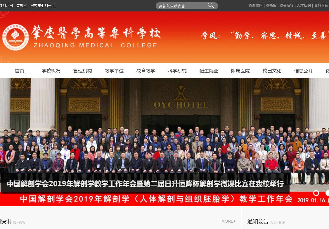 肇庆医学高等专科学校是广东省唯一的一所医学高等专科学校,学校前身为创建于1958年的中山医学院肇庆分院;2004年5月,经教育部批准改建为医学高等专科学校;现有端州、鼎湖和北校区3个校区,占地面积512亩,建筑面积21万平方米;有肇庆市第一人民医院等3所直属附属医院。现有教职工700余人,其中专任教师占78%,专任教师中高级职称人数比例超过45%,全日制专科在校生1万余人;学校设有临床医学、护理、口腔医学、药学、中医学、助产、医学检验技术、医学影像技术、康复治疗技术、护理(涉外护理)、护理(高职)、医药营销、卫生检验与检疫技术、中药学、针灸推拿、口腔治疗技术、卫生财会统计、中医骨伤、预防医学等19个专业;其中临床医学、护理、助产、口腔医学、中医学、药学、医学检验技术7个专业为省重点专业。学校秉承“育人为本、质量立校、人才强校、特色兴校”的办学理念、“大医精诚、知行合一”的校训、“勤教、严绳、精业、济世”的校风、“勤学、睿思、精诚、至善”的学风,坚持“立足广东、辐射全国、面向基层、服务社会”办学定位,以服务为宗旨,以就业为导向,以职业能力培养为本位,走“校院合作、医教结合”的发展道路,大力实施“以爱育爱”育人,为基层医疗卫生单位培养“下得去、用得好、留得住”的具有大医精诚和仁爱之心,全心全意为病人服务的医学人才,建校60年来,累计培养各类卫生专业人才6万余名。近年来学校办学质量与水平不断提升,毕业生总体就业率达98%以上,专业对口率90%以上;护理执业资格考试的一次通过率达99%以上;临床助理执业医师考试首次通过率超过50%以上;口腔职业资格考试首次通过率达70%以上,居于国内同类院校领先水平。 2017年,临床助理执业医师考试又创新高,平均高出全国20个百分点,全国临床助理执业医师考试第一名的学生出自我校,良好的人才培养质量极大提升了学校的社会知名度和美誉度。学校是广东省高职教育医药卫生类专业教学指导委员会主任委员单位、广东省职业技术教育学会医卫类专业指导委员会主任委员单位、广东省康复医学会康复教育分会会长单位、广东省卫生职业教育协会副会长单位、广东省医学教育协会副会长单位,已成为广东省农村、社区医药卫生行业高素质应用型专业人才培养基地;在职医药卫生技术人员继续教育培训基地;先进医护技术吸收、消化、转移和创新基地;社会医疗服务重要力量。学校先后被评为“国家紧缺(护理)人才培养培训试点基地”、“广东省依法治校示范校”、“广东省职业教育先进单位”、“职业技术教育培训基地建设先进单位”、“文明单位”、“文明校园”等荣誉称号。目前,学校正在肇庆市委、市政府的大力支持下,主动对接基层医疗卫生及健康产业,大力实施“创新强校、创优升本”工程,致力于在“十三五”期间创建成本科医学院。