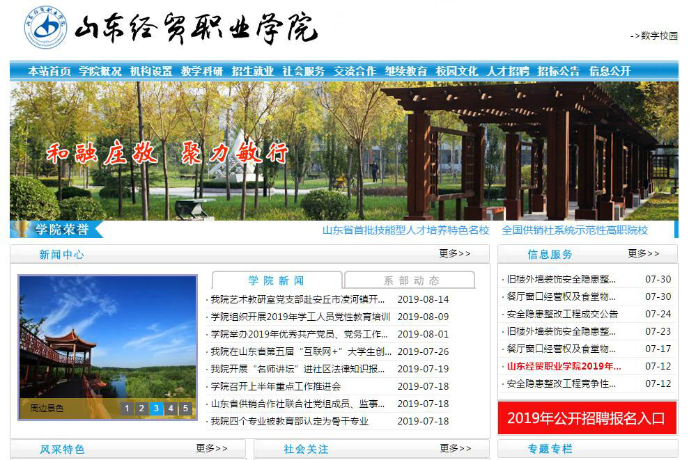 山东经贸职业学院是山东省人民政府批准、国家教育部备案的具有高等学历教育招生资格的省属公办全日制普通高等学校。2014年,被确定为全国供销合作社示范性高等职业院校。2016年,被确定为山东省首批技能型人才培养特色名校。学院位于世界风筝都潍坊市区,校园环境优美,绿树成荫,绿化覆盖率达65%以上,是省级“花园式单位”。一路之隔,就是风景优美的鸢都湖公园和国家AAAA级旅游景区白浪绿洲国家城市湿地公园,毗邻火车站、汽车站,交通便利。学院秉承“一切为了学生成才”的办学宗旨,以就业为导向,走产学研结合发展道路。大力实施“内引外联,虚实结合”的工学结合人才培养模式,积极推行项目化教学模式改革,大力推进以职业能力为核心的课程体系和“双证书”制度建设,学院现为全国职业核心能力认证培训测评站。强化校企合作和实践教学,积极推进素质教育,突出学生综合素质培养,面向现代服务业,培养财经商贸类高素质技术技能人才。学院立足行业,服务区域,结合财经商贸类专业特点,以提高质量为核心,着力打造具有明显专业优势和较高社会声誉的特色专业,示范带动其它专业协调发展。学院已拥有连锁经营管理、资产评估与管理2个中央财政支持的重点建设专业;金融管理专业是省教育厅确定的职业院校与本科高校对口贯通分段培养试点专业;拥有现代金融服务、会计2个省级品牌专业群,会计、报关与国际货运、物流管理等6个省级特色专业,审计、市场营销等4个全国供销合作社系统特色专业,电子商务、旅游管理等9个山东省技能型人才培养特色名校重点建设专业;省级精品课程32门,全国供销合作社系统精品课程6门,教指委精品课程7门,立项省级精品资源共享课16门,主持山东省高等职业教育连锁经营管理专业教学指导方案开发工作,参与建设连锁经营管理专业国家级教学资源库建设。学院教师队伍学历、职称、能力结构合理,现有专任教师337人,其中省级教学团队5个;4人被评为省部级教学名师;1人被评为山东省职业教育青年技能名师;拥有稳固的外籍教师聘用渠道,常年聘请来自美国、韩国和日本等国家的外籍教师10多名。2007年以来,学院教师进一步加强应用和开发研究,共荣获国家级教学成果奖,山东省科技进步奖,山东省软科学优秀成果奖,山东省高等教育教学成果奖,潍坊市社会科学优秀成果奖等科研成果奖226项;承担山东省社科规划项目、山东省软科学研究计划项目、山东省重大财经应用研究课题等各类科研项目408项;为行业企业开展管理咨询服务188次;公开发表论文2530余篇;编著教材120余部。学院设施完善,教学、生活条件优越,可为学生提供理想的学习、生活环境。学院7个教学机构拥有独立教学区,教室全部为多媒体教室,学院建有大学生活动中心、塑胶田径场、人工草皮足球场、标准篮球场、排球场及乒乓球、跆拳道、健美操、瑜伽、形体、舞蹈等室内训练场馆,功能齐全的文体活动场馆为学生综合发展提供了良好条件。学院建有大型超市、洗浴中心,拥有银行自动柜员机,高标准建设数字化千兆校园网;学生公寓内安装自动淋浴系统和直饮水设备,方便的生活设施为学生学习、生活提供了保障。学院建有会计技能实训室、商业银行柜台业务实训室、证券投资模拟交易大厅、建筑模型实训室、财务管理综合实训室、报关报检模拟大厅、模拟导游实训室等校内实训室110个,拥有校外实训基地 270个,中央财政支持的实训基地2个,其中,现代物流实训基地成为省内一流的冷链物流教学与科研基地。连锁经营管理专业校企共建生产性实验实训基地—潍坊丰华连锁超市有限公司经贸学院店已成为潍坊市社区样板店。学院牵头组建山东农村现代经营服务职业教育联盟,成立校企合作理事会,建设了一批“校中企”,实现校企资源共享。完善的实训设施,实践经验丰富的企业兼职教师,助力学生技术技能水平的提升。近年来,学生在国家、省市及行业协会举办的职业技能大赛中屡获佳绩。目前,学院已与英国理启蒙伦敦美国国际大学,爱尔兰莱特肯尼理工学院,韩国明知大学、嘉泉大学、新罗大学、加图立关东大学,日本神户电子专门学校,新加坡东亚管理学院,马来西亚思特雅大学、泰莱大学,台湾大仁科技大学、稻江科技暨管理学院、圣约翰科技大学等24所国(境)外高校建立了友好合作关系,校际间交流频繁。学院与韩国加图立关东大学签署了合作办学项目协议,该项目涉及旅游管理、酒店管理专业、金融管理、证券与期货、市场营销专业、工商企业管理专业,上述专业的学生在学院顺利毕业,可申请进入加图立关东大学学习,最短可在一年内取得本科学位。截至目前,共有48名学生赴加图立关东大学就读,首批学生中,已有2人按期毕业,其中1人已获得国内学位认证并就业,另有1人继续攻读硕士。从2014年起与爱尔兰莱特肯尼理工学院合作开展会计专业联合培养,双方互派教师,共同制定课程考核标准,共享教学资源。目前,学院已形成了“引领行业,一网联通,培训先导,技术支持,服务三农”的常态化立体化服务体系。作为“全国供销合作社培训基地”和“山东省供销合作社教育(科研)培训基地”,学院联合企业成立团队,开展社会培训、科研攻关,服务行业和区域经济社会发展。作为潍坊市区唯一的大学英语四六级考试高职院校考点,一直