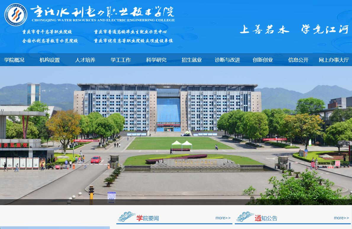 重庆水利电力职业技术学院是经重庆市人民政府批准、教育部备案的公办全日制普通高等学校。学校是国家级高技能人才培训基地、全国水利高等职业教育示范院校、重庆市骨干高等职业院校,重庆市优质高等职业院校和全国优质水利高等职业院校建设单位。学校始建于1964年,历经江津地区水利电力学校、永川地区水利电力学校、重庆市水利电力学校校名更替,2004年升格为全日制普通高等专科学校。学校坚持立德树人,注重协调发展,培养具有良好职业道德、职业精神、创新创业能力和实践技能,适应生产、建设、管理、服务第一线需要的高素质技术技能型人才。人才培养层次为全日制专科。学校2012年实现新校区整体搬迁,总占地面积达936亩,总建筑面积31万平方米,建成校内外实习基地272个,实验实训设备总值6100余万元,藏书近60万册,固定资产总额突破7亿元。学院现有教职工539人,其中专任教师268人,副高以上职称200余人、博士35人。有市级优秀教师1人,优秀中青年骨干教师 4 名;水利部职教新星6人、职教名师2人,双师型教师155人。学校在校生人数9200余人,生源地扩大到全国26个省(市、区)。毕业生就业率保持在96%以上,就业对口率达80%以上,职业期待吻合度达80%。毕业生对学校满意度达94%,用人单位对毕业生的满意度为90%。学校开设47个高职教育专业,涵盖水利、资源环境与安全、能源动力与材料、土木建筑、交通运输、装备制造、电子信息、文化艺术8个专业大类。学校紧扣国家和重庆发展战略,适应大数据和智能制造产业需求,与央企中国普天集团合作,组建大数据产业学院;与德国工商大会(AHK)合作,引入德国双元制职业教育培养模式,组建中德工程师学院,打造电子信息和装备制造类专业群,形成“一特一优三支撑、八大门类同发展”的专业结构布局。着力深化产教融合,深入推进校企合作,建有重庆水利水电职业教育集团,是教育部现代学徒制试点单位、全国高等职业院校“一校一品”示范基地。学校坚持立德树人,实现全程育人。围绕“两室一堂”,建立完善学生上课随机抽查、信息网络同步公示、“一课四责”、“一室四责”等制度,搭建“四级七维三测评”的大学生素质拓展平台,建立纵横交错的心理健康“四季网络预警五级干预”机制。学生到课率稳定在99%以上,学生上课怠学率长期稳定保护在0.25%以内,课堂教学互动反馈率长期保持在95%以上,教学目标达成度为95%以上。学生专业素质、职业素质和综合素养日益发展。近三年,学生参加职业技能大赛和创新创业大赛,获国家级奖项97项次、省部级奖项108项次。学校建有功能齐备的大学生创业孵化园区,培育孵化创新创业项目69个。是重庆市首批创新创业“双百”示范建设单位、重庆市大学生创业示范基地、重庆市创业孵化基地、重庆市众创空间、重庆市高校众创空间。学生参加“挑战杯”“互联网+”等市级以上创新创业大赛,获国家级银奖2项,铜奖2项,市级金奖5项,银奖4项。其中“行车应急宝”和“巴山老坛独家风味陈咸菜”项目获得“互联网+”创新创业大赛重庆市金奖,作为全市唯一一所高职院校入围全国总决赛项目,2个项目均获得国赛铜奖。学校通过“建机制、搭平台、强队伍、重服务”等多种有效途径,积极构建适应创新驱动发展战略要求的科技创新体系。近三年,学院对外技术服务到账额突破1000万元。成功获批国家级高技能人才培训基地,社会服务能力取得重大突破。开设40余种继续教育培训项目,具有职业技能鉴定工种70余个。具有全国建设行业技能型紧缺人才培养工程实施院校、全国水利行业特有工种职业技能鉴定站、重庆市水利行业干部培训中心、重庆市水电行业国家职业技能鉴定所等资质。学校文化特色鲜明,弘扬“上善若水,学竞江河”校训,构建水文化、名人与水、水哲学思想的环境育人体系,将水文化建设与人才人格品质培养相结合。学校是重庆市文明单位,重庆市依法治校示范校。近三年,学生参加市级以上文体活动获集体荣誉30余项、个人奖项200余项。学校广泛开展国际交流与合作,是中泰职教联盟副理事长单位,组织开展10余项对外合作项目,与泰国南邦职业学院等5所高校开展国际教育合作,首批17名留学生到校入学,与泰国黎逸技术学院共建大禹学院,积极服务国家“一带一路”战略。学校将紧紧抓住国家高度重视职业教育、高度重视水利发展、高度重视重庆经济发展的三大历史机遇,立足永川、服务重庆、面向西部、辐射全国,坚持教学和科研并举,实施“稳定规模,强化内涵,突出特色,文化引领”四位一体同步推进发展战略,力争达到国家级示范高职办学水平,成为西部领先、全国有影响的水利类高职院校。