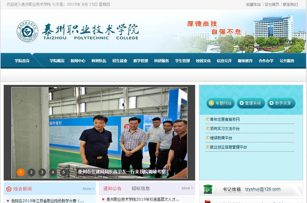 泰州职业技术学院坐落在泰州市国家级医药高新区——中国医药城,是1998年3月经原国家教委批准建立 的公办普通高校,也是江苏省第一所冠以“职业技术学院”名称的院校。办学历史近60年,为江苏省文明校园、江苏省高等学校和谐校园、江苏省园林式学校、教育部人才培养工作水平评估“优秀”等级院校,江苏省示范性高职院校建设单位。学院占地面积1060亩,规划总建筑面积33万平方米,一期完成建筑面积27.5万平方米,是全国一流的现代化高职校园、生态校园、智慧校园。学院设有机电技术学院、医学技术学院、经济与管理学院、信息技术学院、药学院、建筑工程学院、艺术学院和基础科学部、思政理论教学部等7院2部,开设专业35个。 现有教职员工670人,其中教授、副教授职称的187人。全日制各类在校生近10000人。学院始终坚持服务地方发展的办学传统,紧贴江苏及泰州区域经济和社会发展对人才的需求,深化教育教学改革,做强专业。药物制剂技术、建筑工程技术专业为国家重点建设专业,机电装备制造技术、医药服务、电子信息等3个专业群为省级重点建设专业群,护理、建筑工程技术、建筑装饰工程技术、计算机应用技术、机电一体化技术等5个专业为省级特色专业。学院建有国家级护理实训中心、国家级计算机应用技术实训基地,3个省级实训基地,各类专业实验、实训室111个,与企事业单位共建学生实习就业基地233家。建有江苏省数控机床工程技术研发中心等7个省、市级工程技术研究中心。设有国家职业技能鉴定所,能开展30余项职业技能培训和鉴定。学院秉承“厚德尙技 自强不息”的校训,以提高学生职业能力和素质为核心,鼓励学生个性发展、促进学生全面发展,努力培养具有 创新精神和实践能力的高素质技术技能人才。近年来,毕业生当年就业率始终保持在98%以上,毕业生用人单位满意度均在95%以上,学院连续4次(8年) 被评为江苏省高校毕业生就业工作先进集体。在新的历史时期,学院将坚持 “服务好地方,发展好学院,关心好师生” 的办学理念,根据现代职业教育体系发展方向,围绕地方高素质技术技能人才培养中心、中小企业技术服务 中心、继续教育学习中心、先进文化传播中心和地方党委政府决策智力支持中心的办学定位,努力把学院建设成为国内有影响、省内有地位的开放型、创新型的高职院校。
