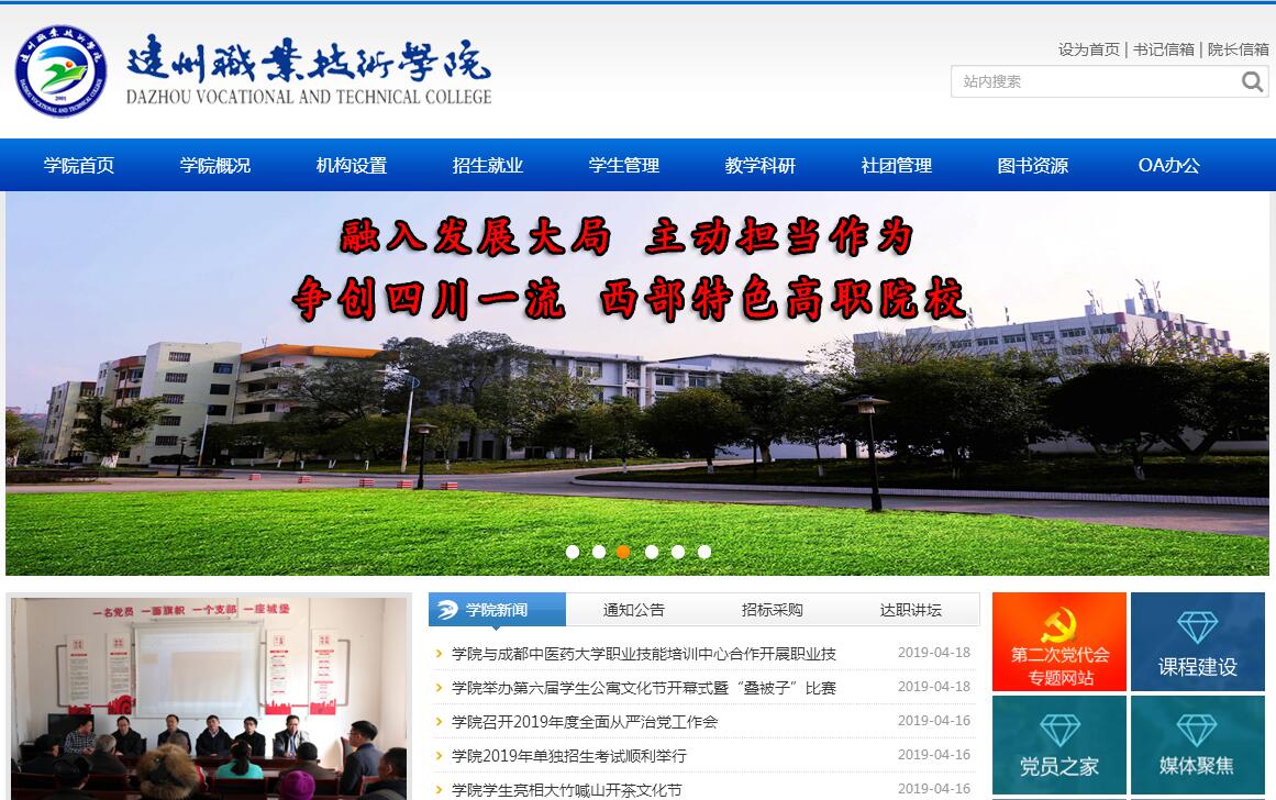 达州职业技术学院是一所综合性全日制国办普通高等学校。学院占地面积1020亩,建筑面积33万平方米,固定资产26000余万元,教学、科研仪器设备总值7074万元。图书馆现有各类图书文献资源101万余册,中文期刊628种,拥有数字资源容量13748GB。建有附属医院2家,非直属附属医院3家,非直属乡镇(社区)附属医院6家。建有中央财政支持的护理实训基地和数控实训基地、机电教学实习基地、畜牧兽医教学做一体化基地,建有校外实习基地177家。学院现设9系4部,开设有医药卫生类、教育类、农业类、加工制造类、现代服务类、艺术类等专业40余个,重点建设了护理、畜牧兽医、临床医学、学前教育、机电一体化技术等专业(群)。现有全日制在校学生1.4万余人(大专生1.2、中专生0.2万余人)。在职教职工558余人,专任教师492人,正高级职称22人,副高级职称135人,博士、硕士研究生87人,双师素质教师337人,达州市学术技术带头人2人,达州市有突出贡献优秀专家1人,来自行业、企业的兼职教师227人,聘请了一批知名专家、学者为客座教授。学院是四川省级示范性高职院校、四川省文明单位、四川省高校依法治校示范学校、四川省职教工作先进单位、四川省五一劳动奖状单位、四川省普通高等学校毕业生就业工作先进单位、四川省现代学徒制试点学校、达州市农村干部培训学校。学院是中央财政支持的国家级紧缺型护理人才培训基地、省(市)劳务开发培训基地、全国电子产品营销员统一鉴定培训考核点、国家级职业技能鉴定站、达州市继续教育基地、达州煤矿安全培训中心,达州市驾驶员继续教育中心。长期的实践探索走出了一条服务川陕革命老区、秦巴连片特困地区经济社会发展和民生改善的特色办学之路。学院紧紧抓住市委、市政府“加快建设四川东出北上综合交通枢纽和川渝陕结合部区域中心城市、争创全省经济副中心”的重大历史机遇,秉承“立德、敬业、勤学、善作”的校训,坚持“植根老区,面向秦巴,对接产业,服务民生”的办学理念,以新校区建设为契机改善办学条件,以创新体制机制为动力激发办学活力,以重点专业建设为根本提高办学水平,以人才培养模式创新为重点提升育人质量,以功能拓展为抓手提升社会服务能力,争创四川一流、西部特色高职院校。