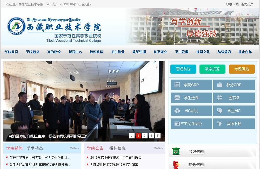 西藏职业技术学院是于2005年7月经自治区人民政府批准,在原西藏自治区农牧学校和西藏自治区综合中专学校的基础上合并组建而成。2006年9月正式挂牌,隶属自治区教育厅。学院现有西、北两个校区和一个实践教学示范基地,校园占地面积439亩,校舍建筑面积15.01万平方米。馆藏纸质图书38万余册,教学仪器设备总值近4000万元,固定资产2.54亿元,校内实验实训室88个,校内实训基地1个,校外实习基地66个。学院现有农业科学技术学院、动物科学技术学院、旅游与文化学院、机电工程技术学院、经济管理学院、信息工程学院、建筑工程学院及基础教育部、继续教育部和中央农业广播电视学校西藏分校等10个教学部门;设有教务处、办公室、人事处、学生工作处、招生与就业处、后勤服务中心、共青团西藏职业技术学院委员会等7个职能部门,设有校企办(科研管理科)、教学督导室、现代教育技术中心、图书馆4个直属科室。另外,教育部、财政部网络教育数字化学习资源中心典型应用示范点及西藏自治区国家职业技能鉴定一所和全区重点建设职教师资培训基地也设在我院。学院现有32个专科专业,包括农林、畜牧、电力、建筑、电子、财经、旅游、艺术等八大专业类别。其中国家示范性重点建设专业4个(作物生产技术、畜牧兽医、旅游管理、发电厂及电力系统),自治区级重点建设专业4个(建筑工程技术、汽车检测与维修技术、物流管理、园艺),2个自治区人才培养模式改革试点专业(旅游管理,汽车检测与维修),2个提升专业服务产业发展能力建设项目专业(计算机网络技术、设施农业技术)和1个自治区级特色专业(作物生产技术)。学院现有在册学生(员)5039人,教职工367人,其中专任教师304人。专任教师中副教授以上职称81人,讲师86人,硕士68人,博士2人。有自治区级优秀教学团队2个,国家优秀教师2人,自治区优秀教师和教学能手7人,1名辅导员获得“2011全国高校辅导员年度人物”大奖。获得“双师”素质教师资格120人,校外聘请行业企业兼职教师90人。教师队伍结构日趋合理、素质逐渐优化,专兼结合的“双师”结构教学团队逐步形成。学院组建以来,始终坚持以贯彻落实《教育部关于全面提高高等职业教育教学质量的若干意见》(教高[2006]16号)精神为指导,紧紧抓住国家大力发展职业教育的历史机遇,全面贯彻党的教育方针,紧紧围绕西藏 “提升一产、壮大二产、做强三产”经济发展战略要求,按照“学院稳定发展,学生健康成长,教育和谐进步”这一根本目标,坚持“以品行塑造人才,以技艺雕凿人才,以素质打造人才”的办学理念,树立“改革发展与内涵建设并重、规范管理与示范引领并进”的建设思路,秉承“质量强校、特色兴校、品牌立校”发展之路,按照“夯实基础、打造亮点、凸显特色”三步走战略,不断深化管理体制、办学模式和教学改革,使学院在短时间内实现了从中职到高职办学模式和管理体制的转型,特别是通过迎评促建工作和国家示范院校建设项目的实施,极大地改善了学院办学条件,加快了内涵建设步伐,办学实力和人才培养质量显著提升,教学管理水平明显提高,办学特色初步形成,呈现了良好的发展局面。近几年毕业生平均就业率达到95%以上,“双证书”获取率达到85%以上,学生在全国各类技能大赛中先后获奖90多人次。同时,学院的发展也得到了教育部、区党委、政府及教工委、教育厅的高度重视。教育部,区党委、政府,自治区教工委、教育厅领导曾多次到学院检查指导工作,对学院的建设和发展给予了大力支持。2008年,我院被国家教育部、财政部确定为国家100所示范性高等职业院校。2009年10月,顺利通过高职高专院校人才培养工作水平评估。2011年6月,学院通过了示范校建设项目国家级验收。