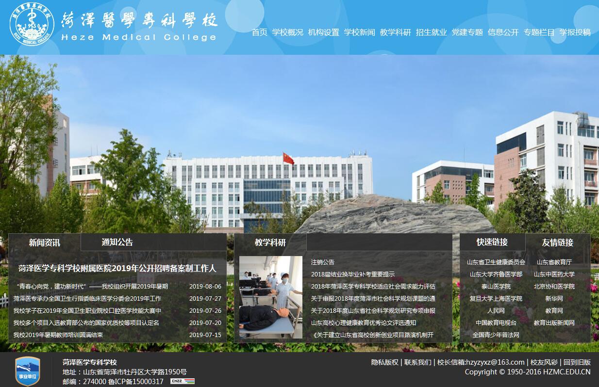 菏泽医学专科学校建校于1950年,为全日制普通高等职业教育事业单位,隶属山东省卫生和计划生育委员会领导和管理。现占地面积88.18万平方米,教职工753人,在校生13320人,开设临床医学、口腔医学、护理、助产、药学、药品经营与管理、医学检验技术、康复治疗技术、眼视光技术、中医康复技术、医学影像技术、保险、老年服务与管理、老年保健与管理等14个专业,其中临床医学专业被确定为首批全国职业院校健康服务类示范专业,临床医学专业和护理专业为中央财政支持重点建设专业,临床医学专业、护理专业、助产专业为省级特色专业,拥有临床医学专业、药学专业、护理专业三个省级教学团队,健康照护专业群(护理、助产、老年服务与管理)为省级品牌专业群,拥有药理学、生理学、诊断学、内科学、内科护理学、外科护理学等29门省级精品课程。基础护理学、人体生理学、药理学、病理学与病理生理学为省级精品资源共享课程。学校为中医康复技术专业教学指导方案开发牵头单位。学校实验实训教学资源丰富。校内设有公共基础实验教学中心、机能学实验教学中心、形态学实验教学中心、临床技能实训中心、护理技能实训中心等15个,校内实践基地实训基地设备先进,功能齐全,管理科学规范,已达到国内先进水平。现有直属附属医院1所,直属康复养老护理中心1所,拥有非直属附属医院3所,校外实训基地总数达到116个。学校先后获得省级文明单位、省级文明校园、山东省普通高等学校教学管理先进单位、省级卫生先进单位、全省卫生科技教育工作先进集体、省级社会治安综合治理先进单位、山东省大学生暑期社会实践活动先进单位、山东省青年志愿服务先进集体、山东省“五四”红旗团委、菏泽市思想政治工作先进单位、菏泽市花园式单位、山东教育慈善奖先进单位等荣誉称号。