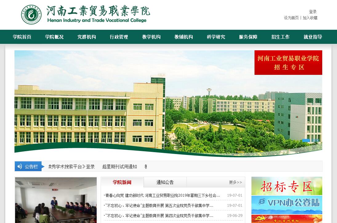 河南工业贸易职业学院是一所省属公办高等职业学院。学院具有具有悠久历史和深厚文化底蕴,1950年,学院的前身——河南省财政厅粮食干部训练班在当时的省会开封市组建。1953年省会迁郑之际,已更名为河南省粮食干部学校的新校也随之落户于郑州市优胜北路4号。1965年,河南省粮食学校宣告成立,与河南省粮食干部学校共同承担着全省粮食行业人才培养、干部培训的任务。1997年,学校再度易名为河南省经济贸易学校。2004年,经河南省人民政府批准,2005年,经国家教育部备案,在河南省经济贸易学校的基础上,组建河南工业贸易职业学院,学校由此迈入了普通高等院校行列。目前,学院分南北两个校区,占地面积35万平方米,总建筑面积21万平方米。现有8个教学系部,35个专业(方向),其中省级重点专业1个,省级特色专业1个。拥有校内实验实训中心(室)52个,其中国家级实训基地1个,省级示范性实训基地4个;校外实习基地54个。是全国营销员资格考试、全国物流师资格考试、全国计算机等级考试等8个能力考点及培训点,设有全国粮食行业特有工种技能培训中心和国家职业技能鉴定所。学院现有固定资产总值20009.2万元,教学仪器设备总值4130万元。学院图书馆馆藏图书50余万册。学院拥有设施齐全的公寓式学生宿舍、学生和教工食堂、标准体育运动场等。良好的办学条件为学院提高人才培养质量奠定了坚实的物质基础。学院始终把加强师资队伍建设作为首要的战略任务,坚持“持久抓,抓持久”。学院现有教职工412人,其中,高级专业技术职务教师64,硕士研究生以上学历教师72人,“双师型”教师159人,有6名教师被命名为省级学术技术带头人,10名教师被评选为省级骨干教师、省级优秀教师,10余名教师在省级以上学术团体中担任会长、理事、主任、副主任、秘书长等职务。一支结构合理、师德高尚、业务精通、治学严谨的高素质师资队伍,为不断提升学院教育教学质量提供了可靠保障。学院始终坚持把严格严谨的办学传统渗透在日常教育教学的方方面面,突出加强专业建设,不断完善教学质量评估和监督制度、督导巡视制度、信息反馈制度,形成了富有成效的人才培养质量监控体系。 学院始终坚持 “以教学带科研,以科研促教学,以教研科研育人才”的方针,使教师队伍拥有较强的教研科研能力,并取得了丰硕的教学科研成果。近两年来,全院教职工承担省部级、厅局级教科研课题90余项,在公开刊物上发表学术论文800余篇,公开出版专著、教材、教辅读物近160部,有3项教科研成果获省部级奖励。学院积极面向国内外实施开放办学战略,先后与四川大学、南开大学、首都师范大学开展远程本科教育、在职人员攻读硕士研究生学位教育等合作项目,与加拿大麦迪逊·海特学院、德国F+U萨克森职业培训学院、英国哈珀·亚当斯大学等海外高校开展交流合作,形成了立足河南,面向全国,走向世界的开放型办学格局。在办学思想上,学院把提高学生的就业创业能力,视作学校的声誉和生命力之所系;在办学模式上实施“订单式”培养,确保人才培养与社会需求同步;在办学机制上实行更加灵活的教学管理制度,开展工学交替实验,重视复合型技能型人才培养,注重提高学生的综合素质和职业技能。坚持走产学合作之路。一是坚持大力推进校企合作,建立和不断完善产学合作教育的领导体制和运行机制,增强学院办学活力;二是积极实施“双证书”、“多证书”制度,强化学生职业能力培养;三是高度重视实践性教学,积极推行“仿真实训”、“生产型实训”和“顶岗实习”,有效地提高了学生的职业技能。学院被国家人力资源和社会保障部授予“国家技能人才培育突出贡献奖”,被国家粮食局授予“粮食行业技能人才培育突出贡献奖”、“全国粮食系统四五普法先进单位”,被教育部评为“全国职业技术学校职业指导工作先进学校”,被中国教育学会授予“全国职业教育管理创新学校”称号,被社会公众评为“河南省最具影响力的十佳职业院校”。2008年,在全国高职高专人才培养水平评估中,我院被评为“优秀”等级。被中共河南省委、河南省人民政府命名为“省级文明单位”。雄厚的师资、一流的设施、优美的环境、浓厚的育人氛围,使学院成为师生理想的学园、舒适的家园、育人的乐园、优美的花园、安全的校园。