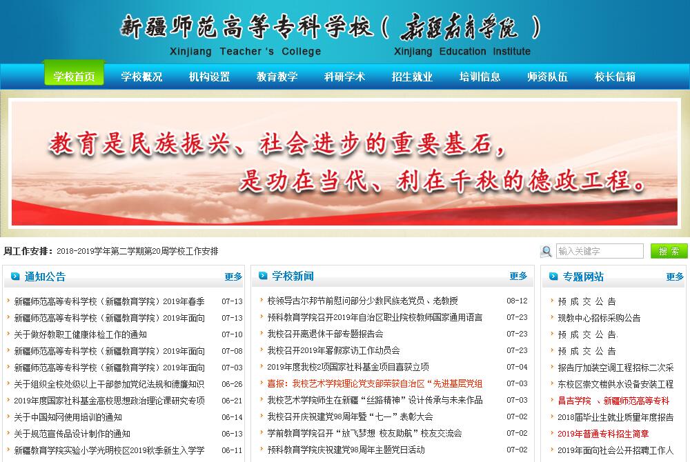 新疆师范高等专科学校(新疆教育学院)是一所专门为新疆培养学前师资、基础教育师资和双语师资的师范院校,被誉为“新疆中小学教师的摇篮”。学校是全国民族团结进步先进集体、全国文明单位。新疆师范高等专科学校(新疆教育学院)是一所具有百年历史和深厚文化底蕴的师范院校,其前身是创办于1906年的新疆师范学堂,1934年更名为省立迪化师范学校,1954年更名为乌鲁木齐第一师范学校,1978年升格为新疆教育学院。1989年,新疆广播电视师范大学并入新疆教育学院。2003年,新疆工业技术学校并入新疆教育学院。2012年,成立新疆师范高等专科学校,与新疆教育学院实行“一套机构,两块牌子”。2012年12月,新疆幼儿师范学校并入新疆师范高等专科学校(新疆教育学院)。学校现有四个校区,占地795亩。教职工836人,专任教师553人。专任教师中,具有高级专业技术职务143人(正高专业技术职务18人),高级专业技术职务的教师占专任教师总数的34.1%;具有研究生学位教师233人,占专任教师总数的55.6%。现有在校生9347人,其中普通专科生5546人。现有专业48个,涵盖教育学、文学、艺术学、管理学、理学、工学、法学、经济学等学科门类。设有双语学院、教育科学学院等15个学院(部)。学校不断强化教学工作中心地位,大力推进教育教学改革,创新人才培养模式,重视实践教学环节。近年来,学校已建成校级精品课程30门、校级特色专业16门、自治区级精品课程5门、自治区特色专业2个、自治区重点实验室1个、国家精品视频课1门、自治区提升专业服务社会能力项目1项。拥有一批相对固定的校内外实习实训基地。学校高度重视学生应用能力和创新精神的培养。近年来,学生先后在“创青春”全国大学生创业大赛、“挑战杯”全国大学生课外学术科技作品新疆区竞赛、全国信息技术应用水平大赛、全国职业院校技能大赛、全国高职高专英语课堂教学大赛、全国大学生创业计划竞赛、全国大学英语教学大赛、全国高校微课教学比赛、全国大学生健美操艺术体操锦标赛以及新疆双语教学基本功大赛、自治区大学生田径运动会、自治区大学生排球赛、自治区大中学生武术比赛等全国、自治区重要赛事中获得优异成绩。学校重视科研工作。“十二五”期间, 学校共获得省部级以上科研课题129项,出版专著、译著21部,发表论文1032篇,其中核心期刊133篇。《新疆教育学院学报(汉文版)》入选“全国高校优秀社科期刊”,其中“双语栏目”被评为“全国高校社科特色栏目”。拥有“新疆双语教育研究中心”、“学前教育研究中心”、“小学教育研究中心”。学校专门设置“基础教育研究所”,自治区宣传部社科办“新疆社科基金项目成果转化与推广中心”等14个自治区级、校级研究机构和科研实体。学校拥有固定资产4.62亿元,教学仪器设备值5884万元,图书69万册。拥有万兆校园网(联网计算机6000余台)、多媒体教室、语音室、电子阅览室、专业实验室等公共服务体系,数字资源总量6TB。学校是新疆学前教师、中小学教师、双语教师和教育管理干部人才培训的基地和中心。新疆双语培训基地、新疆中小学教师继续教育中心、新疆教育行政管理干部培训中心、新疆学前教育研究中心、新疆中小学德育研究中心、新疆中小学教师计算机培训考核中心、新疆中小学双语教材研究中心、新疆双语教学质量监测评价中心均挂靠我校。长期以来,学校充分发挥培训基地的作用,为新疆培训了大批德才兼备的优秀人才。“国培计划”、中小学校长“十百千”工程、一年制、两年制中小学教师国家通用语言达标培训及中小学教师专业技能提高培训等已经成为学校的品牌培训项目。今天的新疆师范高等专科学校(新疆教育学院)站在了新的起点上。维护新疆社会稳定和长治久安的新常态,中央新疆工作座谈会精神的贯彻落实,国家“一带一路”战略的推行,使新疆经济社会进入了新的发展时期,新疆教育事业发展的前景更加美好。面向未来,学校以建立教师教育、语言教育特色鲜明的院校为目标,立足新疆,面向丝绸之路沿线国家,致力于将学校建设成为区内学前教师、小学教师、双语教师和语言类人才培养培训和研究的重要基地。