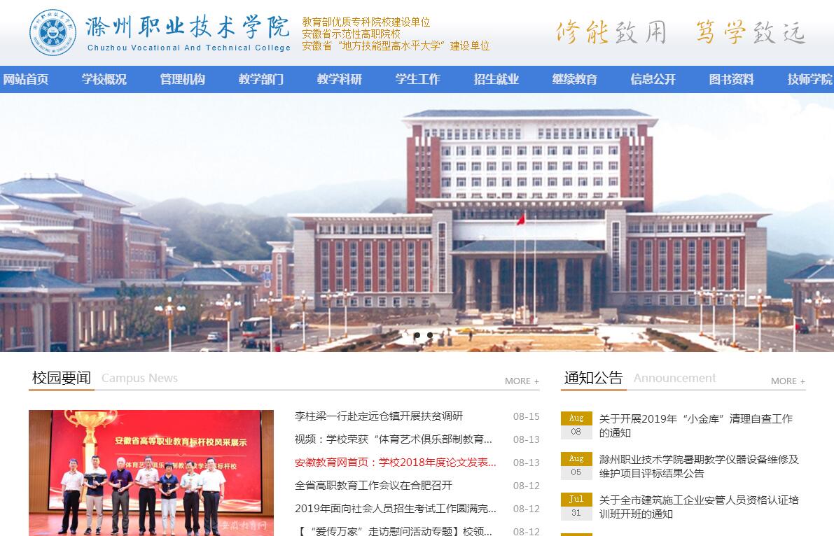 滁州职业技术学院是滁州市人民政府举办的综合性普通高等职业院校。学院位于皖东历史文化名城、南京都市圈和合肥经济圈核心城市——滁州市,紧邻国家4A级风景名胜区琅琊山和四大名亭之首醉翁亭。学院成立于2002年7月,是教育部优质专科学校建设单位、省级示范性高等职业院校、安徽省“地方技能型高水平大学”建设单位、连续八年荣获全省就业工作“先进集体”和“标兵单位”称号、连续两次被省政府表彰为全省就业工作“先进单位”、省级大学生创新创业教育示范校、省级大学生创业孵化基地(AA级)。现有各类全日制在校学生13140人,教职工673人。校园设施功能齐全,实习实训条件优越。学院现有龙蟠校区、清流校区两个校区,占地总面积1140亩,建筑面积31万平方米,固定资产总值6.3亿元。新校区龙蟠校区坐落于滁州市城南科教园区,校园环境优美,设计新颖,教学楼、图书馆、综合实训大楼、现代化运动场、大学生创业孵化基地等配套齐全。学院建有机械加工、数控技术、计算机软件开发等9大实训中心,下辖实验实训室93个,教学仪器设备总值1.2亿元。其中,中央财政扶持实训基地2个,省级示范性实训基地2个,省级人才培养创新实验区1个。学院生均教学仪器设备值近万元,居省内同等院校前列。专业设置科学合理,内涵建设特色鲜明。学院立足地方办学。设有机电工程系、土木工程系、信息工程系、经济贸易系、汽车工程系、食品与环境工程系、传媒工程系、基础部、体育部、安徽滁州技师学院等10个教学单位,设置高职专业45个,其中有28个专业与滁州市的智能家电、先进装备、新型化工、新能源、农副产品深加工、硅基材料等六大支柱产业结构相吻合。学院建有中央财政扶持的提升专业服务产业能力专业2个,省级重点建设专业3个,省级特色专业6个,省级综合改革试点专业1个,省级精品课程3门,省级精品资源共享型课程1门。教师队伍结构优化,教学科研成果丰硕。学院坚持“办学以教师为本”。现有专任教师547人,其中,具有正高职称18人,副高职称129人,具有硕士及以上学位教师326人,双师型或具备“双师素质”教师218人,有省级教学团队5个,省级专业带头人10名,省级教学名师3名,省级优秀教师2名,省级教坛新秀9名,有1名教师入选安徽省“卓越人才”培养计划。“十二五”期间,学院教师出版专著9部,主编和参编教材215部,发表论文千余篇,承担科研项目205项,其中国家级2项,省部级课题36项,获得国家发明专利2项、实用新型专利69项。合作办学深入推进,办学模式不断创新。学院积极开展校企合作、校地合作和校际合作。连续19年与德资企业博西华(博世-西门子)公司合作,采用德国“双元制”人才培养模式培养高技能人才,并积极探索“双元制”模式中国化的方法和途径,得到了国务院副总理刘延东的充分肯定。学院加强与滁州市及所辖县市区的14个经济技术开发区、工业园区的合作,成立了校地合作委员会。2013年7月,学院牵头成立安徽滁州职教集团,并当选首任理事长单位。学院通过职教集团平台加强与区域行业企业合作,助推经济社会发展,加强与区域内中等职业学校在专业对接、课程衔接、师资培训、协同科研创新、实训资源共享等方面的合作,引领区域中高职协调发展。就业工作成绩突出,服务地方成效显著。学院毕业生就业率始终保持在98%以上,先后两次(2008-2009年度、2010-2011年度)被安徽省就业工作领导小组评为全省就业工作先进集体,2005年至今连续八年被评为“安徽省毕业生就业工作先进集体”和“安徽省毕业生就业工作标兵单位”。 学院创建以来已为社会培养输送各类毕业生22344名。2009年,经安徽省人民政府批准,学院设立安徽滁州技师学院,培养预备技师、高级技工等高技能人才。学院设有国家职业技能鉴定中心,可开展89个工种的中、高级职业技能等级鉴定服务。近5年来,学校累计开展各项职业技能培训23000人次,各工种的职业技能鉴定26000余人次。综合实力不断增强,办学声誉持续提升。学院发展得到了上级部门和领导的重视支持和肯定。先后荣获教育部高职高专院校人才培养工作水平评估优秀院校、安徽省“双师素质”软件类师资培训基地、安徽省就业工作先进集体、安徽省创新创业示范校、省级大学生创业孵化基地(AA级)、滁州市文明单位、滁州市市直企业招工帮办服务先进单位等荣誉。2013年5月22日,中共中央政治局委员、国务院副总理刘延东视察学院,对学院人才培养工作给予了充分肯定,并对学院提出“将来要争取成为全国的示范典型”的要求与期望。2015年,学院以优秀等次顺利通过省示范性高职院校建设项目验收和人才培养工作个性评估,被立项为安徽省首批“地方技能型高水平大学”建设单位。学院将秉持“立德树人”的办学宗旨和“修能致用、笃学致远”的校训精神,立足滁州,服务安徽,面向“长三角”,坚持地方性、技能型、合作式发展路径,以内涵求发展、以特色求发展、以创新求发展,努力把学院建成“省内一流、国内知名、特色鲜明”的地方技能型高水平大学。