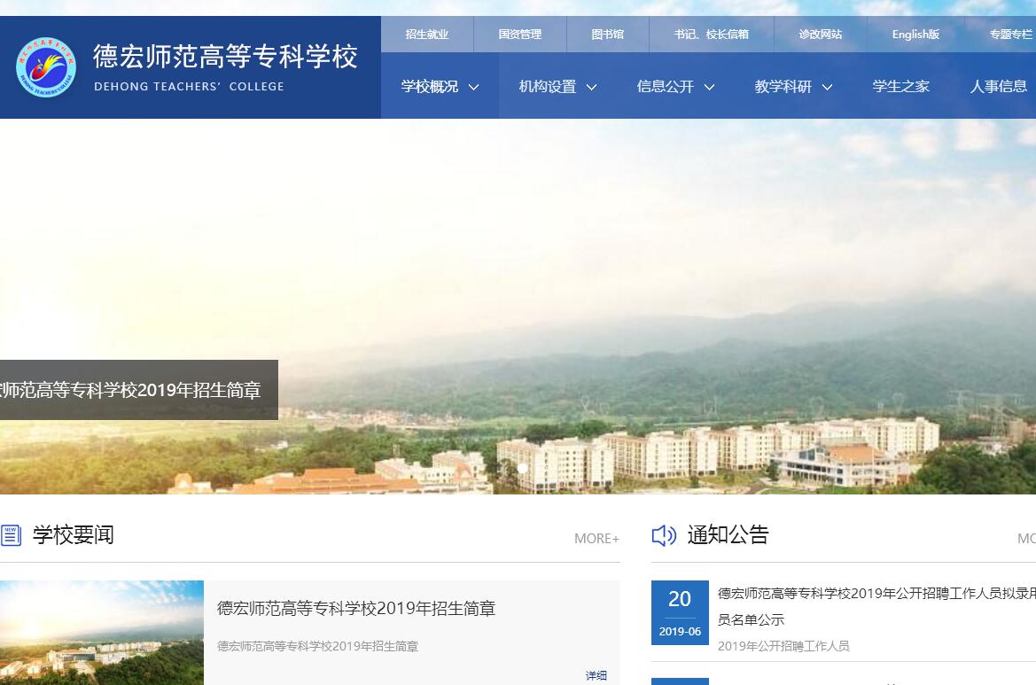德宏师范高等专科学校是由云南省人民政府举办,云南省教育厅主管的普通高等专科学校。学校位于云南省德宏傣族景颇族自治州州府芒市,其前身为创办于1955年的德宏州民族师范学校、1958年的德宏州农校和1978年的德宏师专班;1984年4月经云南省人民政府批准,在德宏师专班基础上成立德宏教育学院。2004年、2006年德宏州民族师范学校、德宏州农业学校分别整体并入德宏教育学院。2006年在德宏教育学院基础上组建德宏师范高等专科学校。目前,现有土地1095.20亩(新校区975.89亩、老校区119.30亩),校舍总建筑面积25万平方米,其中,老校区4.7万平方米,新校区20.3万平方米。学校总资产10亿余元,其中教学科研仪器设备价值10640.19万元。有图书66.6886万册,电子图书20万种。学校共有教职员工428人,有专任教师363人,其中正高职22人、副高职100人、博士研究生6人(10人在读)、硕士研究生223人;学校教师获国务院特殊津贴2人,获云南省政府特殊津贴4人,云南省突出贡献优秀专业技术人才奖4人,第八届中国青年科技奖1人,云南省教育功勋奖1人,云南省省级教学名师4人,云南省学术带头人2人。另有缅甸籍、澳大利亚籍教师各1人。学校开设教师教育类专业15个,高职类专业42个。面向云南、湖南、湖北、四川、重庆、广西、贵州、广东、福建等省区招生。现有在校学生6443人,外国留学生105人。同时,学校不断加强与省内外高校的合作,共同举办成人函授教育、远程教育和在校生套读自考本科等多种形式的成人学历教育,共有各类成人学生1000多人。学校秉承“德学思行,智真善美”的校训,立足德宏,面向云南,辐射周边国家,服务德宏经济社会发展和瑞丽国家重点开发开放试验区建设,经过多年的办学实践探索,构建了“1221”人才培养模式,凝练“三性一化”(民族性、师范性、应用性、国际化)办学特色。坚持产教融合、校企合作、工学结合,强化教、学、练、做相融合的教育教学活动。多层次、多形式地与中小学校、企业进行师资、设备、培训、教学等方面的交互合作,形成合作育人,共同发展的双赢格局。建立校校合作、校企合作的工作机制,确定相应管理机构,明确工作职责,形成工作方案,为校校合作、校企合作工作的开展奠定组织基础。开拓创新,与时俱进,努力为基础教育培养合格教师,为促进地方经济社会发展培养高素质人才。近几年以来,学校获得云南省教学质量与教学改革工程项目53项,其中包括4位教学名师、3个教学团队、3个名师工作室、2个特色专业、4门精品课程、8门规划教材、4门精品教材、3门优秀教材、4个校外实习实训基地、4 个教学改革项目、2个高等职业教育教学研究项目、1 个大学外语教学改革项目、2 个提升专业服务产业发展能力建设项目、1 个基础能力建设项目、8个小语种项目;出版专著72部、出版教材39部;在核心期刊发表论文237篇,在外文期刊发表论文14篇;主持国家级项目5项;主持省部级项目16项,地厅级项目117项;教学科研成果获奖143项;获省委、省政府各级各类奖项4项,厅级奖励60项;有专利66项,有决策、咨询报告107个。面向区域发展,学校建立食用昆虫研究所、民族教育研究所、民族医药研究所、孟中印缅研究所、法学研究所等科研机构,积极到农村开展食用昆虫养殖等知识培训和技术指导,拓展精准扶贫路径,取得了良好的社会效益和经济效益,为农民发家致富起到引领和示范作用。2011年至2016年,毕业生就业率达94%以上。2011年至2015年,连续五年获云南省高校毕业生就业工作目标责任考核二等奖。2013年,由于毕业生就业工作宣传到位,措施有力,成效显著,学校获云南省高校毕业生就业工作创新奖。60多年来,几代德宏师专人立足边疆,艰苦创业,先后培养了37000多名毕业生,为德宏经济社会发展做出了突出贡献。为全州基础教育培养了一大批“下得去、用得上、留得住”的骨干教师和教育管理人才;为全州各行各业培养了一大批政治素质好、文化素质强的少数民族干部,其中不乏州县各级领导。学校办学实践得到了社会的认可,办学成绩受到了上级部门的表彰和奖励。2010年,学校通过教育部高职高专院校人才培养工作评估。2013年、2017年,学校分别获云南省第七届高等教育教学成果二等奖,云南省第八届高等教育教学成果一等奖。2015年,学校被云南省高校工委认定为云南省高校思想政治理论课建设优秀等级学校。2009年、2012年、2015年三次被省委、省政府授予“省级文明单位”荣誉称号。先后被德宏州委、州政府授予“平安校园”、“德宏州民族团结进步模范单位”、“禁毒防艾人民战争先进挂钩单位一等奖”、“学习型党组织建设工作示范单位”、“百强党组织”等荣誉称号。被省教育厅、省军区司令部、省军区政治部授予“学生军训工作开展20周年先进单位”;被省教育厅授予“云南省语言文字工作先进集体”、“用延安精神办学育人先进学校”、“高校绿化先进单位”、“园林示范单位”、“平安校园”、“三生教育”优秀学校、东南亚南亚语种人才培养示范点项目学校、体育教学达标单位;被被省政府授予“消防安全创建示范单位”。2010年,学校党风廉政建设责任制检查考评荣获优秀一等奖,受到省委通报表彰奖励。2013年、2014年、2015年连续三年被评为德宏州惩防体系建设暨党风廉政建设责任制优秀单位。学校继续保持了省