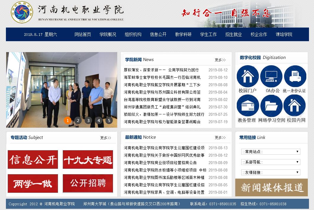 河南机电职业学院是省教育厅直属、公办全日制高等院校。学院始建于1953年,坐落于郑州南大学城,占地面积782.4亩,建筑面积40万平方米,教学仪器设备总值2.1亿元,图书35万册。学院下设12个二级学院,开设40个专业,与洛阳理工学院联合开设机械设计制造及其自动化等6个本科专业。学院现有专兼职教师586人,其中教授、副教授116人,博士学位教师30人,90%以上的青年教师具有硕士以上学位,“双师型”教师占全院专业课教师的98%,在校生15000人。河南机电职业学院始终坚持和深化产教融合、校企合作,围绕“一院一址、一址一品、一品一圈、一圈一点”的“四个一”工程建设,打造出有温度、有智慧、有生命的产、学、研、创职教生态圈。通过模式创新,与企业、行业深度融合发展,建成电气、智能、无人机、新能源汽车等12个产业学院;通过体系创新,把每一个产业学院都建成了产、学、研、创四个协同育人的综合体、融合体、命运共同体;通过体制创新,把产学研创综合体、融合体、命运共同体移植企业中或产业园区;通过场境创新,形成了既独立发挥作用又相互协同的产、学、研、创四个育人场境。学生在能教学的生产场境、能实训的教学场境、培养批判思维的研究场境、培养企业家素质的创新创业场境,由来自生产、教学、科研、创业的四种导师组成的教学团队,通过来自于四个真实场境的任务引领、问题导向、理实一体的融合课程,培养复合型的高技能人才。学院设有国际学院,开办机电一体化技术等专业,为学生提供留学深造、出国做交换生及国外就业等多元化发展途径。河南机电职业学院以其独特的办学模式和优良的办学成绩,获得了广泛好评和赞誉。中央电视台、光明日报、中国教育报、河南日报、河南电视台、大河报等新闻媒体曾多次关注报道。时任全国人大常委会委员长张德江、时任教育部副部长鲁昕、时任河南省省委书记郭庚茂、时任河南省副省长徐济超、河南省副省长霍金花等亲临学院视察,并对学院的办学成果给予了充分肯定和高度认同。
