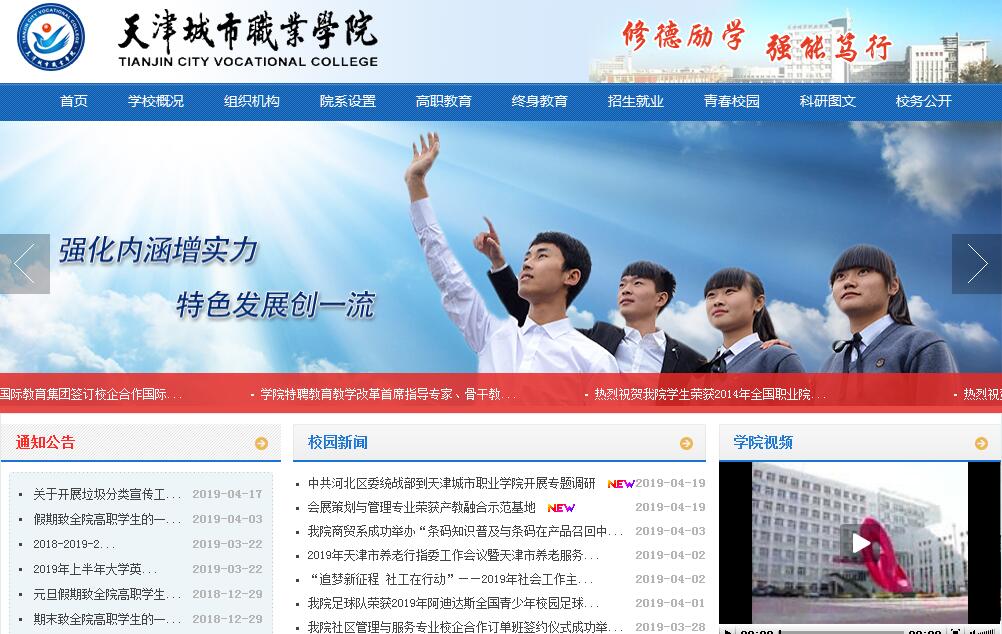 天津城市职业学院始创于1958年,是一所由政府主办的的多功能、社区性高等职业院校,各类学历在校生近万人。学院坐落于天津市中心城区,位于交通要道,交通便捷。50多年的发展历史积淀了深厚的文化底蕴,凝练了“自强、实干、团结、创新”的学院精神。学院曾荣获“全国成人高等教育先进单位”、 “天津市职业教育先进单位”等称号,是天津市高水平示范性高职院校建设单位。学院面向全国开展的高等职业教育,面向天津市开展的继续教育和面向河北区开展的社区教育构成了学院“一主两翼”的办学格局,成为了区域终身教育体系中重要的组成部分,在天津市高职院校中独树一帜,曾被教育部专家组誉为“天津职业教育三大亮点之一”。目前学院设有社区管理与服务、酒店管理、物流管理、电气自动化技术等24个高职教育专业,形成了以重点专业和特色专业为龙头,相关专业为支撑的社区服务、财经商贸、自动化技术、信息技术四个专业组群。拥有现代物流实训中心(中央财政支持)、社区管理基地(中央财政支持)、酒店管理基地(中央财政支持)、早期教育实训基地、会计综合实训中心,自动化技术综合实训中心(天津市财政支持)、数字艺术实训中心、社区养老管理与服务实训中心。包含虚拟企业财务运营中心、智能化楼宇、自动化生产线安装与调试、数码产品维修、数码钢琴等80余个实训室。建立了全国首家联想“3C服务中心”、校园故事咖啡厅、小时代生活馆等企业实景的实训室。学院依托“政校企(社)”联动平台,大力推行校企合作、工学结合、顶岗实习人才培养模式改革。与威德国际教育集团、天津泰达集团、北新动画公司、联想集团等多家大型知名企业合作,把企业实际项目搬进校园、企业技术骨干引进课堂,实施校企共育人才。学院以“塑城市职业学院学子形象”系列活动为载体,将专业技能培养与各类活动相融合,多措并举推进学生综合素质培养,促进全面发展,取得了显著效果。建有市级精品课程5门(其中精品资源共享课程2门),4个市级教学成果奖,多年来毕业生就业率和专业对口率在全市同类院校中保持较高水平。