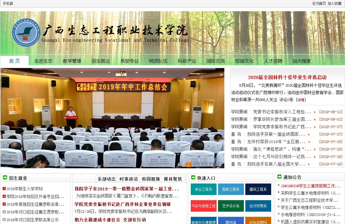 广西生态工程职业技术学院是广西壮族自治区人民政府举办,广西林业厅、教育厅管理的全日制普通高等学校,学校是自治区示范性高等职业学院、首批国家高技能人才培养示范基地、自治区特色高校、广西珍贵乡土树种良种培育中心、中国(南方)现代林业职业教育集团理事长单位。学校位于风景秀丽的柳州市柳北区,校园绿树环绕、湖光倒映,风景优美,是自治区“绿色大学”。学校创办于1956年,至2016年,学校已培养各类毕业生50000多人。学校占地面积18000亩,校园面积1100多亩,建筑面积30多万平方米,教学科研仪器设备资产总值6亿多元,图书馆藏书70多万册。学校设有林业工程系、园林工程系、建筑工程系、汽车与信息工程系、艺术设计系、经济贸易系、旅游与交通管理系、公共教育部等8个系(部),设有继续教育培训(职业技能鉴定)中心。2016年学校设44个招生专业,其中国家重点建设专业2个、国家林业局重点专业2个、自治区优质试点专业和特色专业11个,全日制在校生 8000多名。学校现有教师550多人,教师中博士10人、硕士150多人;教授20人,副教授80多人,“双师素质”教师160多人。拥有自治区优秀教学团队2支、广西创新人才培养教学团队1支、广西高校教学名师1人。学校设有教学实验林场、生物技术中心、林业调查规划设计院、木业公司、园林公司、林业教育贸易公司和君武森林公园等校办企业,满足相关专业实习(实训)的需要。近年来,学校着力打造具有“校中有场,场中有校,校场一体”特色的校内生产性实训基地,近年来相继建成建筑工程实训基地、园林大棚、物流实训中心、会计仿真中心、室内设计实训基地、汽车实训等16个校内实训基地,实训室100多间,其中,生产性实训基地7个。学校拥有中央财政支持职业教育实训基地3个、自治区示范性实训基地5个、国家林业局示范性实训基地1个,自治区高职示范特色专业及实训基地4个。此外,学校还与行业企事业单位广泛合作,建立了校外实训基地170多个。学校作为中国(南方)现代林业职业教育集团理事长单位,与芬兰斯道拉恩索公司、印尼金光集团、广西高峰林场等300多家大型企业建立了稳定的校企合作关系,开展合作办学。近年来,学校承担国家和自治区科研项目160多项,取得较大科研成果30项,获得省部级奖励近20项,培育林木良种1个,制定林业行业标准1项;获得专利24项,其中发明专利9项;出版专著11部,主编出版教材100多部,发表科研论文1400多篇,承担了广西珍贵乡土树种良种培育中心、广西林业科技服务平台、柳州市森林资源保护与利用重点实验室等3个平台建设。学校与美国俄亥俄州立大学、澳大利亚科工组织、澳大利亚农业中心、印尼特立沙帝大学、越南林业大学、越南东北农林高等专科学校等教学科研机构建立了友好合作关系,与美国俄亥俄州立大学合作开展林业碳汇研究,与澳大利亚科工组织合作开展桉树材性改良等研究项目。根据学生发展的需要,学校与全国重点大学—北京林业大学合作开展本科函授教育,与广西大学、广西科技大学等本科院校合作开展“专本衔接”自考专业多个,学生可根据自身实际选择报读,在获得大专毕业文凭的同时,可获函授(自考)本科文凭。学校开展职业技能培训鉴定工种近50个,学生可考取职业技能等级证书和职业资格证书。学校办学思路清晰、目标明确、措施有力、特色鲜明、业绩突出,自2004年以来,毕业生就业率均在96%以上,位居全区高校前列,连续13年荣获广西“全区普通高校毕业生就业工作先进集体称号”。学校坚定不移地坚持“树木树人,知行合一”的办学理念,坚持“立足林业,服务广西,面向全国,走向东盟”的发展方向,构建“以生态技术为龙头,以工程技术为主体,以管理服务为两翼”协调发展的专业体系,坚持“校行企合作,产学研结合”的发展道路,实施“品牌办学,开放办学,合作办学,质量立校,人才强校,创新兴校”六大战略,正在努力创建具有行业特色、国内一流、生态风格的高等职业技术学院,为广西生态文明建设、经济社会发展培养更多更高水平的高技能人才。