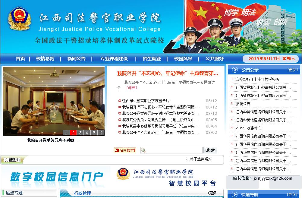 江西司法警官职业学院前身是1958年成立的江西政法学院(后分为三个学校,即江西省公安专科学校、江西省劳改警察学校和江西省司法学校),2000年江西省司法学校和江西省司法警官学校成建制合并为江西司法警官学校,2002年4月经省人民政府批准成立江西司法警官职业学院,并保留江西省政法干校的职能,因此,2009年,被中央政法委、中央组织部、教育部等15部委确定为“全国政法干警招录培养体制改革试点院校”。2013年5月,江西省机构编制委员会同意学院增挂“江西省司法厅警察训练总队”牌子。正所谓:大学者非大楼之谓。学院虽占地仅175亩,但校园设施完善,布局合理,绿化美化,十分宜人。学院教学科研设备完善,拥有现代化教学监控系统,建有汽车驾驶训练场、警务技能训练中心、法律职业技能实训中心、多媒体教室、刑侦实验室、语音室、计算机中心、塑胶田径场、篮球场、排球场等教学、生活配套设施,馆藏图书60余万余册。现有在编教职工229人;现有在校学生7400余人。更有一支优良的教师队伍:有副高以上职称资格的教师114人,有律师、会计师、心理咨询师等“双师型”教师86人。有江西省高等学校教学名师4名,江西省高校中青年学科带头人1名,江西省高校中青年骨干教师8名,2个省级教学团队(行政原理与实务和行政管理)。学院自升格以来,以“博学、明法、求实、创新”为校训,注重内涵建设,无论专业、课程还是教学科研均有不错的建树:专业建设:有1个教育部、财政部重点建设专业(书记官),有3个省级示范专业(法律事务、刑事执行、司法警务),有5个省级特色专业(法律事务、刑事执行、书记官、司法警务、法律文秘);有2个中央财政支持职业教育实训基地建设项目(刑事执行、司法警务),1个省财政支持的实训基地项目(法律职业技能),有2个省级人才培养模式创新实验区(监狱管理、速录)。课程建设:有1门国家级精品课程(《行政法原理与实务》),7门省级精品课程(《行政法原理与实务》、《民法原理与实务》、《法律原理与技术》、《计算机应用基础》、《管理学》、《中文亚伟速录》、《大学语文》,7门省级精品资源共享课(《行政法原理与实务》、《中文亚伟速录》、《民法原理与实务》、《刑法原理与实务》、《思想道德修养与法律基础》、《法律文书》、《图形制作》),有6门司法部部级精品资源共享课程(《法律原理与技术》、《中文亚伟速录》、《民事诉讼法原理与实务》、《证据法》、《司法警察概论》、《经济法原理与实务》)。教学科研:学院有1项国家级教学成果二等奖,2项省级教学成果一等奖,有1项省级优秀教材一等奖,有2项省级教学成果二等奖。有1个国家职业技能鉴定所。警务技能方面: 2004年,在江西省武术散打锦标赛上,获得高校组团体第1名;2008年,参加江西省散打锦标赛,获得团体第二名,总分并列第一名;2014年,参加第十四届省运会,荣获高校专科组团体冠军;2017年,参加全国大学生武术散打锦标赛共取得1个冠军、2个亚军、1个季军、3个第五名的好成绩。速录技能方面:近年来,学院师生代表队在参加一系列速录大赛中多次获得团体一等奖、二等奖,廖宇琴同学以652.92字/分钟的成绩打破了汉字速录的世界纪录,杨茗茹老师殷亮亮同学入选中国国家队并在国际比赛中取得好成绩。学院在管理方面实行严格的警务化管理,学生在校统一着人民警察服装,高标准地培养学生的综合素质。办学几十年,学院向社会输送了大量具有较高素质的法律人才,毕业生就业率在全省高校中居于前列,每年考取公务员的人数在全省高职院校名列前茅,毕业生遍布全省各公、检、法、司等部门,已有大批成为单位的业务骨干,不少还走向了领导岗位,并涌现了张献、李文华等英雄人物。2014年,党的十八届四中全会就全面推进依法治国作出重大决策部署,开启了法治中国建设的新征程。党的十八届四中全会《决定》指出,要创新法治人才培养机制。省委《关于全面推进法治江西建设的意见》,也对“提高法治人才培养水平”提出了明确要求。在全面推进法治江西建设、提高法治人才培养水平方面,学院担负着重要的历史使命。当前,学院领导班子将遵循教育规律,推进各项改革,强化内部管理,改善办学条件,突出内涵建设,提高办学水平,培养优秀人才,努力把学院建设成为“江西有地位、全国有影响、专业有特色、学生有出路”的高等职业院校。 鉴于校园面积小,不能适应办学的需要,在省司法厅统一规划下,新校园迁建项目已获得省发改委的立项,有关工作正在有序推进。展望学院未来,将是辉煌而光明的前景!