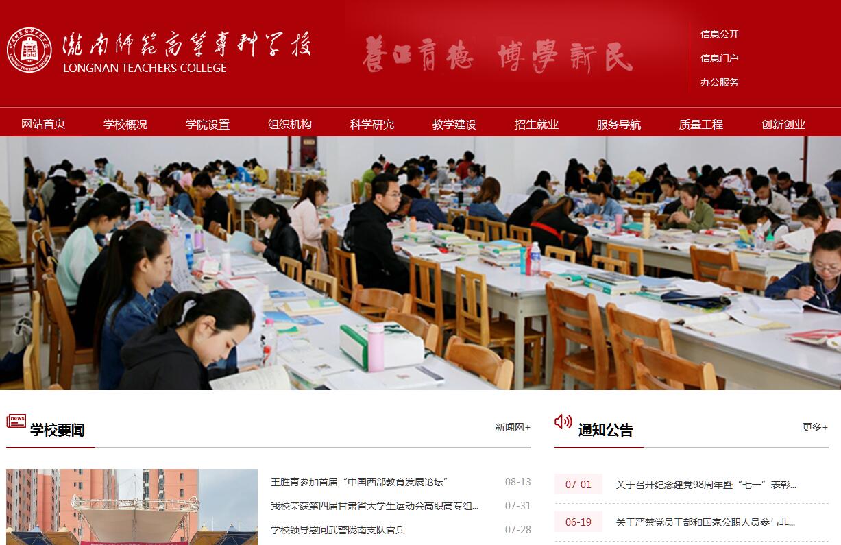 陇南师专是2003年4月经教育部批准,在原成县师范学校和礼县师范学校合并为陇南师范学校的基础上,建立的一所全日制普通高等师范专科学校。原成县师范创建于1937年,原礼县师范创建于1973年。2001年4月,两所中师合并组建了陇南师范学校。2003年4月,经教育部批准,陇南师范升格为陇南师范高等专科学校。2013年,陇南农校和成县职业中专整体并入陇南师专。2014年学校成为承担教育部卓越教师培养计划改革项目的全国唯一专科学校。2015年学校加挂陇南电子商务职业学院牌子。学校占地面积1036亩,校舍建筑总面积27.79万平方米,其中教学行政用房面积14.04万平方米,固定资产总值4.46亿元。共设有14个二级学院,15个职能部门,2个教辅机构,1所附属实验学校,5个校级科研机构。开设有41个专科专业,涉及教育学、文学、理学等7个学科门类。有各类实验实训室112个,实习实训基地133个。教学科研仪器设备总值9697.11万元。图书馆馆藏图书65万余册,各类期刊1071种。学校现有教职工582人,其中专任教师392人,专任教师中教授22人,副教授121人,研究生学历教师151人,高职比和高学历比分别为36.6%和38.4%。有全国优秀教师3人,省级教学名师2人,甘肃省特级教师1人,甘肃省优秀专家、领军人才1人,入选555创新人才工程1人,甘肃省“园丁奖”优秀教师5人,甘肃省高校青年教师成才奖2人,外籍教师3人,聘请客座教授35名,特聘教授6名。普通全日制在校生6133人。学校现有省级特色专业4个(初等教育、学前教育、语文教育、美术教育),省级精品课程4门,省级精品资源共享课1门,校级精品课程15门、重点课程36门,省级教学团队2个,荣获省级教学成果奖1项、厅级教学成果奖6项,校级教学成果奖19项,校级教学改革项目结项64项。校级教学名师20人,中青年骨干教师100人。顺利通过2008年和2013年两轮次教育部高职高专人才培养工作水平评估。近年来,学校共承担各级各类科研项目193项(其中:国家级项目3项、省(部)级项目9项、市(厅)级项目82项);在各类学术刊物上发表论文2360篇(其中:中文核心期刊203篇、CSSCI期刊83篇、SCI期刊7篇、EI期刊4篇);出版学术著作37部(其中:专著24部、合著4部、主编10部),主编参编各类教材64种(部);授权发明专利1项、外观设计专利3项;获甘肃省社科成果奖、甘肃省高校科技进步奖等各类科研奖项374项(其中:省(部)级21项、市(厅)级353项)。学校在白马藏族、早期秦文化、陇蜀古道及特色产业、资源开发等地域经济文化研究领域成果较为丰硕,形成了一定优势。学校在近80年的办学历程中,培养了3.5万名优秀的中小学教师和其他专门人才,被誉为陇南基础教育的母机和基层干部的摇篮,为甘肃经济社会发展做出了重要贡献。近年来,学校在省委、省政府、省教育厅、陇南市委、市政府的正确领导与大力支持下,坚持以科学发展观为指导,牢固把握高等教育的办学方向,坚持人才质量中心地位,立足实际,着眼未来,改革创新,夯实基础,提升内涵,取得了规模与结构、质量与效益的协调发展。