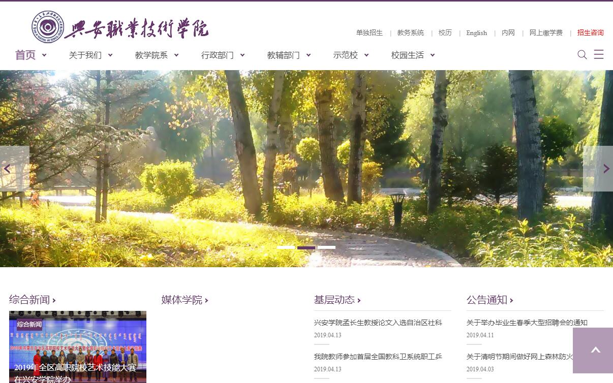 兴安职业技术学院坐落在大兴安岭南麓乌兰浩特市。乌兰浩特市是内蒙古自治区政府成立的地方,素有“内蒙古延安”之美称。兴安职业技术学院于2001年经内蒙古自治区人民政府批准成立,教育部备案的高等职业院校,是兴安盟唯一一所全日制普通高等专科学校。学院历史悠久,其前身兴安盟师范学校始建于1952年,曾是全国唯一的民族师范学校,也是全国六所示范性重点中师学校之一。学院由原兴安盟教育学院、师范学校、农牧学校、卫生学校、财经学校、交通技工学校、粮食干部培训学校七所院校整合而成,是一所集师范教育与高职教育于一身,高职教育与中职教育相衔接的高等职业院校。学院现占地面积50万平方米,建筑面积20万平方米,固定资产总额3亿元,图书馆藏书50万册,教学仪器设备总值5000万元。学院现有教职工634人,各类专业技术人员421人,其中具有正高级职称23人,副高级职称179人。学院现内设10个党政管理部门,13个教学部门和2个教辅部门。学院现有全日制在校学生6179人,其中本科生763人、专科生4846人、中专生570人。函授本、专科生646人。现有招生专业33个,涵盖教育、医药卫生、财经、电子信息、汽车、畜牧、旅游、建筑等文、理、农、工、医五大类专业领域。学院现有自治区级品牌专业3个、精品课程10门。2009年6月16日,内蒙古师范大学兴安学院成立,这是内蒙古师范大学在其诞生地乌兰浩特与兴安盟行署共建院校,开办旅游、艺术设计、计算机、学前教育4个专业本科学历教育,经过内蒙古师范大学和兴安职业技术学院的不懈努力,办学质量逐年提高,6年来,培养的本科生大部分在盟内就业。“内蒙古师范大学兴安学院”对兴安盟高等职业教育、兴安盟经济社会的发展做出了贡献。学院与国内外多家高校有着广泛的合作项目。与蒙古国东方省联合互派留学生,与俄罗斯海参崴国立经济大学、青岛北方对外教育交流学院开展了中俄联合培养本科生项目。同时与东北师范大学、吉林大学、内蒙古工业大学、内蒙古民族大学建立了长期的合作关系。学院拥有现代化的培训中心,每年承担各级各类培训任务近万人;2015年,自治区扶贫开发脱贫致富带头人培训基地在我院挂牌成立。学院组建培训专家团队,大力推行“双证书”制,职业技能鉴定中心每年组织培训3000人次考取相应的职业资格证书。学院先后成为内蒙古师范大学、吉林大学、吉林农业大学、中国人民大学、中国摄影函授学院等院校的函授基地。学院注重加强校企合作办学,形成以学生就业需要为导向,以企业为依托的校企合作、产学研结合的联合办学机制;深入贯彻“招生即招工、入校即入厂、学生即学徒、老师即师傅、教室即车间、毕业即就业”的新型学徒制教育理念;采取订单式培养模式,先后与云豪投资(北京)有限公司、碧桂园凤凰酒店、大民种业股份有限公司、阿尔山天池文化发展公司、杜美牧业养殖场等著名企业签约合作培养人才。学院办学定位:立足兴安盟、服务内蒙古,面向东北地区,培养应用技能型人才,把学院建设成为兴安盟职业教育的龙头,职业技能培训鉴定基地,成人继续教育基地和地方社会事业名片。