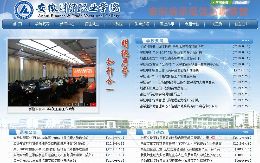 安徽财贸职业学院是安徽省人民政府批准设置、教育部备案的公办全日制普通高等学校,2008年在安徽省高等职业院校人才培养工作评估中获优秀等次,2014年被确定为全国供销合作社示范性高职院校,2015年被确定为安徽省示范性高职院校,2015年获批安徽省地方技能型高水平大学立项建设单位,2016年获批国家优质专科高等职业院校立项建设单位。学院创建于1964年,始终秉承“明德厚学、知行合一”的校训,遵循“专家治学、名师兴校、科研强校、特色扬校”的办学方针,坚持“以就业为导向、以创新为动力、以质量为根本、以特色为生命”的办学理念,把握“立足行业、面向社会、开放办学,培养财贸精英”的定位,积极为供销合作事业和区域社会经济发展服务。学院现有2个校区,占地面积500余亩,主校区坐落在合肥市大学城,设有大位会计学院、雪岩贸易学院、行知管理学院、茂荫财金学院、朱熹文旅学院、云桂信息学院、宾虹艺术学院、马克思主义学院、公共教学部等教学机构以及高职教育研究所、商业自动化研究所所长、胡雪岩研究所、供销合作经济研究所、农村电子商务研究所、新力金融研究所等研究机构,开设管、工、经、文、艺、农六大门类35个专业及专业方向,目前各类全日制在校学生13000余人。学院专任教师中教授等高级职称教师超过20%,专业课教师中“双师型”教师超过70%,青年教师中具有博士、硕士学位超过70%,其中享受国务院、省政府特殊津贴专家2人,省级教学名师6人,博士生导师1人,硕士生导师1人,省级专业带头人18人,省级教学团队10个,40位教师先后荣获省部级优秀教师、省级教坛新秀等称号。学院以市场需求为导向,在保持财经商贸类传统专业优势的基础上,大力发展新兴行业需求型、新生业态应用型、新兴技术操作型、岗位技能复合型四大类专业,积极推进产教融合、校企合作、工学结合的人才培养模式,不断提升教育教学水平与人才培养质量。2011年学院牵头组建了安徽财贸职教集团,探索促进职业教育链与产业发展链的有效对接,走出了一条职业教育向规模化、集约化、连锁化方向发展的有效路径。学院积极实行开放式办学,与新加坡、爱尔兰等多个国家的院校开展了国际交流合作项目。学院坚持科研强校的发展战略,鼓励广大教师积极开展教研科研活动,在省级教学质量与教学改革工程等各级各类研究项目中,取得了显著的成果。2014年初,学院启动“12315”教学质量提升计划,重点建设10个具有学院特色的品牌专业,开发建设20门具有样板示范效应的课程,拓展建设30个具有深度融合性质的实训基地,推荐树立10名德才兼备的教师典型,遴选培养50名核心课程的首席教师,为全面提升教育教学质量积蓄新的力量。学院注重强化学生的职业技能,获批省级校企合作实践教育基地2个,省级卓越人才教育培养计划项目2个,充分利用大学生创业实践园、三创与孵化服务中心以及50多个校内实训室、200余家校外实习实训基地,融“教、学、做”为一体,积极创建“校中厂”、“厂中校”,使课堂延伸进企业,使企业连接到课堂。学院不断推进学历教育加职业培训的培养模式,逐步实现教学内容与社会认证接轨,同时积极组织选拔优秀选手参加全国和全省各级各类专业技能竞赛取得了优异的成绩,彰显了学院培养高素质高技能人才的显著成果,被授予“全国供销合作社系统技能人才培育突出贡献奖”。学院不断创新特色素养教育的路径和载体,围绕立德树人根本任务,将社会主义核心价值观融入教育教学全过程,实现知识、能力与价值观培育的有机统一,针对学生在校的五个学期,积极推行爱心教育、形象教育、责任教育、创新教育、创业教育等“五阶段五主题”财贸素养教育活动,以职业能力为核心,以道德素养为基石,以全面发展为目标,培养学生的社会责任感、创新精神和实践能力。同时,学院坚持在弘扬徽商文化、推广徽商精神方面积极贡献一己之力,注重以徽文化和徽商精神夯实学生的人文素质基础。广大毕业生展现的爱岗敬业、吃苦耐劳、勤于钻研、善于协作的良好素质,赢得了社会各界的普遍赞誉。多年来,毕业生年终就业率均达到96%以上,学院4次荣获“安徽省普通高校毕业生就业工作先进集体”称号。学院将创新创业能力培养作为提高人才培养质量的重要举措,广泛开展创新创业教育实践,系统搭建面向全体、循序渐进、贯穿全程、夯实基础、激发个性的创新创业能力培养平台,不断改进创新创业指导服务,培育创新创业团队,营造了创新创业的良好氛围和育人环境,被安徽省教育厅授予“安徽省大学生创新创业教育示范校”称号。学院在稳步提升学历教育教学质量的同时,不断增强服务供销社事业和安徽经济社会发展的能力,为行业企业的发展积极发挥智库作用。作为首批全国供销合作社培训基地,学院广泛开展了以面向“三农”为主的各级各类培训工程项目以及非学历短期职业技能培训和岗位培训任务,实现了教育培训资源的社会共享,取得了明显的行业效益和社会效益。学院依托行业办学优势,将供销系统内企业作为学院学生的实习实训基地,学院作为企业员工的培训教育基地,学院有计划地安排专业教师到企业挂职锻炼,企业中高层管理人员和技术人员到学院挂职任教,校企合作开展“双基双挂”工程,实现了校企双赢。
