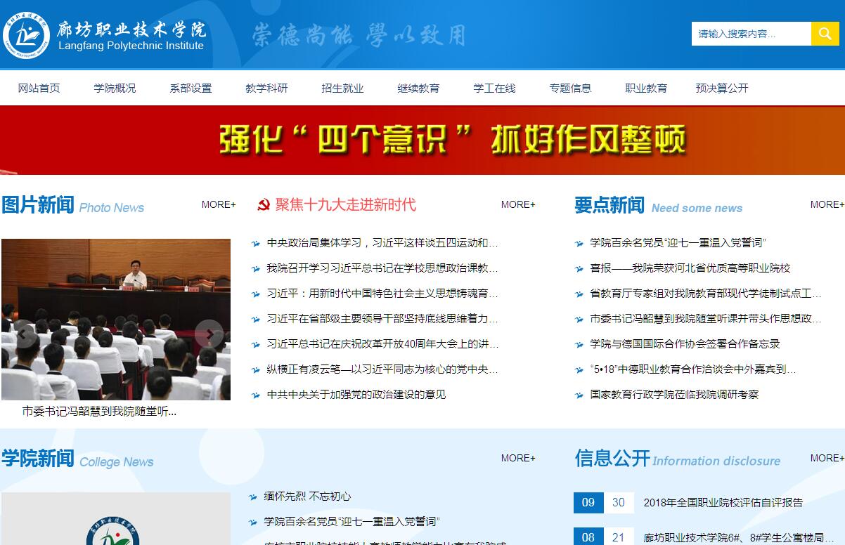 廊坊职业技术学院是一所市属公立全日制普通高等职业院校,是教育部第三批现代学徒制试点单位、团中央KAB创业俱乐部会员单位,是河北省优质高职院校建设单位、河北省内部质量保证体系建设诊断与改进工作试点建设院校、河北省现代服务业职教集团理事长单位、廊坊市职教集团理事长单位,是“一带一路”暨金砖国家技能发展国际联盟会员和“一带一路”暨金砖国家技能发展与技术创新大赛优秀竞赛基地。学院始建于1957年,2003年经河北省人民政府批准,廊坊市农业学校、廊坊市财贸学校、廊坊市工业学校三校合并,升格为廊坊职业技术学院。学院分三个校区办学,占地面积508亩,总建筑面积21万平方米,图书馆藏书48万册,建有各类实验实训室127个及6000平方米的众创空间。现设置10个党政职能部门、13个教学单位、3个教辅机构,教职工759人,在校生9000余人。学院建有43个高职专业,其中省级骨干专业1个、省级精品课程2门、校级骨干专业7个、院级精品课程69门、精品在线开放课程19门,形成了区域经济发展需要的现代服务业、现代制造业、现代农业和信息产业四大专业群。学院现有专任教师432人、副高级以上职称教师143名、“双师型”教师265名、河北省技术能手16名,拥有最美河北人、河北省模范教师、河北省“三三三”人才、市管专家等一大批杰出人才,学校教师承担科研项目、教改项目和科技攻关专项,形成一大批优秀研究成果和发明实用专利。学院积极适应全球化发展趋势,坚持开放办学,加强国际交流合作,先后与美国加州大学洛杉矶分校、加拿大约克大学、英国赫德福德大学等5个国家的8所高职院校开展交流活动,与英国赫特福德大学国际学院签订“3+1”专升硕合作协议,并与澳大利亚职业教育联盟、韩国全罗北道、美国艾奥瓦州州立大学等境外教育机构达成合作意向,有效推动了学院的国际化进程,为培养具有国际视野、通晓国际规则的技术技能人才奠定了基础。廊坊职业技术学院长期致力于服务京津冀产业发展、培养和输送高素质技术技能人才,学院立足于人才培养、服务社会、技能传承、学生发展四大职能,着眼于国家战略、社会需求、区域经济、学校实际四个层面,坚持质量立校、人才强校、创新兴校、文化优校、特色名校,创新完善人才培养体系,培育打造社会服务、校企融通、技能文化“三个品牌”,做强社会服务,做实校企融通,做亮技能文化,以品牌促融入、以融入促提升、以提升促发展,实现了办学能力、办学质量、办学水平的新跨越,综合实力、核心竞争力、社会影响力明显提升,学院逐渐彰显出“‘三品’同育,融入提升”的办学特色,并取得显著的办学成果。在2012-2016、2013-2017年中国高等教育学会发布的中国高校创新人才培养暨学科竞赛评估结果中,学院均跻身全国高职院校前300名。学院连续六年保持了省级文明单位称号,并荣获“省职业教育先进集体”“省文明校园”等30余项荣誉。近三年来,200余名师生在国际、国内、省内专业技能大赛中获奖,先后荣获“一带一路”暨金砖国家技能比赛物联网分项国际比赛一等奖”,并荣获“全国职业院校信息化教学大赛二等奖”“全国文秘速录技能大赛二等奖”“全国工业机器人技术应用技能大赛三等奖”等10多项国家级奖励,同时荣获“河北省工业机器人技术应用技能大赛一等奖”“河北省会计技能大赛团体一等奖”“河北省电子信息职业技能发动机检测与维修大赛团体一等奖”等105项省级奖励,其中省级一等奖21项。学院人才培养与服务社会的行动做法及丰硕成果,赢得了省、市领导的关注和认可,时任省委书记赵克志和现任省委书记王东峰均到学校扶贫基地视察指导,并给予高度认可;时任市委书记王晓东和现任市委书记冯韶慧也多次来校调研,对学校办学给予充分肯定和具体指导。《经济日报》《河北日报》《廊坊日报》、人民网、新华网等多家主流媒体,多次对学院典型经验做法宣传报道,学院的社会影响力和美誉度不断增强。新的历史时期,学院以习近平新时代中国特色社会主义思想为指导,认真贯彻落实党的教育方针,牢牢把握立德树人根本任务,大力加强内涵建设,积极推进教育教学改革,创新人才培养模式,深化校企合作、产教融合,努力建设高水平的人才培养体系,不断提升人才培养能力,努力书写办人民满意高职教育的“奋进之笔”。