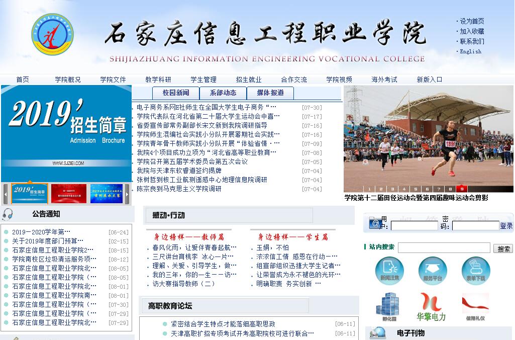 石家庄信息工程职业学院是经河北省人民政府批准、国家教育部备案、面向全国招生的国办全日制高等职业院校。学院为河北省职业与成人教育先进单位、河北省文明单位、河北省先进基层党组织、河北省思想政治工作先进单位、河北省高校首家绿色学校、河北省首家创业孵化园、全国巾帼文明岗、全国女大学生创业实践基地、全国物流教学十大创新品牌院校、中国青年政治学院高职教育研究基地、清华大学教育基金会理事单位、清华大学教学科研培训实践项目基地、河北现代物流专业人才培养基地、省会石家庄职业教育培训基地和企业人才培养基地。学院建有石家庄国家动漫产业发展基地创业孵化园。设有工信部--微软嵌入式技术联合实验室。学院为全国唯一一所同时设立雅思、托福、GRE和托业考点院校。学院位于石家庄高新技术产业开发区,分南、北两个校区,校园面积1257亩;专任教师584人,教授43人、副教授179人;在校学生12500余人。学院现有软件与传媒艺术、电子信息、商贸、管理、印刷等五大类专业群和一个直属学院(酒店管理学院),共47个招生专业,面向全国招生。现有中央财政支持重点专业2个,中央财政重点支持建设实训基地1个。有各级示范专业10个,重点专业7个,特色专业5个;各级精品课程、精品资源共享课程111门。教学用计算机4473台,校内实训基地67个,校外实践基地116个,毕业生一次性就业率保持在95%以上。学院牢固树立“德智体美全面发展的中国特色社会主义事业合格建设者和可靠接班人”的培养目标,按照“政治坚定、思想领先、技能过硬、品质优良”的办学纲领,秉承“优秀员工的摇篮,职业经理的基地”的办学理念,遵循“重技、善学、恒信、自强”的校训,弘扬“鹰一样的个人,雁一样的团队”的校风,坚持走“市场引领科研,科研带动教学,教学服务社会”的办学道路,积极推进“职员化教育、企业化教学、公司化运营”的发展模式,改革立院,创新强院,全力打造富有活力的品牌院校。
