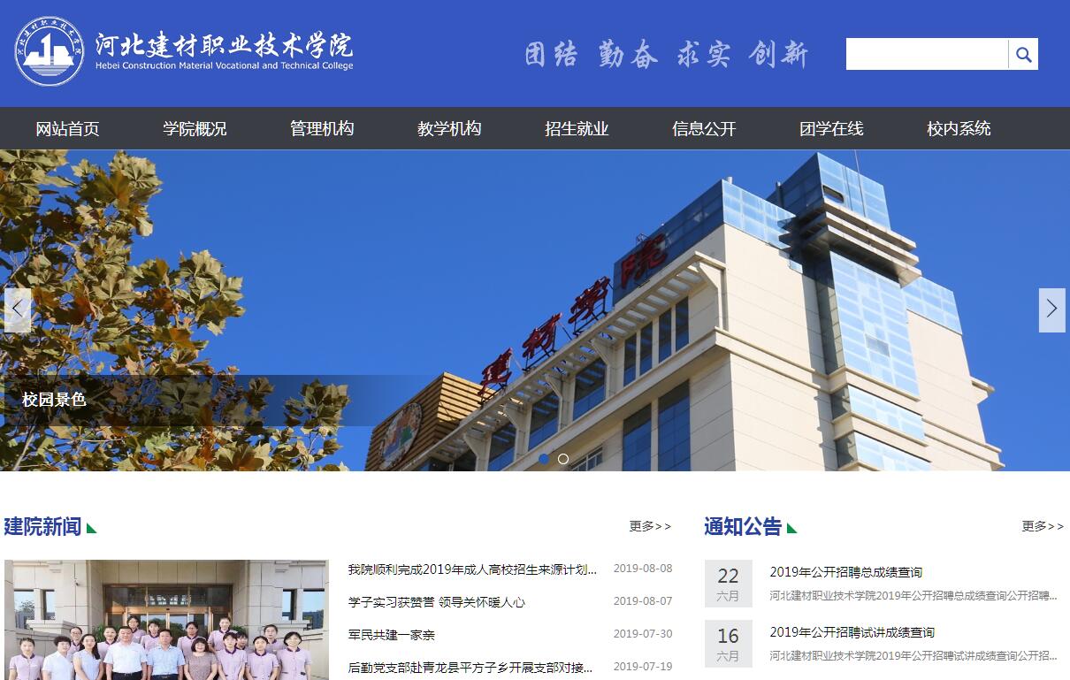 河北建材职业技术学院是经河北省人民政府批准、教育部备案的、全国唯一以“建材”命名的高等职业技术学院,被国家劳动和社会保障部评为“创新能力培训实验学校”,被中国教育科学研究院和全国高职高专协作会评为“中国十大特色高职院校”,是教育部全国建材教指委副主任单位、河北省建材职业教育集团牵头单位,是河北省建材工业协会副会长单位、河北省硅酸盐学会副理事长单位、河北省服务外包培训基地、教育部支援西部教育顾问院校。2007年,教育部高职高专院校人才培养工作水平评估优秀。2009年,被河北省人事厅授予“就业工作先进单位”。2010年,被秦皇岛市委、市政府命名为“文明单位标兵”。 2011年,被河北省教育厅授予“依法治校示范校”。2013-2014年,被河北省委、省政府授予文明单位。2016年,我院大学生创业园被河北省教育厅授予“河北省大学生创业孵化示范园”荣誉称号。2018年,获得全国第十四届“国家技能人才培育突出贡献单位”称号。学院的前身是1978年建立的国家建材总局秦皇岛玻璃工业技工学校,1985年增建国家建材局管理干部学院秦皇岛分院,1998年划转河北后与河北省建筑材料工业学校合并成立河北建材职工大学,2001年改建为河北建材职业技术学院,同年底划归河北省教育厅管理。办学层次以普通高等职业教育为主,以职业培训为新增长点,以联办远程网络教育为延伸。学院地处全国首批14个沿海开放城市之一的秦皇岛市,位于西部高校园区。南濒渤海、北依开发区、西邻奥体中心、东接世界第一能源大港——秦皇岛港,自然与人文环境俱佳,是理想的办学之地。截至目前,学院占地242亩,总建筑面积17万多平方米,资产总值1.5亿元;馆藏各类图书80万余册;有国家财政支持的建筑装饰材料检测实训基地,校内实训中心8个,实训室85个,耀华玻璃集团、冀东发展集团、深南玻等校外实训基地99个。学院设有通用工种国家职业技能鉴定所、建材行业特有工种职业技能鉴定站、电子商务职业资格鉴定站、调酒师技能鉴定站、高等教育自学考试考点、全国计算机等级考试考点、全国公共英语考试考点、全国统计专业职务秦皇岛考区、河北省创新能力定级考试考点、河北省会计从业资格考试秦皇岛考区等。学院还与韩国全州大学、韩国群山大学、韩国济州岛观光大学、马来西亚世纪大学等高校合作开办“专本连读”、“专本硕连读”国际合作班。学院现有教职工493人,其中正高级职称35人,副高级职称154人,中级职称187人;具有硕士以上学位共255人,其中具有博士学位9人。近三年累计发表学术论文近370篇、著作教材95部,承担省级以上纵向科研项目57项,承办了全国建筑材料学科研究会理事会议暨第二届研究生论坛、高职高专院校课程改革与国家级精品课案例解析研讨会、首届河北省建材行业“冀东发展杯”职业技能大赛等。学院设有材料工程系、建筑工程系、机电工程系、信息工程系、财经管理系、现代服务管理系、艺术设计系、现代玻璃学院、基础部、思想政治理论课教学部、体育教学部、继续教育中心等教学机构。开设材料工程技术、建筑工程技术、机电一体化技术、云计算、会计与审计、旅游管理、建筑装饰艺术、体育服务与管理等 55个专业,面向全国28个省、直辖市、自治区招生,现有全日制在校生近10000人。学院坚持以育人为根本,以教学为中心,以服务为宗旨,以就业为导向,走产学研结合的发展道路。立足河北,面向全国,立足建材,服务社会,培养具有敬业精神和创新精神的高素质技能型专门人才。近三年,学生在全国及河北省“挑战杯”大学生创业计划大赛、电子专业人才设计与技能大赛、大学生运动会、“冀东发展杯”职业技能大赛、“鲁班杯”造价技能竞赛、“用友杯”ERP应用技能大赛、“博飞杯”测量大赛、单片机程序设计大赛、“世纪之星”英语演讲大赛、导游大赛、大学生艺术展、辩论赛、校园歌手大赛、书画摄影比赛、中欧领导人峰会服务等活动中名列前茅。学院突出建材特色,围绕市场设置专业,积极探索和实践“建材本色、建材集团、建材品牌”办学模式,形成工学结合“4+x+1”人才培养模式和“任务驱动、项目导向”的教学模式,使人才培养工作在内涵上、质量上都有了进一步的提高,获6项省级教学成果奖,有3个省级示范专业,2个省级骨干专业,7门省级精品课,3门行业精品课。学院建有面向全国的就业信息网络,广开就业渠道,就业率稳居全省同类高校前列。30多年来,为全国各行各业培养输送了5万多名各类人才,高质量的毕业生赢得了社会和用人单位的广泛好评。学院秉承“以规模效益固基,以改革创新图强,以质量特色争优”的办学理念,以“团结、勤奋、求实、创新”为校风,以“爱岗敬业、严谨治学、从严执教、教书育人”为教风,以“刻苦学习、尊师守纪、勤勉博取、文明向上”为学风,努力创建特色鲜明的高等职业技术院校。