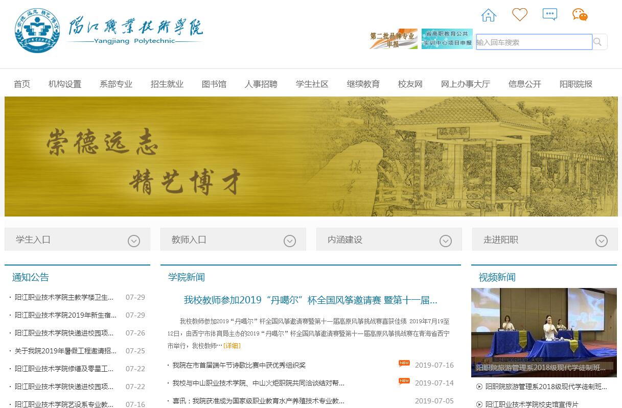 阳江职业技术学院是经广东省人民政府批准设立,国家教育部备案,阳江市人民政府举办的综合性普通高等学校。我院以“崇德远志,精艺博才”为校训,按照“立足地方,以区域发展需要的专业为主体;培养可持续发展的高技能实操型人才;建设为区域发展做出重要贡献的高等职业院校”的办学定位,办优师范、办强工科,突出优势,凝聚特色,注重实践能力的培养和人文素质的教育。培养人民满意、社会需要、具有持续竞争力的高素质技术技能人才。学院校园占地面积50多万平方米,教学仪器设备总值超亿元,学院总资产3亿多元。现有中文系、外语系、数学系、财经系、机电系、信息工程系、食品与环境工程系、艺术与设计系、旅游管理系、体育系、思政教学部和继续教育部等10系2部,开设专业39个,全日制在校生10763人,教职员工632人,专任教师484人,高级职称109人,双师型教师196 人。目前,学院共有2个省级重点专业,12个校级重点专业。形成了海洋工程、先进制造技术、蓝色旅游、师范教育等四大特色专业群。我院积极开展产学结合,工学结合,校企合作的人才培养模式,已建立校内实验实训场室119个,校外实习实训基地220个。学院与企业合作建成的先进制造业实训基地,是华南地区最先进的模具生产性实训基地,被评为省级生产性示范基地;学院投资近2000万元建成的阳江市粤德合作职业教育与培训中心,率先在全国职业教育中践行“双元制”园区化的人才培养模式;我院利用师范教育教学优势,与企业合作建成的阳江职业技术学院附属学校、附属阳东学校及直属学院的附属实验学校共有学位近8000个,已成为阳江基础教育优质学校和学院师范教育专业重要实习基地。学院教学改革、科研创新能力不断提升。 学院教职工近年获得技术专利34项,省市各类科研立项142项,发表学术论文300多篇,主编或参编教材100多本。学院连续两年获得阳江市科技进步一、二等奖,2016年获得全国商业科技进步奖一等奖。学生多次在国家、省职业技术大赛中获奖。2018年毕业生初次就业率是90.92.%。学院是广东省第一批非物质文化遗产研究基地、中华文化传承基地、广东省中小企业培训示范基地、广东省社会科学普及先进示范基地、广东省环境教育基地、广东省中小学知识产权教育试点学校、阳江市人才工作示范点、阳江市青年就业转移培训中心、阳江市教师校长培训中心、阳江市扶贫就业技能培训中心。我院还设立了8个国家级行业职业技能考试站和培训点。