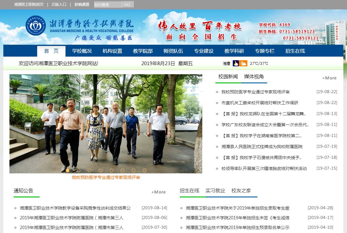 湘潭医卫职业技术学院是面向全国招生的公办全日制医卫类高职院校。学校办学历史溯源于1915年美国基督教长老会创办的广德高级护士职业学校。2001年8月,经湖南省人民政府批准,原湘潭市职工大学与湘潭市机电工业中专合并组建湘潭职业技术学院;2004年11月,原湘潭卫生学校整体并入。2015年6月,经湖南省人民政府批准,教育部备案同意,学校更名为湘潭医卫职业技术学院。百年积淀,桃李芬芳,学校为湖南医疗卫生事业的发展作出了重要贡献,受到各级领导的高度重视,赢得了社会的广泛认可。国务院原总理温家宝、原副总理李岚清等党和国家领导人亲临学校视察,对学校的办学给予了充分肯定。学校现有两个校区,校本部毗邻市委市政府,地处湘潭市政治经济文化中心;河西校区傍依风景秀美的雨湖公园。学校占地390亩,建筑面积23万平方米,固定资产5.3亿元。设有临床学院、护理学院、医学技术学院、医疗设备与管理学院、医学基础课部、公共(思政)课部和成人教育培训部等四院三部,开设了临床医学、口腔医学、护理(含康复护理方向)、助产、口腔医学技术、眼视光技术、康复治疗技术、药学、医学检验技术、医疗器械维护与管理、医疗设备应用技术、医学影像技术、卫生信息管理、老年保健与管理、会计等16个专业(方向),在校学生12000余人。学校有三所附属医院,即湘潭医卫职业技术学院附属医院(湘潭市第三人民医院)、附属中心医院(湘潭市中心医院)、附属康复医院(湘潭市第六人民医院)。其中,湘潭医卫职院附属医院是学校直属附属医院。学校师资力量雄厚,有在职在编职工650人,专兼职教师400余人,其中,教授、主任医师等正高职称29人,副教授及其他副高级职称教师221人,“双师型”教师200余人,具有研究生学历或硕士以上学位教师132人。学校附属中心医院是三甲综合医院,是湖南省全科医生规范化培训基地;附属康复医院是民政部、湖南省人民政府共建的养老示范医院;直属附属医院是二甲综合医院,是湖南省助理全科医生规范化培训基地。学校拥有中南地区一流的临床仿真实训中心等80余个现代化校内实验实训室;拥有空军总医院、解放军第309医院、中南大学湘雅医院等170余家医卫类定点实习就业基地,拥有国家职业技能鉴定所,是教育部国际护理教育基地,国家卫计委卫生行业职业技能鉴定培训基地,湖南省乡村医生培训基地,教育部、财政部认定的“优质省级职教师资培养培训基地”,湖南省助理全科医生培训结业考核考点(全省唯一考点)。同时,学校还是“世界卫生组织妇幼健康教育湖南培训中心”和“联合国开发计划署(UNDP)援助中国护理发展项目”院校,是湖南省首批高职院校内部质量保证体系诊断与改进试点院校。学校先后获得全国五四红旗团委(校团委)、全国高职高专科研工作先进单位、湖南省普通高校招生工作先进单位、湖南省普通高校毕业生就业工作“一把手工程”优秀单位、省级园林式单位、省级安全文明先进单位、连续四年(2015年-2018年)获得湖南省乡村医生本土化人才培养优秀培养学校等荣誉称号。学校护理、助产专业毕业生专业对口就业率历年均在95%以上;2018年,护理、助产专业毕业生(三年制)参加全国护士执业资格考试,通过率95%;2009年~2018年连续十年考试通过率均位居全省前列,远高于全国平均水平。近五年中,学生先后获得省级、国家级竞赛奖项55项,其中,在湖南省职业院校学生护理技能竞赛中,获得一等奖5项、二等奖5项、三等奖2项;在全国职业院校学生护理技能竞赛中,获一等奖1项、二等奖1项、三等奖2项;在全国职业院校学生检验技能大赛中,获团体一等奖1次、二等奖1次,个人一等奖1项、个人二等奖2项、个人三等奖4项;在全国职业院校学生医用电子仪器维修技能大赛中,获团体二等奖1次,个人一等奖2项、个人三等奖1项;在“挑战杯-彩虹人生”职业学校创新创效创业大赛中,获得国家二等奖1项,湖南省一等奖1项、银奖1项、铜奖2项、三等奖6项;在湖南省黄炎培职业教育奖创业规划大赛中,获得二等奖2项、三等奖6项;在“挑战杯”大学生课外学术科技作品竞赛中,获得国家三等奖1项,湖南省二等奖1项、三等奖4项;在第十一届全国舞龙舞狮锦标赛中,获得传统北狮第1名。近五年来,学校教职工公开发表论文712篇,其中核心期刊77篇;申报各级课题258项,其中国家级课题4项,省级课题53项;获各级各类成果奖117项,其中,省自然科学成果奖三等奖1项,省哲学社会科学成果奖二等奖1项、三等奖1项。在全国首届职业院校护理专业教师教学能力大赛中获得高职组个人二等奖1项、三等奖1项,学校获得团体二等奖;获得湖南省教学成果奖一等奖4项、二等奖10项、三等奖9项;获得湖南省说专业、说课、微课等竞赛一等奖4项、二等奖8项、三等奖10项。公开出版著作15部,主编、参编教材52部;开发国家专利产品21项。学校秉承“广德爱众、励能善医”的校训,坚持“立德树人、砺能就业、特色兴校”的办学理念和“校企合作、工学结合”的人才培养模式,不断深化教育教学改革,突出职业能力和职业素质的培养,与大型医院、企业、高等院校等深度融合,形成了以高职教育为主,职业培训、继续教育多元并举的办学格局,立足培养适应医疗健康事业发展需求的高素质技术技能型人才,致力于建成全国一流医卫高职院校。