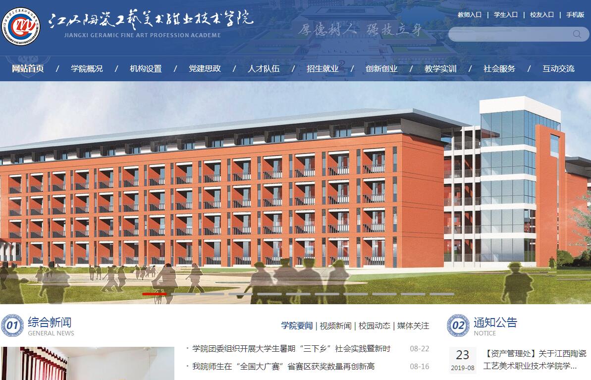 江西陶瓷工艺美术职业技术学院座落在举世闻名的千年瓷都、国家历史文化名城江西景德镇市区,毗邻世界著名的黄山、庐山、三清山、龙虎山等名山胜地。是经江西省人民政府批准、国家教育部备案的全国唯一所主要从事陶瓷材料与工艺美术类教育教学的公办全日制省示范性普通高等职业院校,隶属于江西省教育厅。学校占地面积35.7万平方米,建筑面积20万平方米,建有一流的艺术教学大楼和实验实训中心,高规格图书馆,标准化运动场所,多功能学生活动中心和空调、热水器、卫生间、盥洗间一应俱全的学生寝室,学院坚持“人文、艺术、生态”的建设理念,校园环境清幽,花香流溢,自然风光和人文气息融为一体,科教精神与艺术氛围相得益彰,校园文化和职业文化相互映衬,是莘莘学子读书求学的理想之地,也是中国陶瓷文化艺术交流及创作的重要窗口和基地。学校广大师生员工始终秉承“厚德树人、强技立身”的校训和“德育为先、能力为本、质量立校、特色兴校”的办学理念,在长期的办学实践和探索中,始终坚持以增强内涵、提高质量、促进就业、服务经济和社会发展为导向,为生产、建设、管理、服务一线培养了大批合格的高层次技术技能人才,为大批年轻人打开通向职业成功成才的大门。学校设有陶瓷艺术学院、设计艺术学院、数字艺术学院、材料与机械工程学院、经济管理学院、公共基础教学部和成教学院,开设涵盖美术与设计、材料与机械、经济与管理等门类领域的全日制专业32个。学院面向全国29个省(直辖市、自治区)招生,在校学生7000余人。学校现有教职工450人,现有教师380人,教授29人,副高以上专业技术职称75人。其中国家级教学名师1人,国务院特殊津贴获得者2人,国家级工艺美术大师5人,省级工艺美术大师5人,江西省陶瓷美术家3人,高级工艺美术师15人,教育部专业教学指导委员会委员6人,省级学科带头人1人,省级教学名师5人,省级中青年骨干教师16人,入选“江西省新世纪百千万人才工程”2人,省级教学团队3个,学校还聘请了50多名中国工艺美术大师、艺术院校名师、大型企业技术骨干和能工巧匠作为学院的兼职教师及客座教授。学校现为中国陶瓷工业协会副理事长,全国装饰材料专业委员会副会长、全国陶瓷与玻璃行业教学指导专业委员会副主任委员、中国工艺美术学会副理事长、江西工艺美术学会副理事长单位。学校现有国家级精品课程1门,省级精品资源共享课程16门,校级精品课程25门;有国家重点建设专业2个,江西省高校特色与示范专业9个。近年来完成各类科研和教改课题40多项,发表论文300多篇,出版教材、专著50多部,其中《景德镇粉彩瓷绘艺术》获省社科成果奖,《陶瓷艺术釉工艺学》、《陶瓷工业机械设备》、《粉彩瓷绘艺术》、《设计素描》等八部教材被选为国家“十一五”规划教材或全国同类高校通用教材。我院教师独著的国家“十一五”规划重点出版图书《景德镇粉彩瓷绘艺术》和《中国陶瓷艺术制作大教本》(国家“十一五”规划重点出版图书)分别荣获第一届全国高职高专艺术设计专业“精品教材奖”。学院教师主持的“高职高专陶瓷工程材料专业基于工作过程课程体系改革与建设”,“高职高专会计电算化专业基于工作过程的体系改革与建设”,“景德镇粉彩瓷绘艺术”“氧化铝陶瓷基片水系流延制备技术的研究”等教改、科研项目分别荣获江西省教学成果奖、江西省社科成果奖和江西省高等学校科技成果奖。学校按照“合作办学、合作育人、合作就业、合作发展”的发展思路,积极探索实践“订单式”、“现代学徒制”、“工作室制”、“中高职对接培养”、“联合培养应用型本科人才”,创新办学体制机制和人才培养模式。目前已与内蒙古伊东陶瓷产业园、山西应县人民政府陶瓷产业园、江西井冈山市人民政府陶瓷产业基地、江苏常州国家大型动画基地、江西余江工艺美术雕刻厂、江西南康家俱设计与制作产业园区、南昌“791艺术街区”、华为网络公司、中国移动景德镇分公司、广东欧神诺陶瓷股份有限公司、广东科达机电股份有限公司、景德镇佳洋艺术陶瓷有限公司等一批产业园区、大型企业和地方政府联合开展特色人才的“订单式”培养,在学校所有特色专业中广泛开展“现代学徒制”,并同广东新明珠等60多家国内知名企业开展了校企合作。学校设有中央财政支持职业教育实训基地2个,江西省人才培养模式创新试验区3个,江西省高等职业教育专业技能实训中心2个。建有国家职业技能鉴定所、中国陶瓷职业技能培训站、全国电子商务师鉴定培训站、全国CAD培训鉴定中心、华为网络工程师认证培训中心、ADOBE中国认证设计师江西培训中心等多个职业技能鉴定培训站(所),鉴定的工种有50多个。有集教学、培训、生产、科研为一体实训室70个,稳定的校外实训基地117个,为学生的专业技能培养和就业准入资格培训起到了重要作用。学校十分重视学生综合素质的培养,积极开展第二课堂教育活动,有20余个学生社团,校园文化生活丰富多彩。每年都要举办校园文化艺术节、专业文化成果展览、社团文化节、陶瓷文化周、动漫艺术节、公寓文化节、心理活动文化月来丰富学生业余生活。近年来,学生在全国大学生广告大赛、全国大学生环保公益招贴画设计大赛、全国大学生