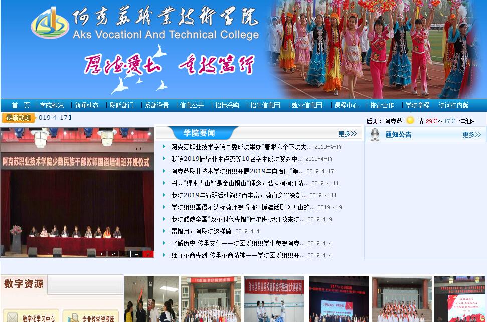 阿克苏职业技术学院于2002年由原阿克苏地区农业学校、卫生学校、农业机械学校、财贸学校、文化艺术学校、体育运动学校6所中专学校合并组建而成,是目前南疆四地州(阿克苏、喀什、和田、克州)唯一一所自治区示范综合性高等职业院校。经过十五年的并校合院建设,学院取得快速发展。学院是教育部等国家六部委指定的西北五省唯一的护理专业技能型紧缺人才示范性培养培训基地,2008年以优秀等次通过教育部高职高专人才培养工作水平评估;2012年以优秀成绩通过自治区大学生思想政治教育评估;2014年以优秀等级通过自治区示范院校项目验收;2015年以优秀成绩通过自治区大学生思想政治教育评估复验。建院以来培养各类人才40000余名,培养高职(大专)人才10000余名,目前每年向社会输送各类技能型人才2000余人,为地方和区域社会经济发展做出了重要贡献。学院设有10系1部,开设有涵盖农林牧、制造、资源开发与测绘、医药卫生、财经、土建、文化教育、电子信息、轻纺食品、旅游、环保气象与安全、体育、艺术等12大类的39个高职专业和32个中职专业。学院现有教职员工575人,专任教师445人;研究生以上学历教师82人,副高以上职称51人(其中正高4人),国家级行业名师1名,自治区级教学名师2名、教学能手2名,地区拔尖人才3名,科技英才3名,“双师”素质教师223人。学院现有自治区级特色专业5个,自治区级教学团队3个,自治区级精品课程7门,主持自治区级等各级教科研课题51项,公开发表论文320余篇,取得专利技术7项,完成各类社会培训30757人次。目前全日制在校生9134人,其中高职生4473人,中职生4661人(其中:少数民族学生占67.6%左右),高职专业面向全国11个省、市、自治区招生,高职学生25%来自阿克苏地区,35%来自南疆三地州,毕业生56.5%留在阿克苏,28.9%留在南疆,人才聚集效应明显。近年来学生共在各级各类技能大赛中获奖241人次(其中:国家级大赛获奖9人次,自治区级大赛获奖149人次)。近十年毕业生就业率保持在90%以上,学院为区域经济的发展提供有力的人才支持。
