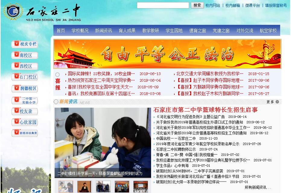 石家庄二中始建于1948年9月,是河北省实验中学,现任校长邵喜珍,特级教师,国家督学,十届、十一届、十二届全国人大代表。70年的发展历程,学校始终坚持正确的办学方向,贯彻教育方针,励精图治,锐意进取,开拓创新,形成了明确的办学理念和鲜明的办学特色,取得了令人瞩目的办学成绩和发展成就,现已发展成为一所省内闻名、全国著名的优质示范高中。经过长期的实践探索,走出了一条“体制多元,机制多样,守正出新,稳健发展”的集团化办学之路。现有学生17000余人,教职工1400人。建校以来,学校始终坚持贯彻国家的教育方针,着力培养德智体美全面发展的高素质人才。学校多次被评为“全国文明单位”、“全国教育系统先进集体”、“全国德育先进校”、“全国群众体育先进集体”、“全国先进体育传统项目学校”、“全国巾帼文明岗”、“中国西部教育顾问单位”,“河北省安全文明校园”、“河北省家长教育研究实验学校”、“河北省现代教育技术示范学校”、“河北省依法治校示范校”、“河北省教育系统先进集体”、“省级普通高中课改实验学校”等荣誉称号。校班子连续十七年被评为实绩突出领导班子。在各级领导和社会各界的长期支持关怀下,经过几代二中人的不懈努力,学校形成了独特的校园文化:“学生好,一切都好”的办学理念,“稳健发展,特色鲜明”的办学思路,“全国著名,世界一流”的办学目标,“为培养未来的政治领袖、科技精英和各行各业的领军人物奠定基础”的育人目标,“坚毅、勤奋、诚朴、健美”的八字校风,“民主平等、尊师爱生、教学相长”的师生关系,以及“以爱国主义为核心的七层次责任教育”德育特色,“自主学习、自主发展”适应教育本质要求的“双自主”教学特色,以主人翁意识为核心的、适应时代人本价值趋向的民主管理特色等。二中作为河北省实验中学,始终走在全省乃至全国基础教育改革开放的前列,发挥着示范引领作用。石家庄二中的教育教学质量、整体办学水平实现了稳健发展。继44名同学被保送北大、清华和预录取之后,2018年高考再次取得优异成绩。孙浩宁同学以实考734分荣获河北省理科第一名;师梦迪同学以实考720分荣获河北省理科第二名;聂涵雅同学以实考714分荣获河北省理科第六名;赵佳雯同学以实考702分荣获河北省文科第四名;2018年我校共有48名同学被北大、清华录取(本部28名);理科700分以上17人(本部9名) ,文科680分以上14人(本部7名);石家庄二中本部高考文科本一率100%,理科本一率99.8%;650分以上45.5%, 630分以上65.6%,600分以上90.2%。作为全国名牌高校的生源基地学校,二中每年都有大批学生升入重点大学,为高校输送了大批高素质的创新型后备人才,由于学生综合素质高,创新能力和可持续发展能力强,二中的莘莘学子称雄国内外,在各行各业为祖国的建设事业贡献着自己的智慧和力量。今天,全体二中人正以对国家、对民族未来高度负责的精神,静心教书、潜心育人,向着创建“全国著名、世界一流”现代化学校的宏伟目标阔步迈进!