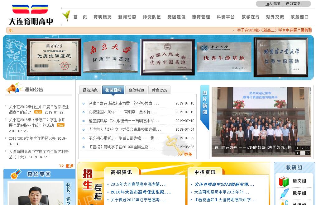 沧海横流,方显育明本色;青山逶迤,不坠凌云之志。育明人,承天下之重担,览华夏之玮奇,淡看宇宙之无穷,笑谈盈虚之有数。莘莘学子,尽成英才;兢兢名师,桃李芬芳。育明,培养了众多有识之士,造就了众多国家栋梁。育明,育桃李万载耕耘,明德艺横槊学海。大连育明高中建于一九九八年秋,是大连市教育局直属的公办的省级重点高中,省级示范高中,辽宁省特色高中实验学校,自主招生百强学校,中国百强中学。作为50多所一流高校的优秀生源基地,育明高中是求学圣地,英才摇篮。环境优雅,适于读书。学校座落在高校集中、文化气氛浓郁的大连高新技术园区,占地约48000平方米,建筑面积33000平方米,有完备的教学设施和现代化的办学条件,全面先进的数字化教学和办公平台让教学事半功倍。理念先进,定位高端。学校办学规模为36个教学班,年招生500余人。在“以人为本、追求卓越、持续发展”办学理念引领下,学校坚持“在传承中巩固,在巩固中发展,在发展中提升,在提升中超越”的办学思路,努力实现 “全省领先,全国一流,世界知名”的办学目标!在办学中尤其注重传承与创新,探索出独具育明特色的“学科专长教育的创新拔尖人才培养的新模式”,被评为“辽宁省学科专长特色高中实验学校”。班子专业,团结协作。现任校长刘春普是大连市业绩卓越的教育专家,化学特级教师,曾获得全国优秀教师、全国百名中学校长之星和大连市优秀专家等荣誉称号。党总支副书记陈德军是优秀德育工作者、大连市市直机关优秀党员;曹子谦副校长是特级教师,著名的化学金牌教练;张敬燕副校长是辽宁省师德标兵,大连市劳动模范,主管高三教学,带出六名市状元。学校领导班子成员精通高中教育教学,业务上十分成熟,具有高度责任感和团结协作精神,被誉为“专家型领导班子”。师资一流,敬业乐业。学校现有从全国各地选优来的教职工170人,其中特级教师7人、全国优秀教师7人、获得国家级荣誉称号5人,省级荣誉称号26人、市级荣誉称号70人,市级以上骨干教师及学科带头人42人,高级教师135人,构成了一支极具战斗力的队伍。育明教师的奉献精神和为“民族、理想、荣誉”而拼搏的使命情怀在学生和家长中有口皆碑且为之感动。业绩突出,成果显著。共18届毕业生,成绩非凡:2名高考省状元,9名高考市状元;共有497人升入清华、北大;3600余人考入全国排名前十位的名牌大学;10000余名毕业生全部升入高等院校;还先后有600多人就读于哈佛大学、斯坦福大学、麻省理工学院、牛津大学、剑桥大学、东京大学、新加坡国立大学等世界知名大学。五大学科竞赛,以明显的优势迅速占领了辽宁省的高地:获得国际金牌3枚,亚洲金牌3枚,进入国家集训队31人,进入辽宁省代表队220人;获得全国金牌52枚,全国银牌93枚,全国铜牌70枚,共计1000余人次获得国家一等奖以上奖项。立足全体,多元发展。高考为主、学科见长、科创领先、多元发展,面向全体、高起点、多元、立体、系列地培育精英人才。多彩的校园活动、丰富的社团组织,使人人有特长,个个显其能。校本课程、先修课程、国际化课程的开设让人人有提升,个个增本领。学科竞赛、科技创新、体育、美术、音乐和人文等特长生培养也百花齐放,满园春色。基于问题的高效课堂让课堂碰撞出智慧的火花又收获了精准的知识。学生张扬个性,追求卓越,个性特长得到充分展现。硕果累累,喜讯连连,育明高中荣获“辽宁省精神文明单位标兵”“全国精神文明建设工作先进单位”“中国社会信誉名校”“中国百强中学”“中国高中50强”“自主招生百强学校”“中国50所值得信赖的优秀高中之一”,被清华、北大、浙大、上海交大、复旦、中国科大等50余所名校确定为“优秀生源基地”。育明高中异军突起,进入了高速发展的快车道,已经创造和正在创造无数个“领先”。2016五大学科竞赛全面领先全省,跻身全国11强。在市政府的大力支持下,学校迎带来了前所未有的发展机遇,全面的升级即将开始,一所全国一流的名校将凸现在大连市。育而修身,明以敛德。阔步求学路上,育明与你相伴。育而蓄志,明以思辨,俯瞰学海玄妙,育明与你相助。