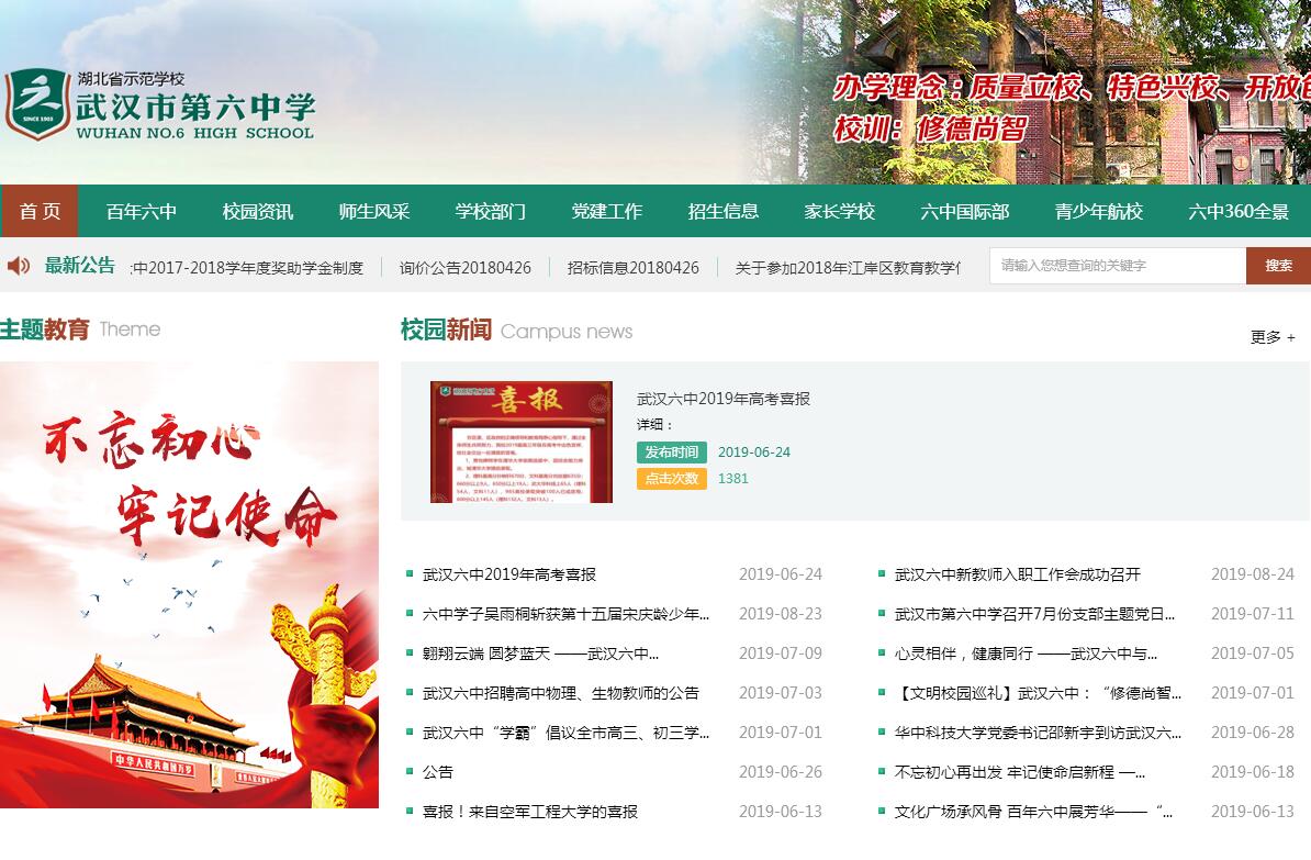武汉六中位于汉口球场路64号,其前身是1903年由德国人创办的德华学堂。近年来,学校秉承“修德尚智”的校训,遵循 “质量立校、特色兴校、开放包容、追求卓越”的办学理念,深入研究办学规律,顶层设计学校发展,不断提升办学品位、办学层次,先后被评为“全国科研兴校示范基地”、“全国百强特色学校”、“全国信息技术创新与实践活动先进单位”、“全国勤工俭学先进单位”、“全国贯彻学校体育卫生条例先进学校”、“国家体育项目传统学校”、“全国创新名校”、“中国青少年素质教育实践研究基地”、“全国中小学知识产权教育试点学校”、“全国创新名校联盟成员单位”、“宋庆龄少年儿童科技发明示范基地”、“全国首批优秀财经素养教育基地”、“全国七所中学共青团改革直接联系示范学校之一”、“湖北省示范学校”、“湖北省最佳文明单位”。教师团队精英云集。学校师资雄厚,通过“制度创新工程”、“骨干培养工程”、“师德建设工程”打造了一大批观念创新、业务精湛、甘于奉献、业绩突出的专家型教师,先后有18人被授予省特级教师称号,1人被评为武汉市首批“十大名师”,10余人享受国务院及省、市政府津贴,20余人获省、市优秀中青年专家荣誉称号,15人获国家级、省级骨干教师荣誉称号,学校共有市、区学科带头人75人,市、区优秀青年教师91人。六中教师在国家级、省、市级刊物上发表论文两千余篇,出版专著几千万字。资优学生硕果累累。近年来,武汉六中教育教学成绩斐然,涌现出一批顶尖级人才,获得国际奥林匹克竞赛金牌的夏煜、贺卓然及铜牌的段志勇,获得中国数学奥林匹克竞赛一等奖的颜公旺、获得全省文、理状元称号的黄明、余庆、丁捷,获得全市理科状元称号的牟陟、彭维方等都是六中学生的优秀代表。每年均有大量学生在全国数学、物理、化学、生物、信息学、英语、地理竞赛中获奖,连续多届楚材作文竞赛特等奖获得者均是六中学生。学校省级理科实验班高考成绩突出,多次被媒体称为湖北省“最牛班”,每年高考均有多名学生进入省、市前十名,多年以来600分以上的学生人数稳居全市前列,为国内名校清华、北大、人大、复旦等输送了大量人才,十余名学生被中科大少年班录取,累计录取人数位居全省第一。 蓝天雏鹰六中启航。2011年,经空军政治部批准,华中地区唯一的飞行员早期培训基地落户我校,对外称空军武汉飞行少年军校。2015年,在空军扩点建设中,更名为空军青少年航空学校。中国人民解放军空军政治部领导及省市相关领导隆重出席了飞行基地班揭牌仪式。在军地双方的共同努力下,几年来,空飞军校即实现了招收的学员不仅身体素质优良,而且学习成绩优异的飞跃,为打造现代化的空军,真正实现空天一体、攻防兼备的国防事业做出了积极贡献。迄今为止近70名空飞班学员光荣成为空军航空大学飞行学员,其中3人入选空军与清华大学、北京大学合作开办的飞行员班,六中空飞班的办学模式和成绩示范全军,被誉为“全国最牛空飞班”。中央电视台、人民日报、解放军报等多次作过专题报道。2017年,六中空飞班荣获“武汉市工人先锋号”称号。开放办学成绩卓著。2012年,武汉六中与著名美国教育集团合作,引入美国高中课程及其他优质国际教育资源,开设湖北省首个中美双文凭直升班,实行半军事化管理,培养具有国际视野的中国公民和具有中国情怀的世界公民。六中国际部已成为美国官方认证的湖北省公办学校中唯一的AP教学中心,是中国教育部国际交流协会中学分会湖北省唯一理事单位,也是小托福考点。国际部专任教师中,海外学历教师12人、毕业于国内985重点院校11人、硕士学历教师28人。美方学术校长毕业于美国传奇名校深泉学院、康奈尔大学,曾任SOHO中国总裁行政助理。国际化教育在六中已成为中国基础教育改革的试验田,在全国率先实施走班制、选课制,其课程涵盖茶艺国学、琴棋书画、马术、高尔夫、青年MBA等,真正实现了中西合璧。武汉六中国际部每年被世界排名前50名大学录取的学生多达80%,被世界排名前30大学录取的学生占30%,越来越多的国际部学生被英国剑桥大学、伦敦大学、美国哥伦比亚大学、麻省理工学院等英美澳加世界百强大学以高额奖学金录取,每名国际部毕业生平均获得十余份世界知名大学录取通知书,超过一半的毕业生年均获得1-3万美元奖学金,刷新了湖北学生赴美留学本科阶段获奖学金的历史。科技教育领跑全国。学校将创新教育纳入常规教学,编写《智慧之光——我们的小发明》、《发明创新与设计》、《防灾救护》等5本校本教材,指导学生编撰并出版了十余期《六中科技报》和一本《智慧之光——学生学术论文集》。带领学生走进医院、走进社区,在生活的实践中开凿智慧的火花。迄今为止我校申请国家发明专利及实用新型专利5000余项,是名符其实的“全国专利第一校”。我校学生先后获国际发明大赛金奖、银奖、铜奖40余项,参加全国青少年科技创新大赛等重大比赛,获得国家级、省级、市级奖项数千项,获奖人数均为各参赛单位之首。大量学生以科技特长生的资格参加重点高校自主招生考试,并获得降分优录政策。中国发明协会理事长、原国家科技部部长朱丽兰女士对我校科技教育成果给予高度评价,中央电视台等多
