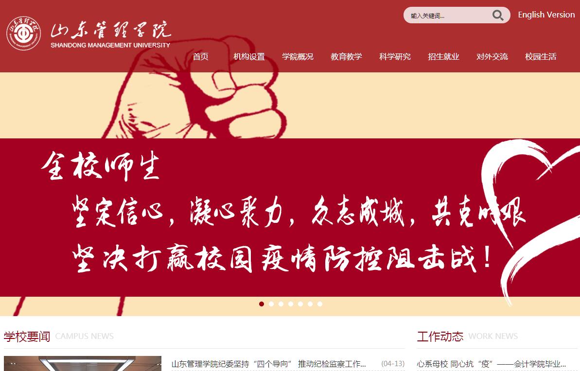 山东管理学院是经国家教育部批准设立的公办全日制普通本科高校,其前身是创建于1938年的山东省总工会干部学校,是全国唯一一所具有工会背景的省属本科高校,迄今已有80年的办学历史。现面向全国17个省份招生,全日制在校生近1.2万人。学校坐落于泉城济南,两个校区分别位于历城区和长清区,占地面积1103亩,校园芳草如茵、水清荷碧。建有功能齐全的现代化图书馆、教学楼、实验楼、学生公寓,馆藏纸质图书百万余册,拥有设备先进的工程中心、大学生就业创业孵化基地、同声传译实训室等56个校内实验实训室,在省内外有170多个实习实训基地。学校以管理学科为主体,设有劳动关系学院、工商学院、会计学院、艺术学院、信息工程学院、经贸学院、机电学院、人文学院、国际交流学院、继续教育学院等10个二级学院,23个本科招生专业、21个专科招生专业,形成了管、经、工、文、理、艺、法等多学科协调发展的学科专业体系。建有国家级教学改革试点专业1个、省级教学改革试点专业1个、省级特色专业6个、山东省高水平应用型立项培育专业群1个、省级教学团队4个、省级精品课程28门、省级成人特色课程4门。学校拥有一支师德高尚、业务精湛的师资队伍,高级专业技术职务教师达30%以上,专任教师硕博比例达60%以上,有山东省黄大年式教师团队1个、新世纪“百千万人才工程”国家级人选、山东省有突出贡献的中青年专家1人,省级优秀教师、省级教学名师5人,还建有一支以专家学者、劳动模范、技术能手为代表的兼职教师队伍。近五年来,建设“十三五”山东省高等学校科研创新平台3个,获批国家级、省部级及厅级课题300多项,公开发表学术论文千余篇,科研获奖100多项。学校实行开放式国际化办学的发展战略,与美国、英国、法国、加拿大、德国、澳大利亚等国家和地区的21所高校在师生交流、科研合作、合作办学、联合培养等方面建立了多层次、多形式的交流合作关系,每年选派优秀教师到国外孔子学院任教,选派优秀学生赴海外交流或本科就读,培养了一批具有国际化视野的复合型人才。学校始终坚持社会主义办学方向,落实立德树人根本任务,坚持“依托工会,突出特色,为经济社会和谐发展服务”的办学方针,秉承立业教育为基础,立人教育为根本的“双立教育”办学理念,锐意改革,勇于创新,为经济社会和工会事业发展培养了大批专门人才,2017年毕业生综合就业率达到97.41%。先后被评为“山东省高校毕业生就业工作先进单位”“山东省德育工作优秀高校”“山东省高校人才培养工作水平评估优秀单位”“全国学校艺术教育先进单位”。学校传承中华优秀传统文化,服务经济社会和谐发展,是国家级非物质文化遗产项目传承基地、山东省非物质文化遗产传承人群研修研习培训基地、山东省古琴传承基地、山东地方戏传承基地、山东省社会科学普及教育基地。学校还是全国计算机、注册税务师、电子商务师、秘书、公关员、企业人力资源管理师等考试、培训基地。学校作为山东省工会干部培训基地和工会理论研究基地,建校以来,共培训工会干部20多万人,多项工会理论研究成果为省总工会决策提供了重要参考,主办的《山东工会论坛》是国内外公开发行的中国工运类核心期刊,是中国政治类专业期刊、华东地区优秀期刊、山东省优秀期刊,在工运界具有较高的影响力。先后被评为“山东省工会女职工培训示范学校”“全国工会女职工培训示范学校”“全国工会干部教育培训示范校”“全国职工教育培训优秀示范点”,被授予“富民兴鲁劳动奖状”。“十三五”以来,学校牢固树立服务工会、依托工会、融入工会理念,逐步搭建了工会干部培训、工会理论研究、产业工人素质提升和工会专业人才培养的“四位一体”发展格局。新的历史起点上,学校正通过全面深化综合改革,实施内涵发展、特色发展、创新发展、开放发展、和谐发展的五大发展战略,努力把学校建设成以管理学科为主、多学科协调发展,学生规模适度、教师队伍精干,工会理论研究国内领先、国际知名,办学效益显著、办学特色明显,人际关系和谐、工作学习生活条件舒适的高水平应用型本科院校,并向着特色鲜明的高水平应用型大学目标迈进。